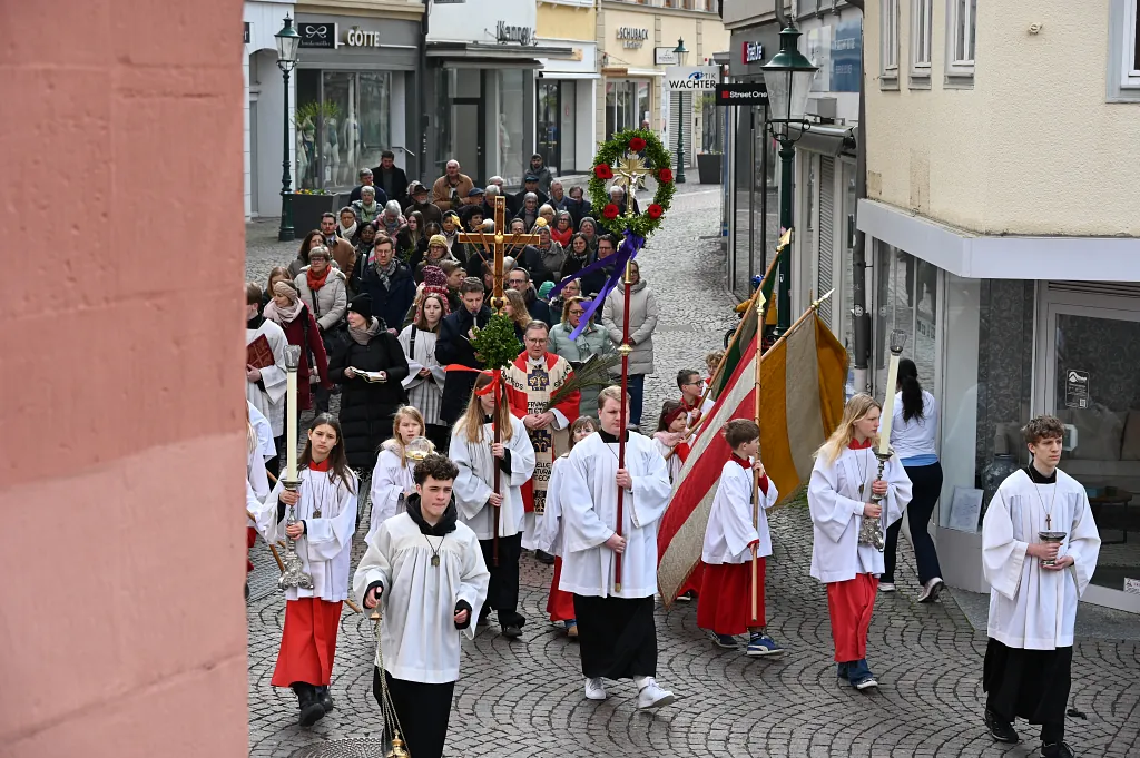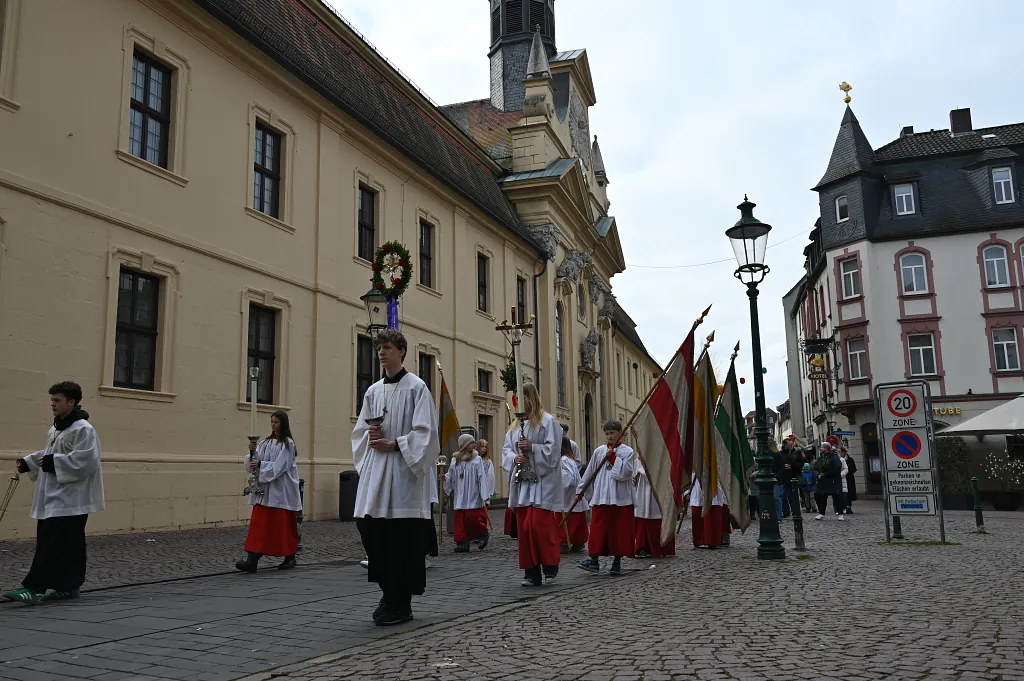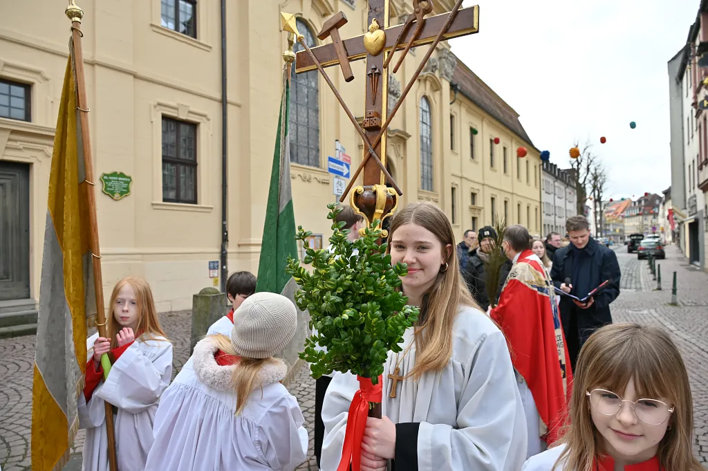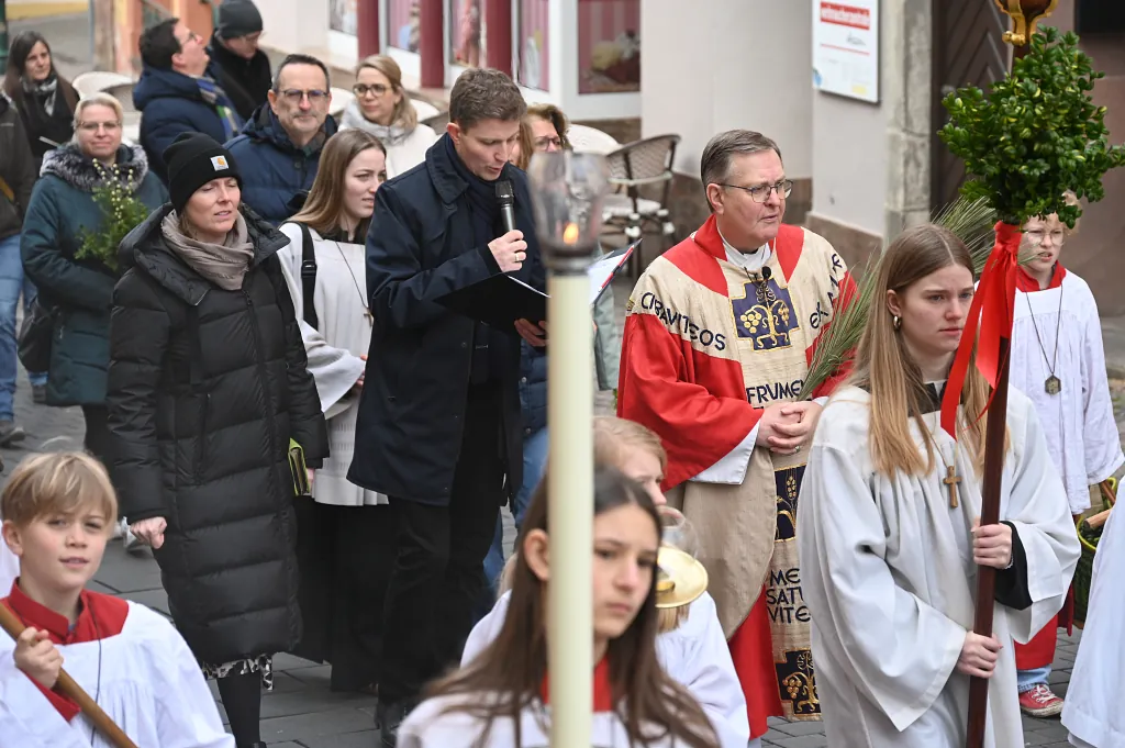Beginn der Feierlichkeiten zum Palmsonntag mit Weihe der Palmsträuße in der Heilig-Geist-Kirche. Anschließend Prozession durch die Innenstadt zur Stadtpfarrkirche. Dort ein feierliches Pfarramt was musikalisch vom Stadtpfarrchor gestaltet wurde. Anschließend verkauften an den Kirchentüren die Messdiener bunte Eier.