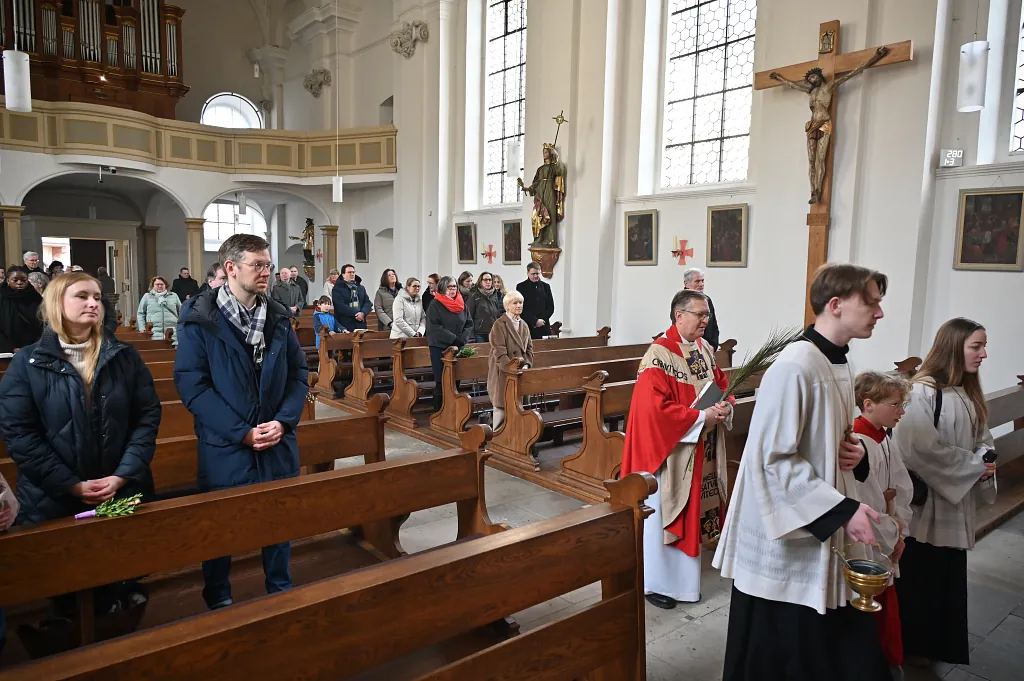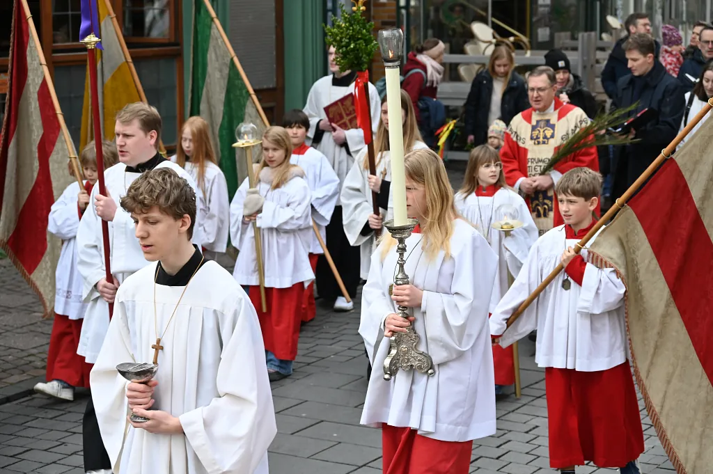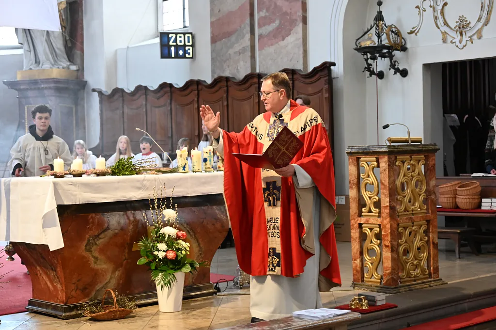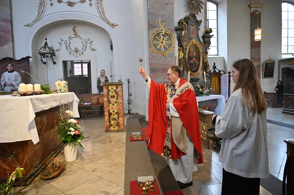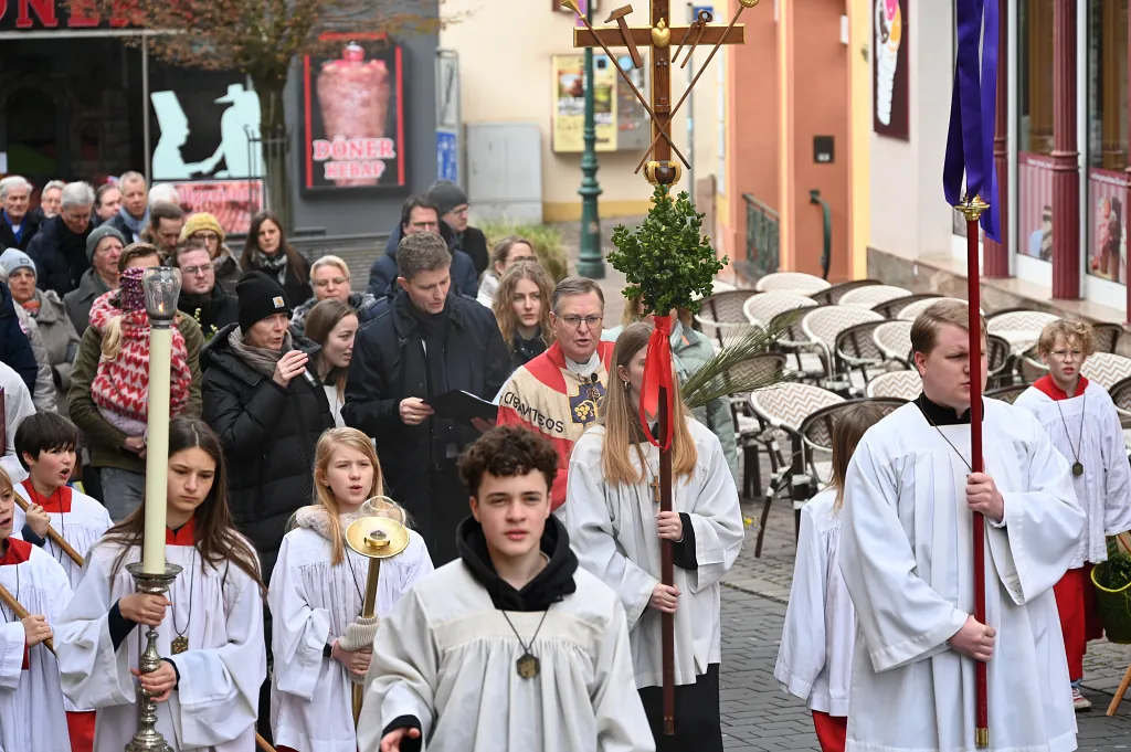 Beginn der Feierlichkeiten zum Palmsonntag mit Weihe der Palmsträuße in der Heilig-Geist-Kirche. Anschließend Prozession durch die Innenstadt zur Stadtpfarrkirche. Dort ein feierliches Pfarramt was musikalisch vom Stadtpfarrchor gestaltet wurde. Anschließend verkauften an den Kirchentüren die Messdiener bunte Eier.