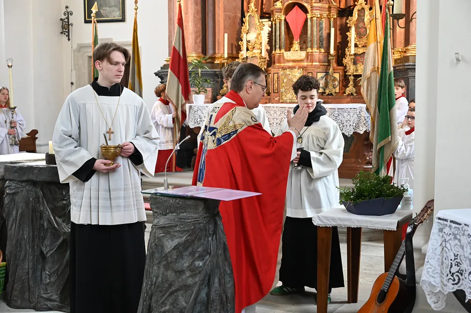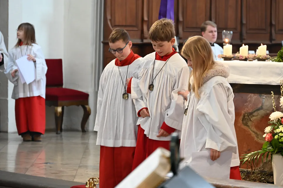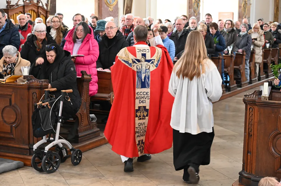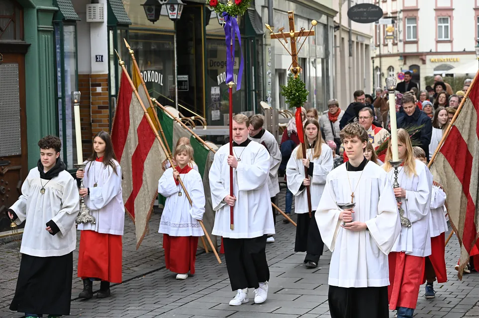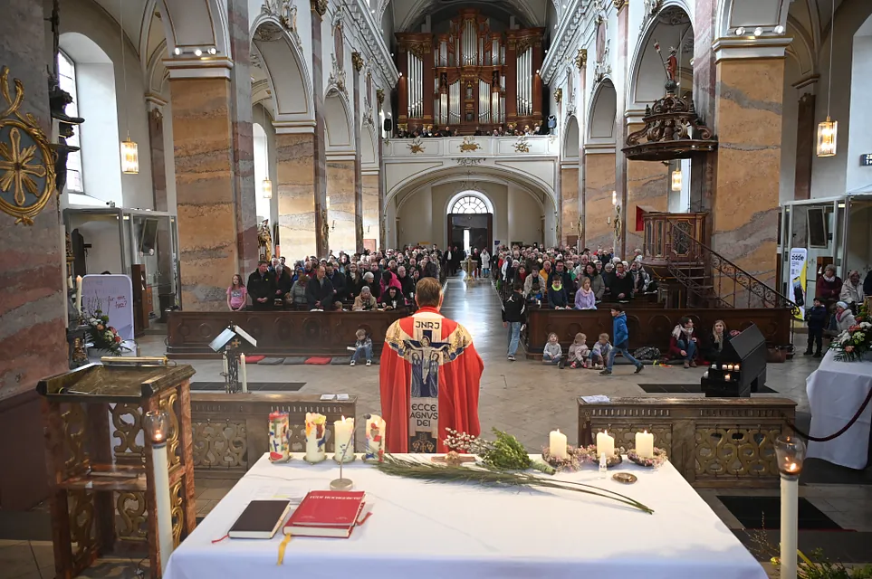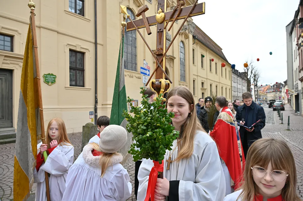 Heute wurde mit der Feier des Palmsonntag die Heilige Woche eröffnet. Wir erinnern uns, dass Jesus in Jerusalem einzieht und die Menschen ihm zujubeln: "Hosanna dem Sohne David!" Wenige Tage später rufen sie: "Ans Kreuz mit ihm!" Die jüngsten der Messdiener gestalteten ein Passionsspiel der Stadtpfarrchor gestaltete musikalisch den Gottesdienst.