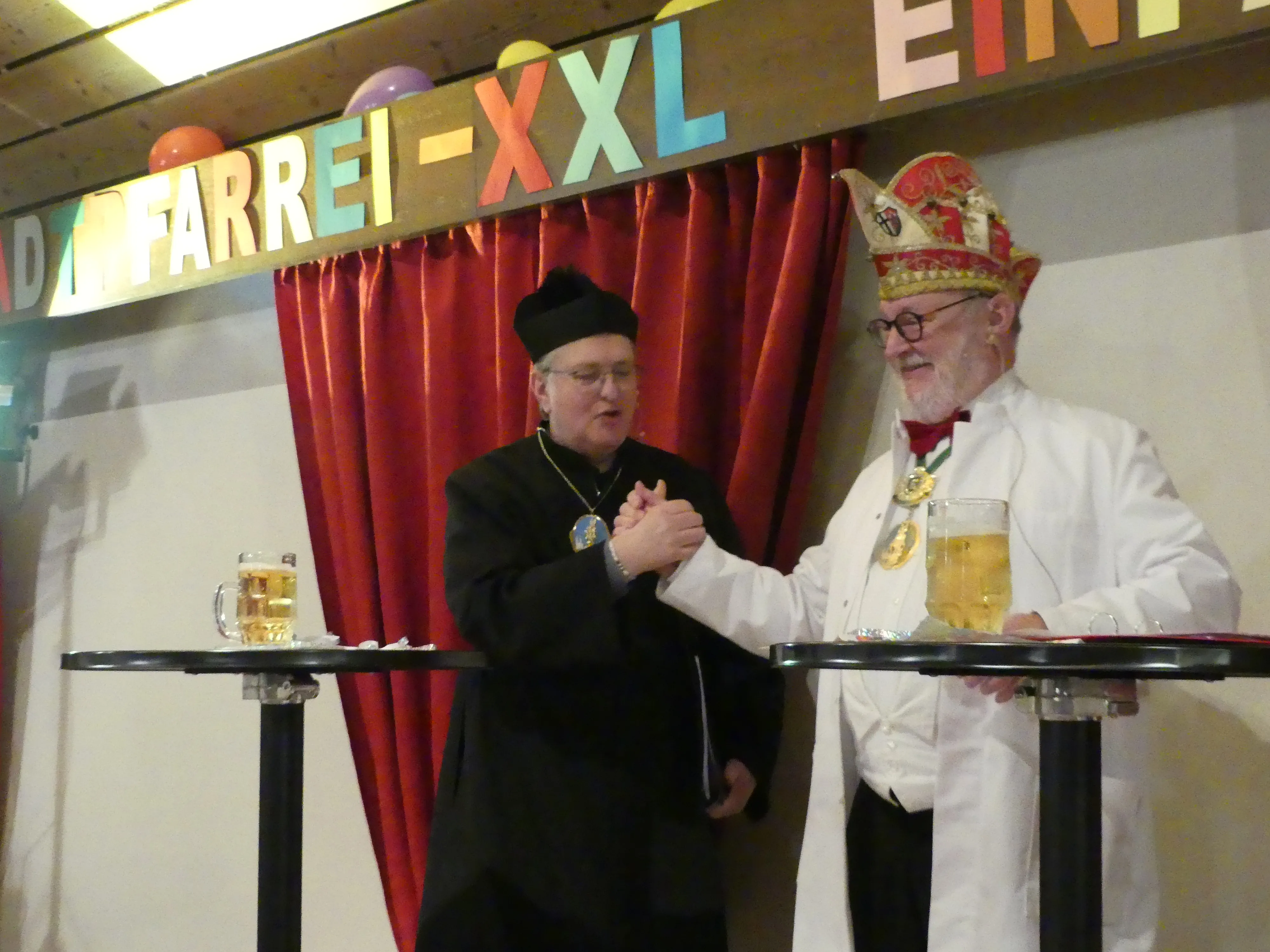 Getreu dem diesjährigen Motto „Stadtpfarrei XXL – einfach sensationell“ feierten die Narren der Stadtpfarrei Fulda Ihre diesjährige Pfarrfastnacht im vollbesetzten Pfarrzentrum am Dom. Neben dem Stargast „Bauer Habersack“ alias Michael Bleuel mit seinem „Rhöner Songcontest“, gab es Auftritte von Protokoller „Doc von Foll“ Dr. Frank Steinhauer und seinem Gegenpart, dem „Poar von Foll“ Stadtpfarrer Stefan Buß, dem „Sandmännchen“ Aki Elm und ein Sketch von Thomas Hering. Darüber hinaus trugen die Stadtministranten, das Pastorale Team und die Floppers (Gesangseinlage von Michael Brand und Henning Jöhnke mit Johannes Haubs am Klavier u. Martin Matl am Schlagzeug) zum humoristischen Programm bei. Aufgelockert wurde der Abend durch Einmärsche der Brunnenzeche, des Vorstädtischen Bürgervereins, der FKG mit Prinzessin Isabell und Gefolge und den Aschenberger Wolkenkratzern.