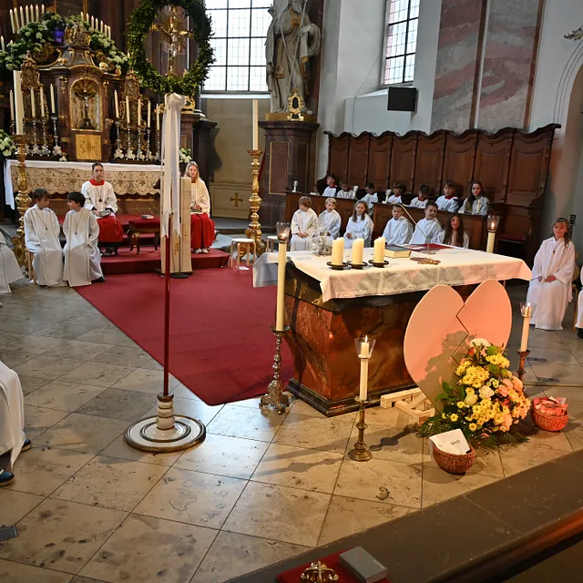 Am 12. April – dem traditionellen Weißen Sonntag - durften 25 Kinder unserer Stadtpfarrei ihre Erstkommunion in der Stadtpfarrkirche feiern. Der feierliche Gottesdienst und die Vorbereitung standen unter dem Motto „Ihr seid meine Freunde“. In den vergangenen Monaten durften die Kinder durch Gruppenstunden, Weggottesdienste und vielfältige Aktionen entdecken, dass Jesus ihnen nahe ist und sie als guter Freund begleitet. Musikalisch wurde der Gottesdienst vom Kinder- und Jugendchor unter der Leitung von Johannes Haups und Organist Jochen Rill.