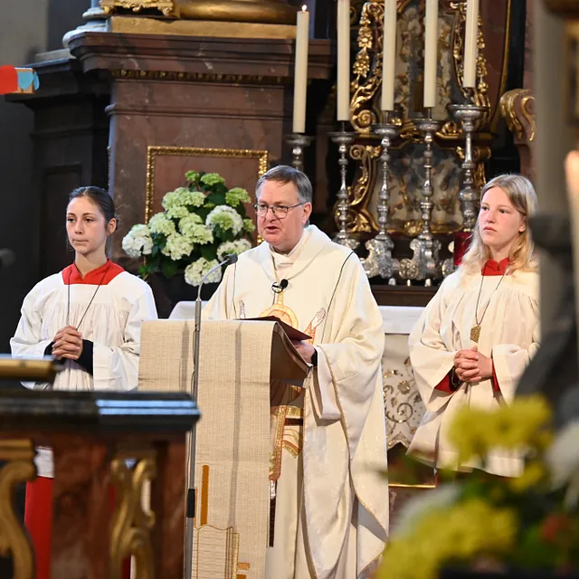 Stadtpfarrer Stefan Buß griff das Bild der Raupe auf, die sich im Kokon verpuppt und schliesslich zum wunderbaren Schmetterling wird. Darin steckt das Geheimnis von Ostern. Leben - Sterben - Auferstehung. Neben Organist Jochen Rill, gestaltete das Quartett der Stadtpfarrei den Gottesdienst. Dontaus Matl wurde als Obermessdiener verabschiedet, Franzi Lang und Lukas Zürcher als neue Verantwortlichen begrüßt.