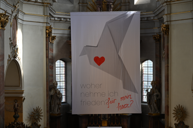 Das Fastentuch 2026 in der Stadtpfarrkirche Fulda knüpft bewusst an ein Motiv an, das bereits im Jahr 2022 viele Menschen angesprochen und bewegt hat. Damals stand die Frage „Woher nehme ich Frieden?“ im Raum – entstanden vor dem Hintergrund des neu ausgebrochenen Krieges in der Ukraine. Diese Frage war Ausdruck von Fassungslosigkeit, Angst und der Suche nach Hoffnung in einer Zeit, in der ein Krieg mitten in Europa wieder Realität geworden war.