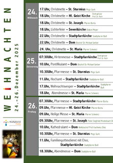 Gott, unser Vater, wir sind deine Kirche hier am Ort in der Innenstadt von Fulda. Wir sind als dein Volk, deine Gemeinde unterwegs in eine neue Zeit. Wir haben unsere Vergangenheit mit Licht und Dunkel, doch du warst und bist immer unser Gott.