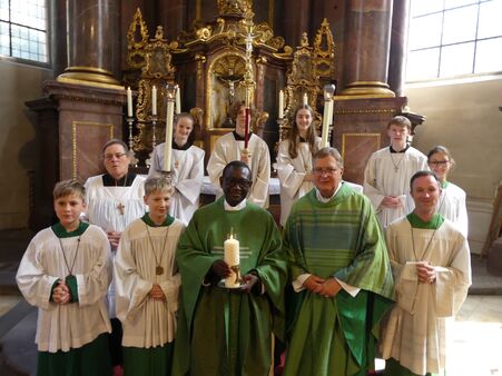 Gottesdienst mit Stadtpfarrer Stefan Buß. Ihm assistierten der indische Priester Suresh Jesudoss und Diakon Rudi Bohl. Musikalisch wurde der Gottesdienst und die Prozession vom Stadtpfarrchor, dem Kinder- und Jugendchor, der Bläsergruppe und dem Musikverein Niesig gestaltet. Nach der Prozession gab es ein frohes Miteiannder am Pfarrzentrum am Dom.
