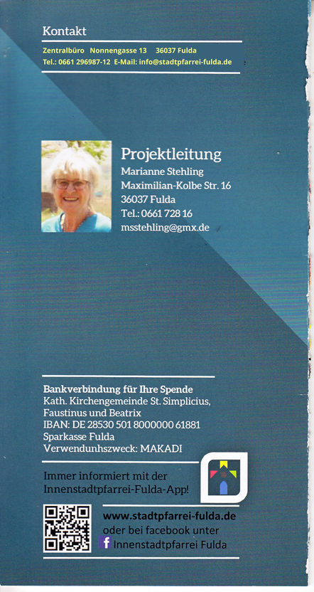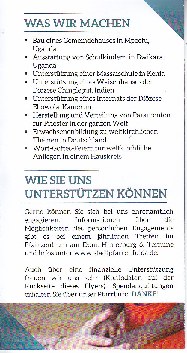 Auch über eine finanzielle Unterstützung freuen wir uns sehr (Kontodaten auf der Rückseite dieses Flyers). Spendenquittungen erhalten Sie über unser Pfarrbüro. DANKE!