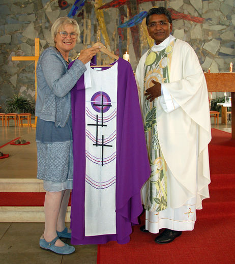 2 Messgewänder und einen Geldbetrag überreichte Marianne Stehling im Namen des Arbeitskreises MAKADI Professor AMBROSE PITCHAIMUTHU, aus der Diözese Chingleput /Indien, anlässlich seines Silbernen Priesterjubiläums, das er als Urlaubsvertretung in Petersberg in einem Gottesdienst mit der Gemeinde feierte. "Die Verbindung mit Pfarrer Ambros besteht schon viele Jahre.Damals, als er noch