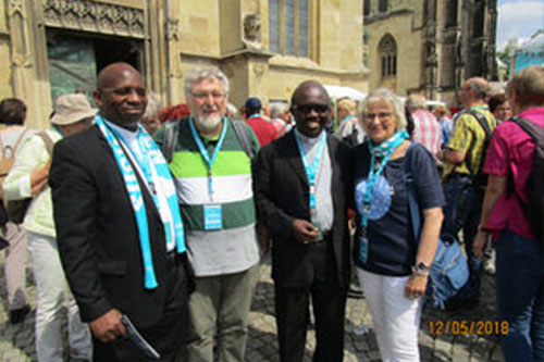 Ein freudiges Wiedersehn mit Bischof Vincent Kirabo am Katholikentag in Münster. Von Links Pastor Dr. Rogers Biriija Mbabaali, Sturmius Stehling, Bischof von Hoima, Marianne Stehling
