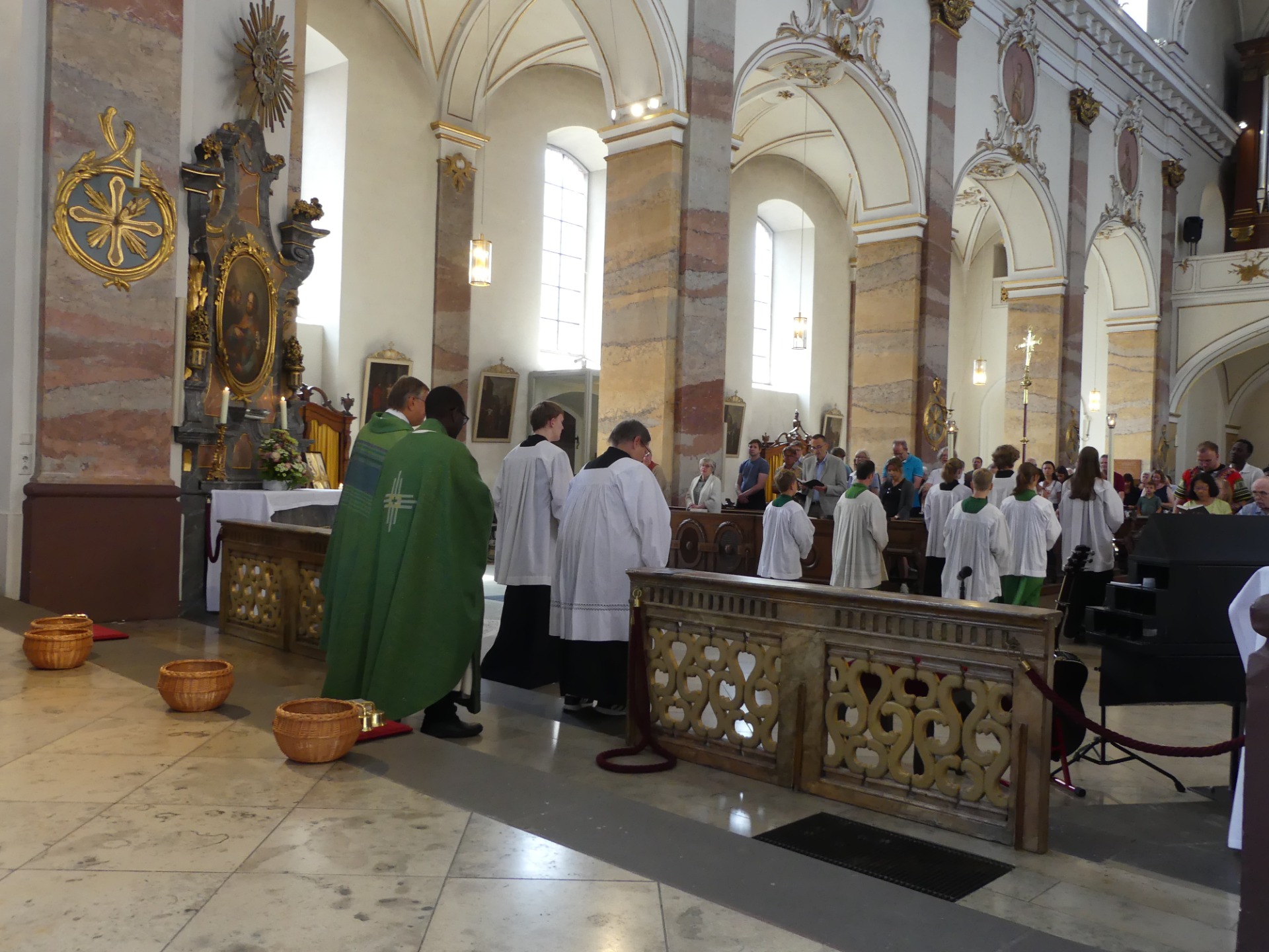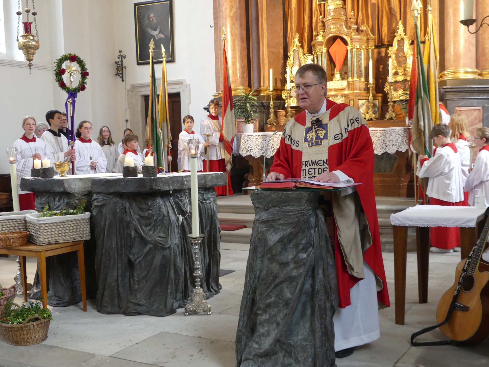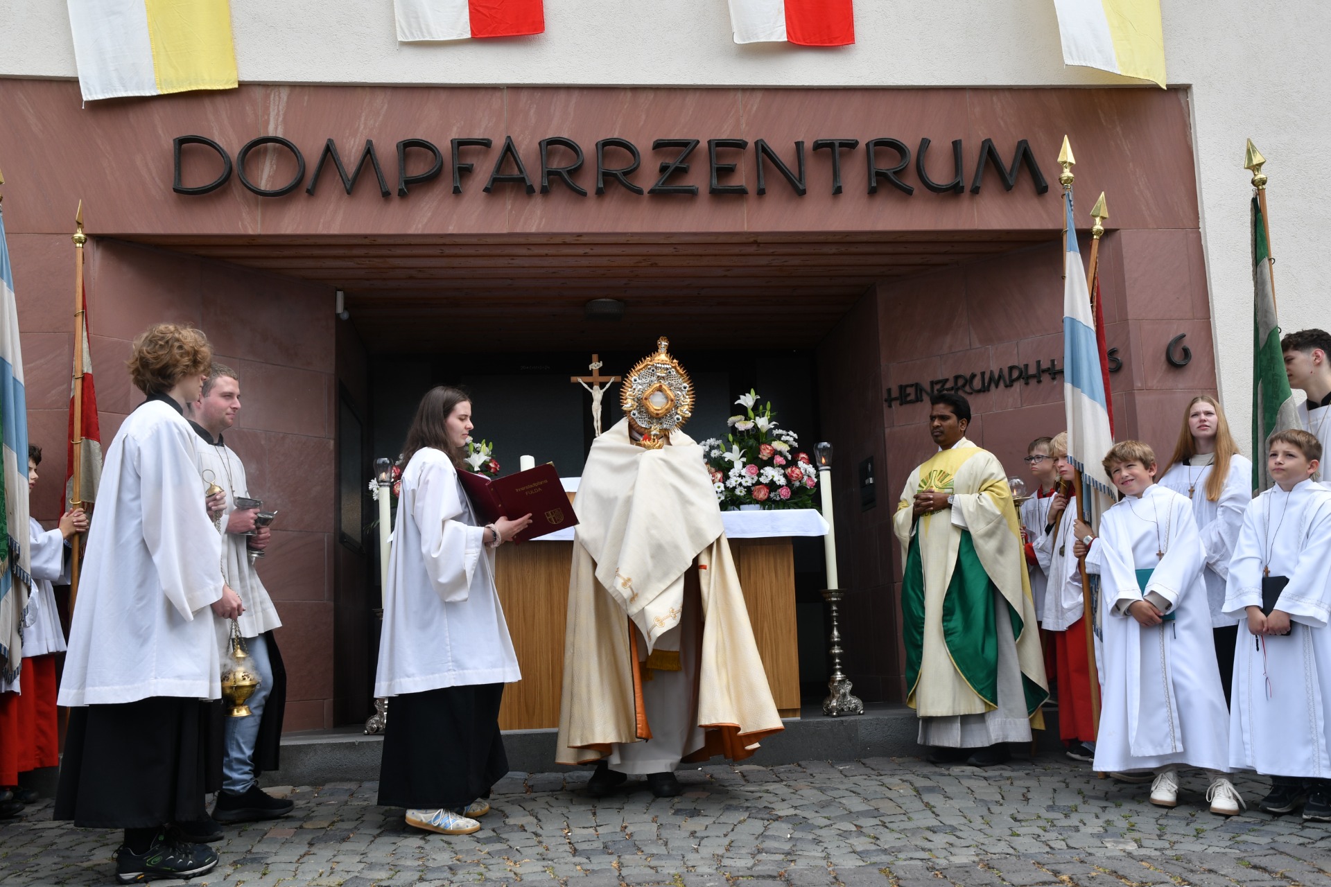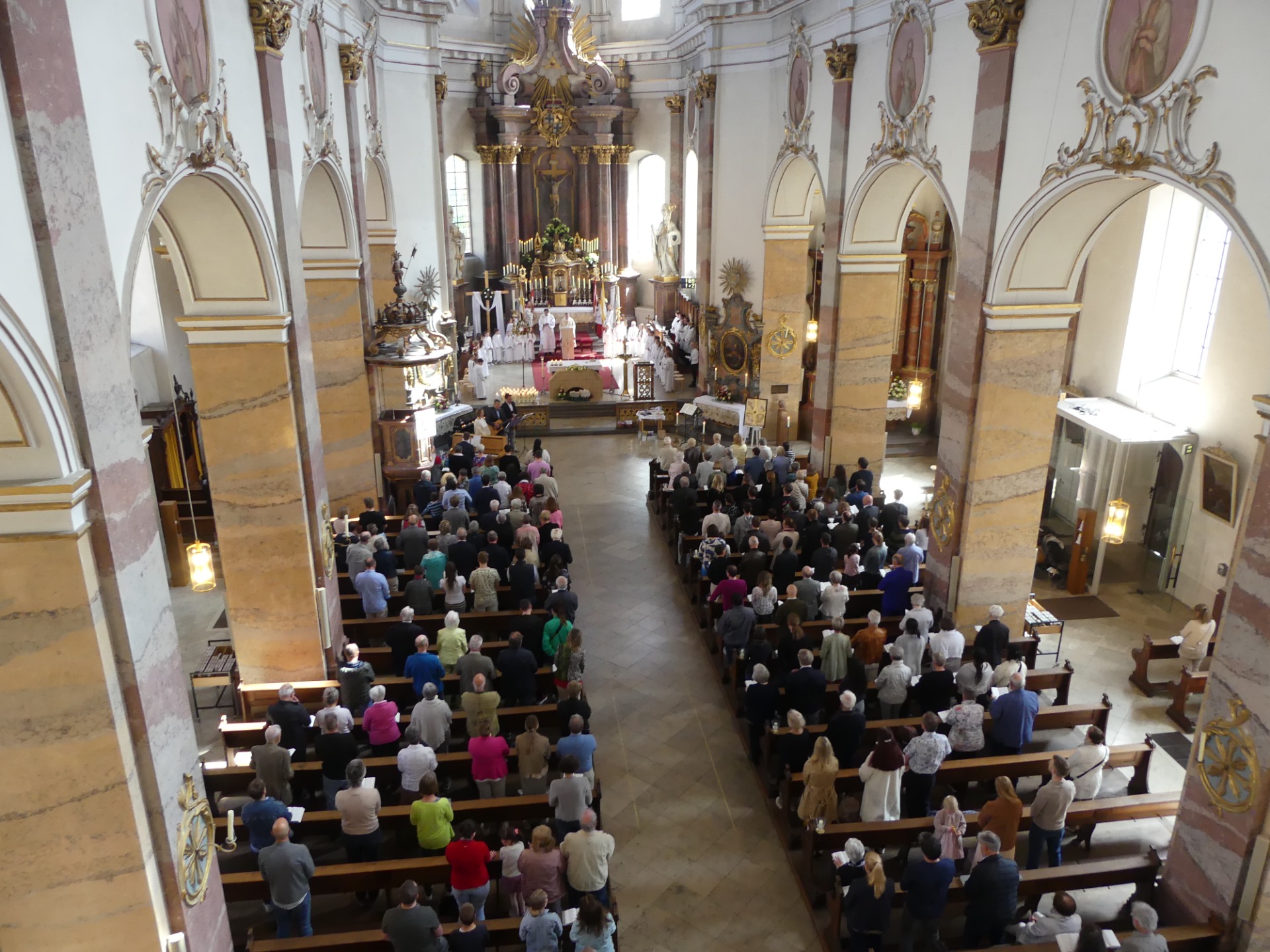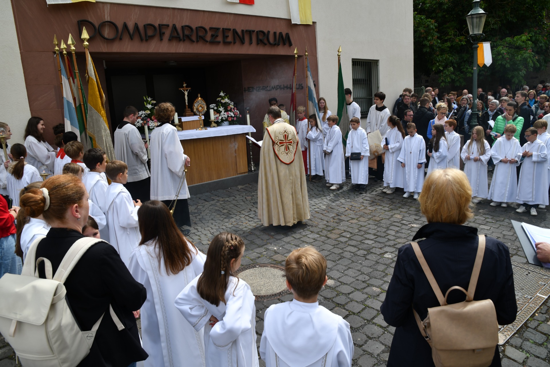 Gottesdienst mit Stadtpfarrer Stefan Buß. Ihm assistierten der indische Priester Suresh Jesudoss und Diakon Rudi Bohl. Musikalisch wurde der Gottesdienst und die Prozession vom Stadtpfarrchor, dem Kinder- und Jugendchor, der Bläsergruppe und dem Musikverein Niesig gestaltet. Nach der Prozession gab es ein frohes Miteiannder am Pfarrzentrum am Dom.