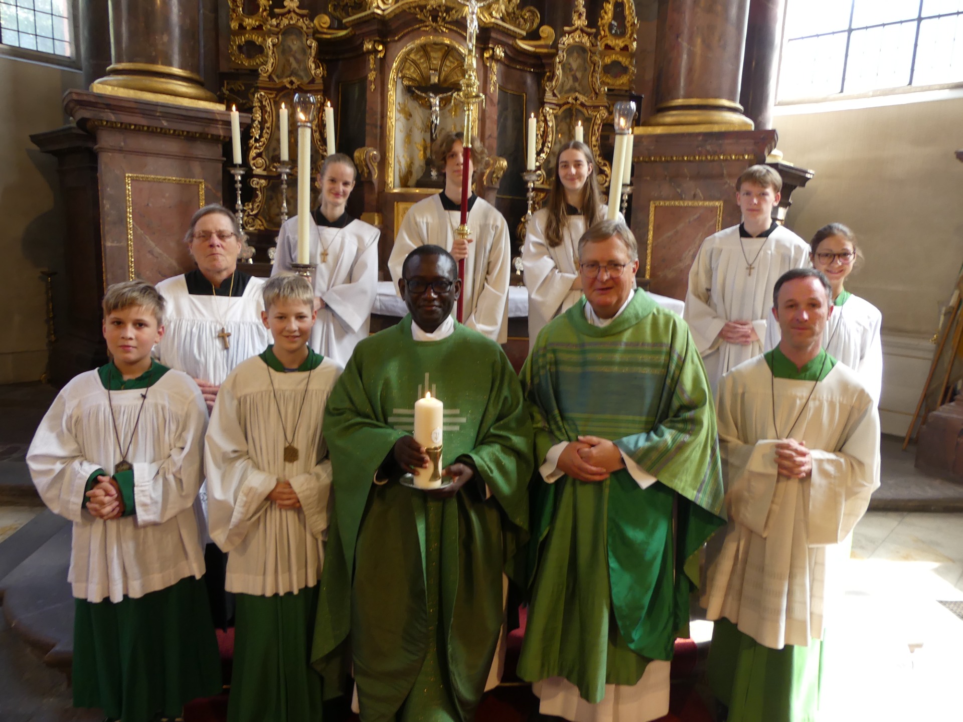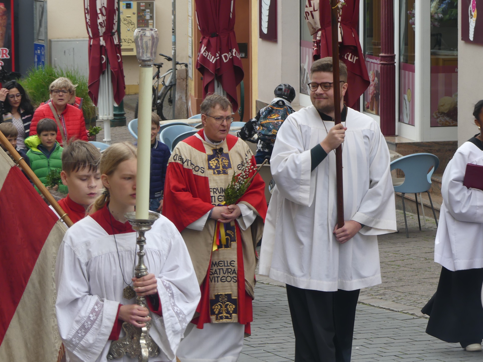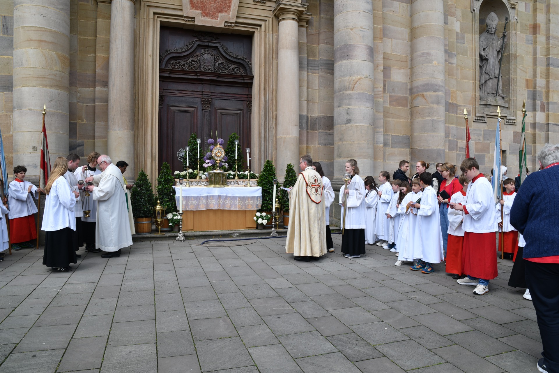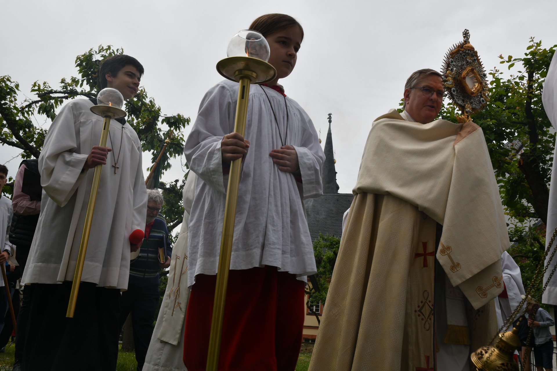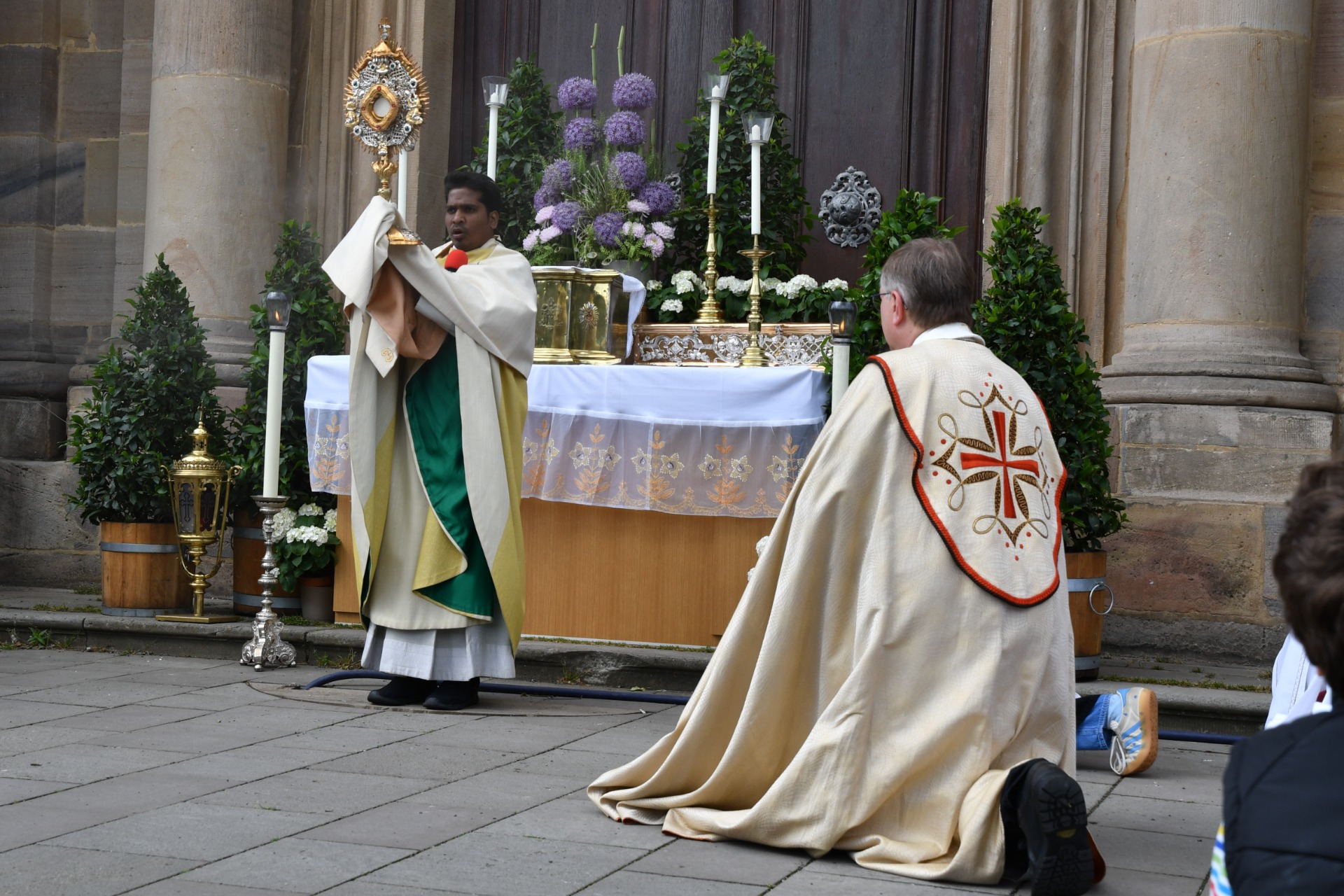 Gottesdienst mit Stadtpfarrer Stefan Buß. Ihm assistierten der indische Priester Suresh Jesudoss und Diakon Rudi Bohl. Musikalisch wurde der Gottesdienst und die Prozession vom Stadtpfarrchor, dem Kinder- und Jugendchor, der Bläsergruppe und dem Musikverein Niesig gestaltet. Nach der Prozession gab es ein frohes Miteiannder am Pfarrzentrum am Dom.