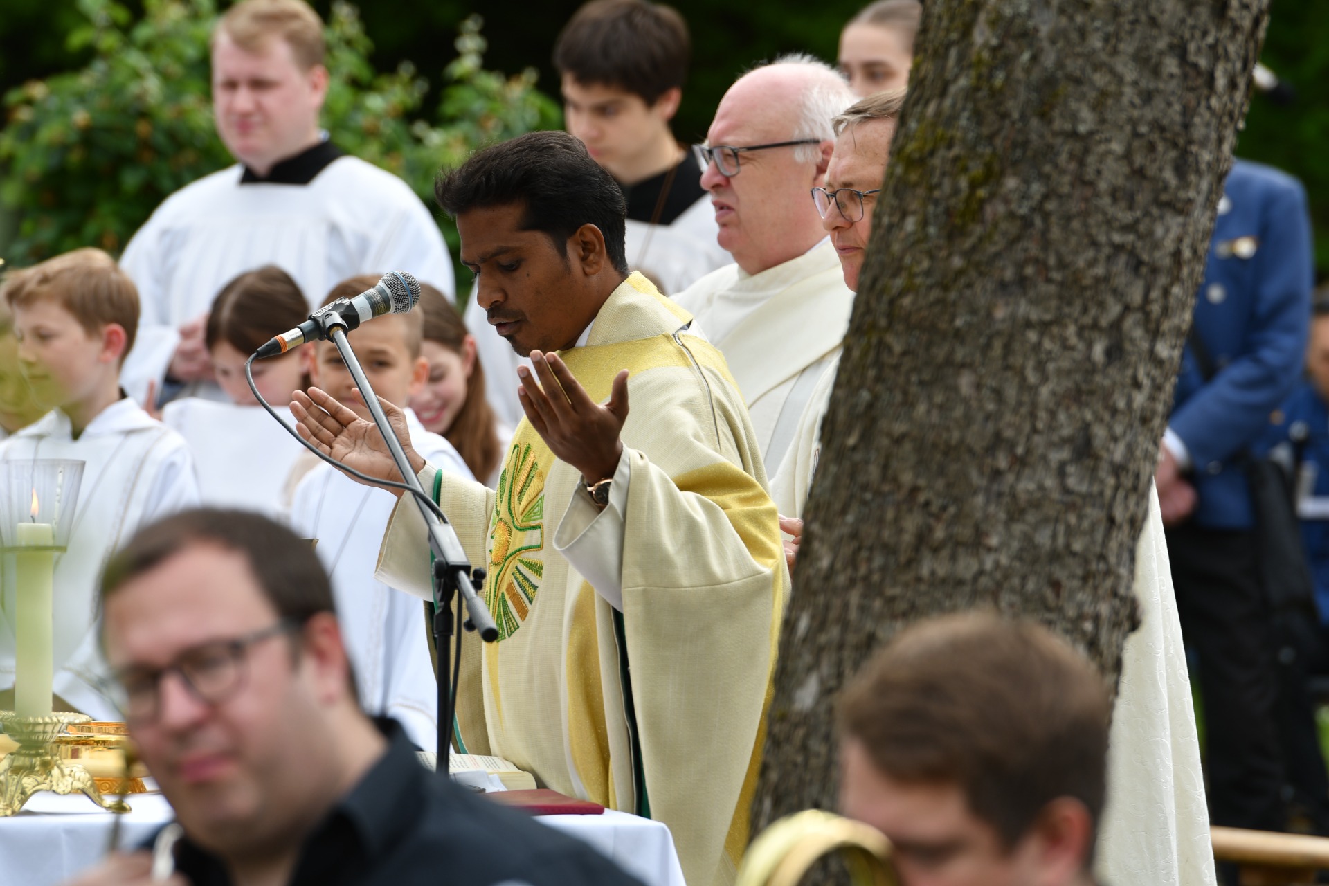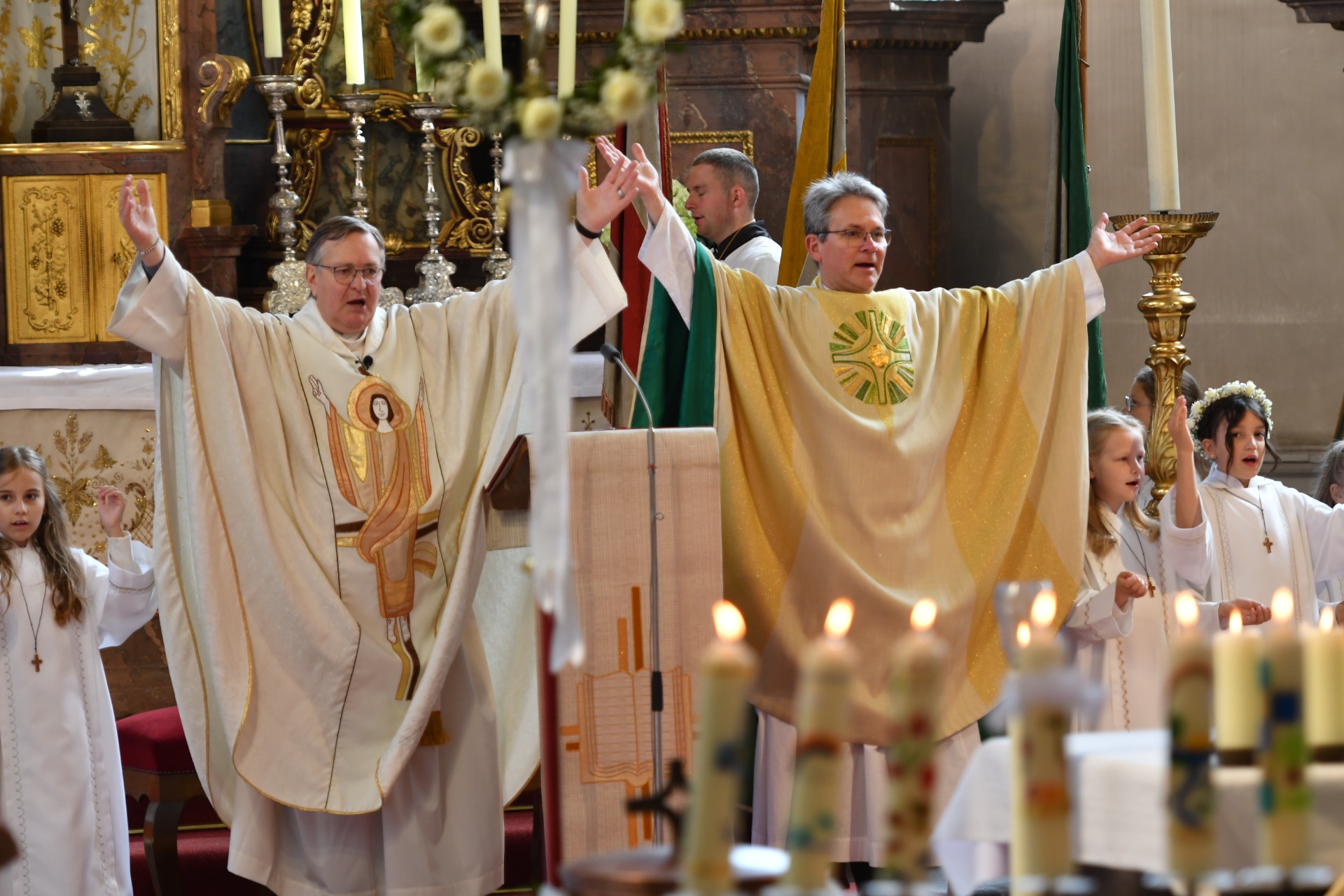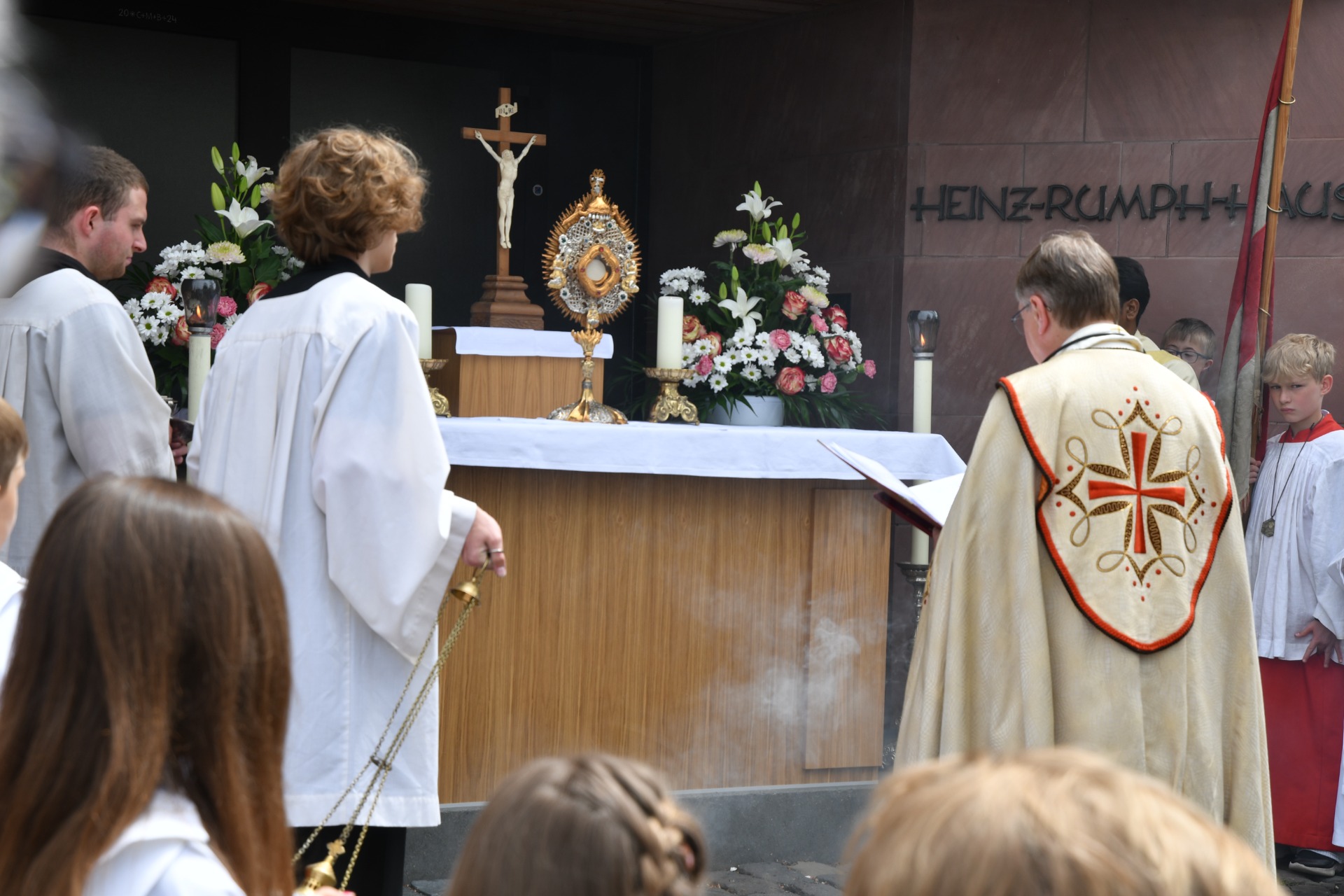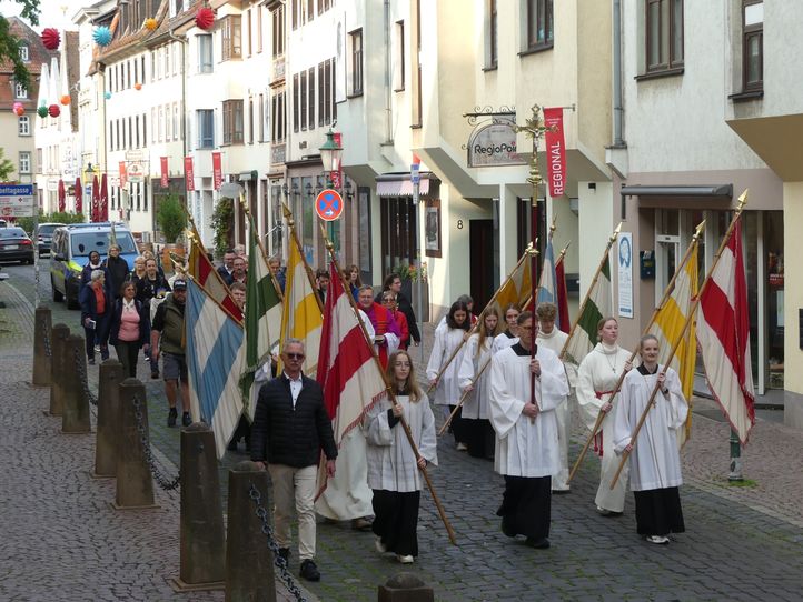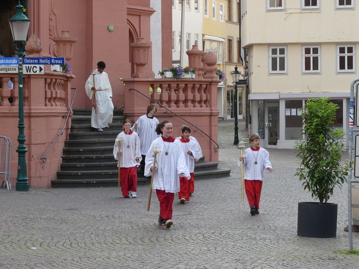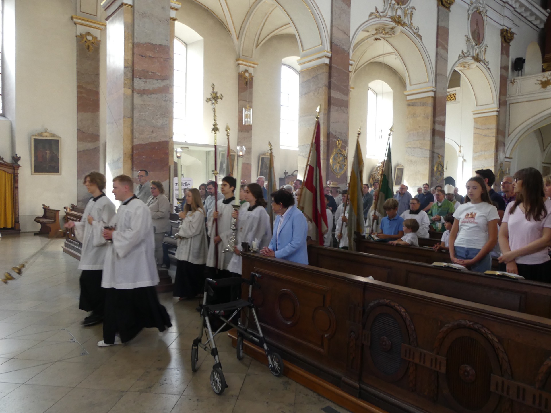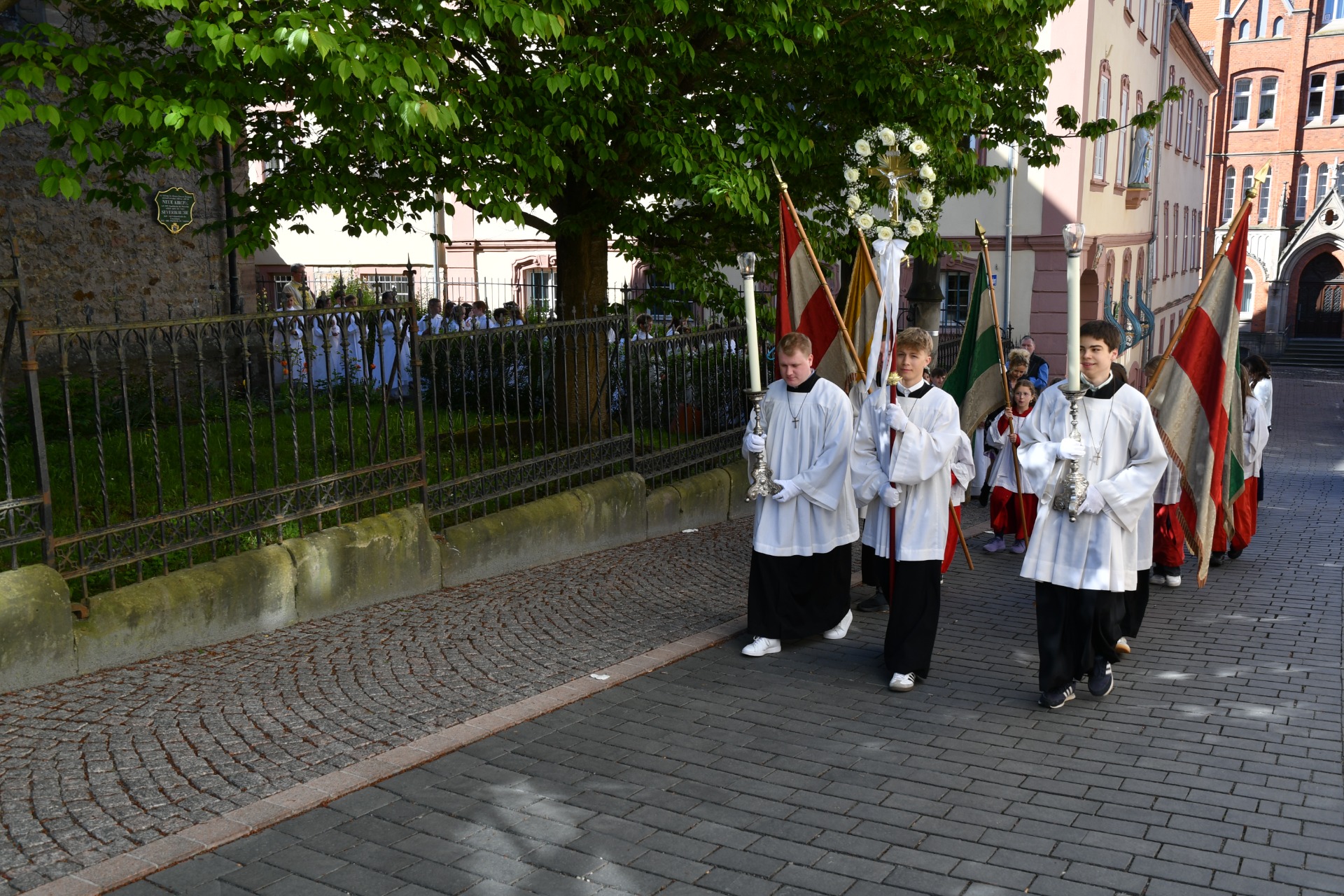 Gottesdienst mit Stadtpfarrer Stefan Buß. Ihm assistierten der indische Priester Suresh Jesudoss und Diakon Rudi Bohl. Musikalisch wurde der Gottesdienst und die Prozession vom Stadtpfarrchor, dem Kinder- und Jugendchor, der Bläsergruppe und dem Musikverein Niesig gestaltet. Nach der Prozession gab es ein frohes Miteiannder am Pfarrzentrum am Dom.