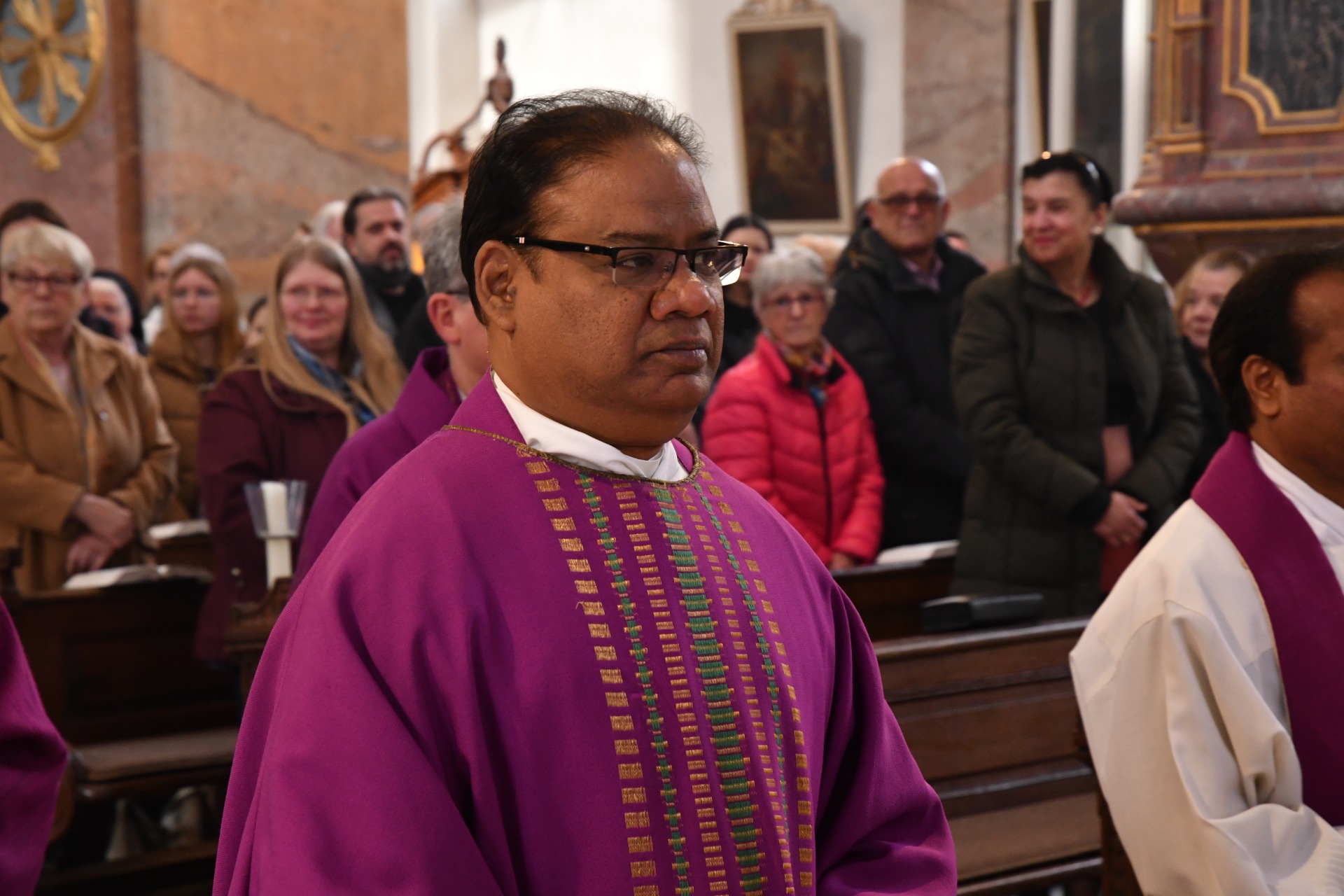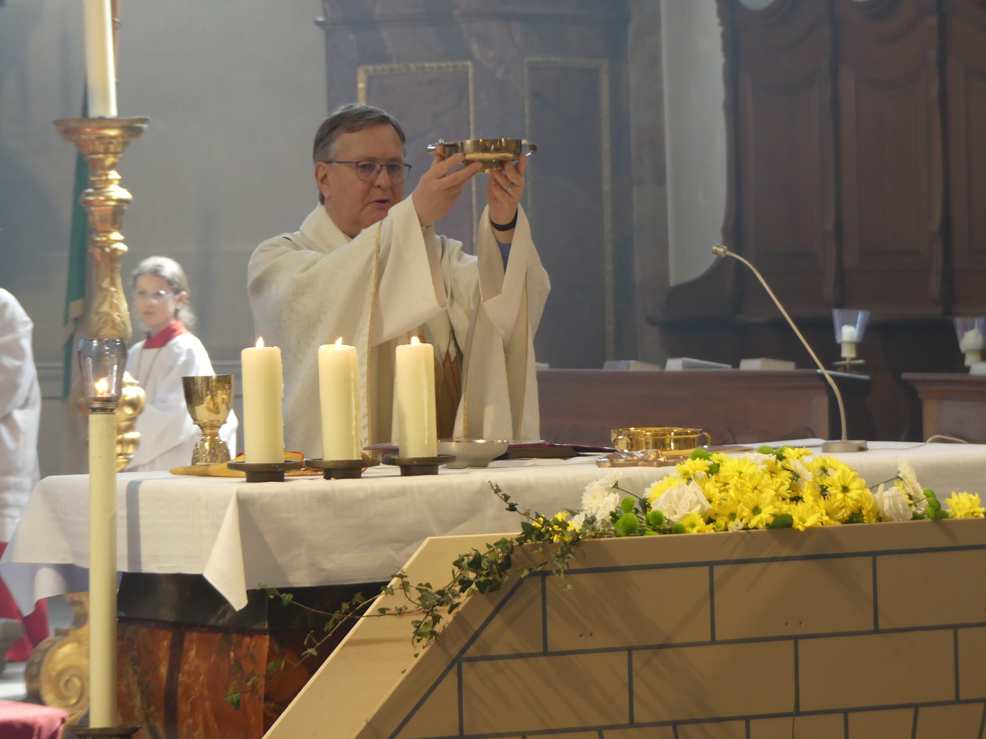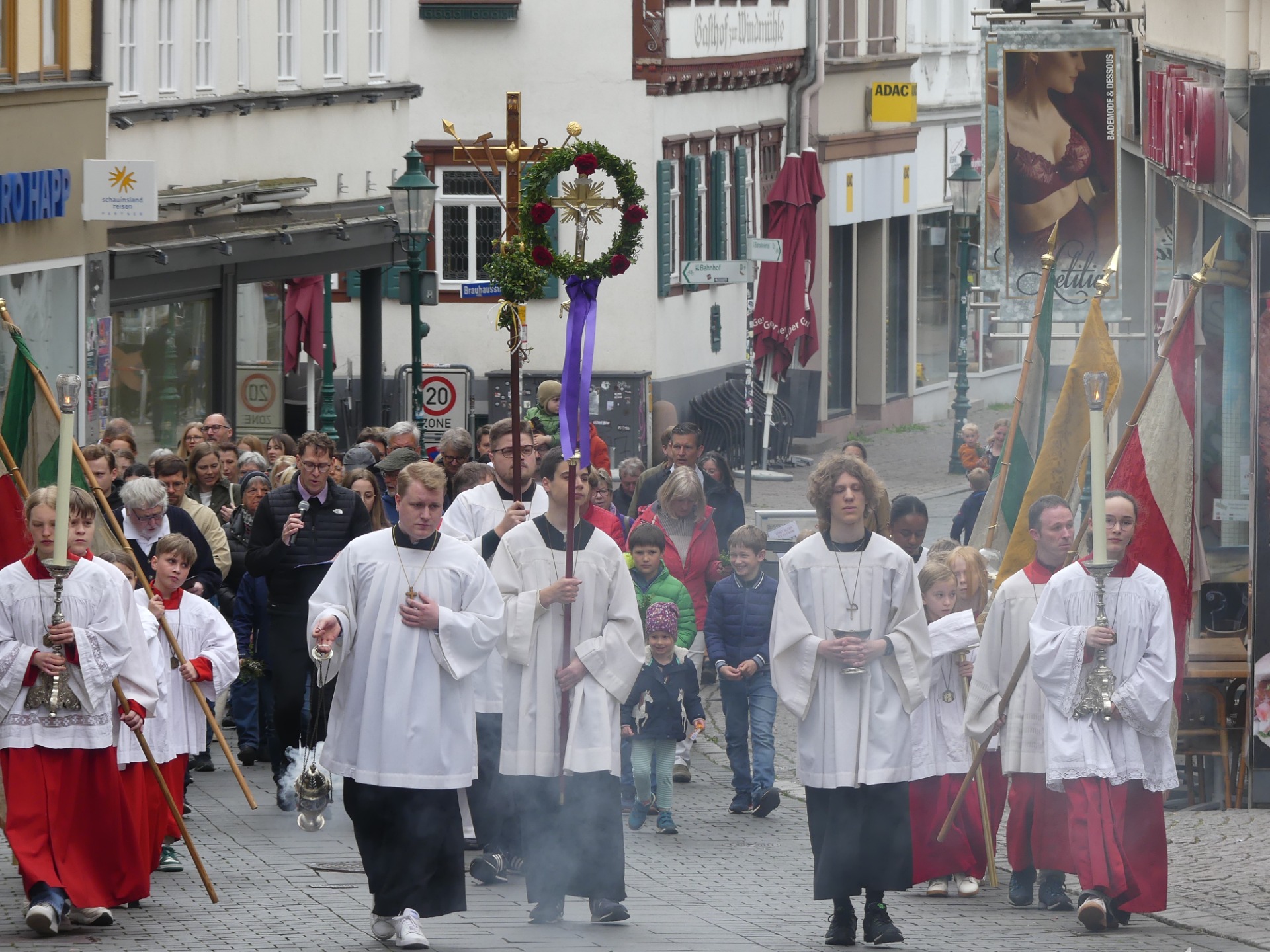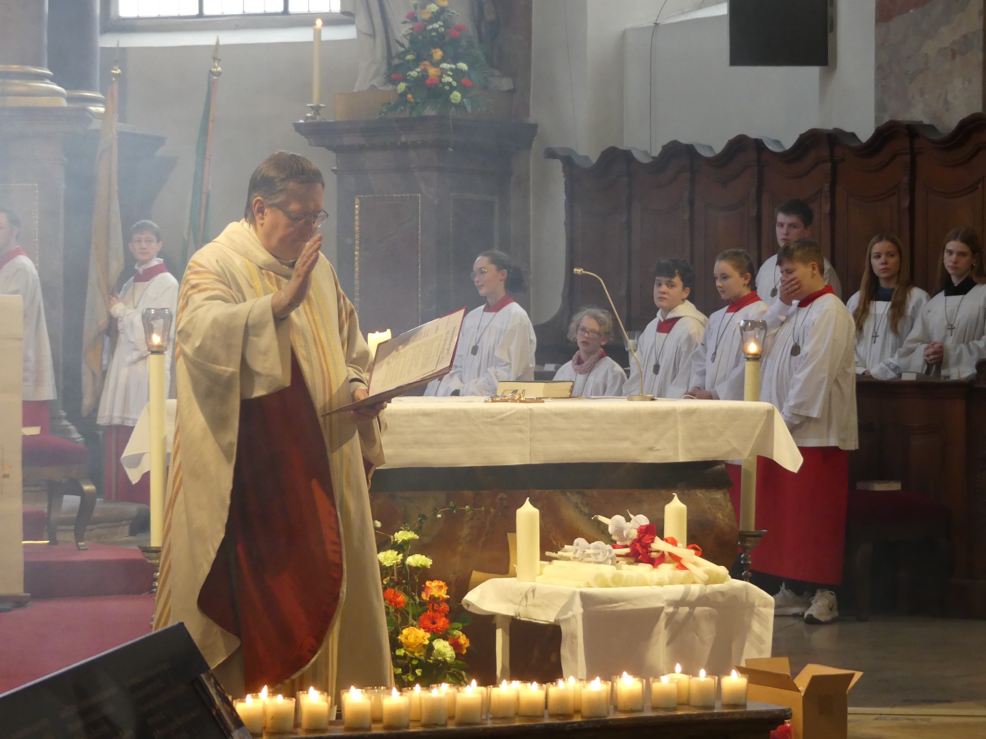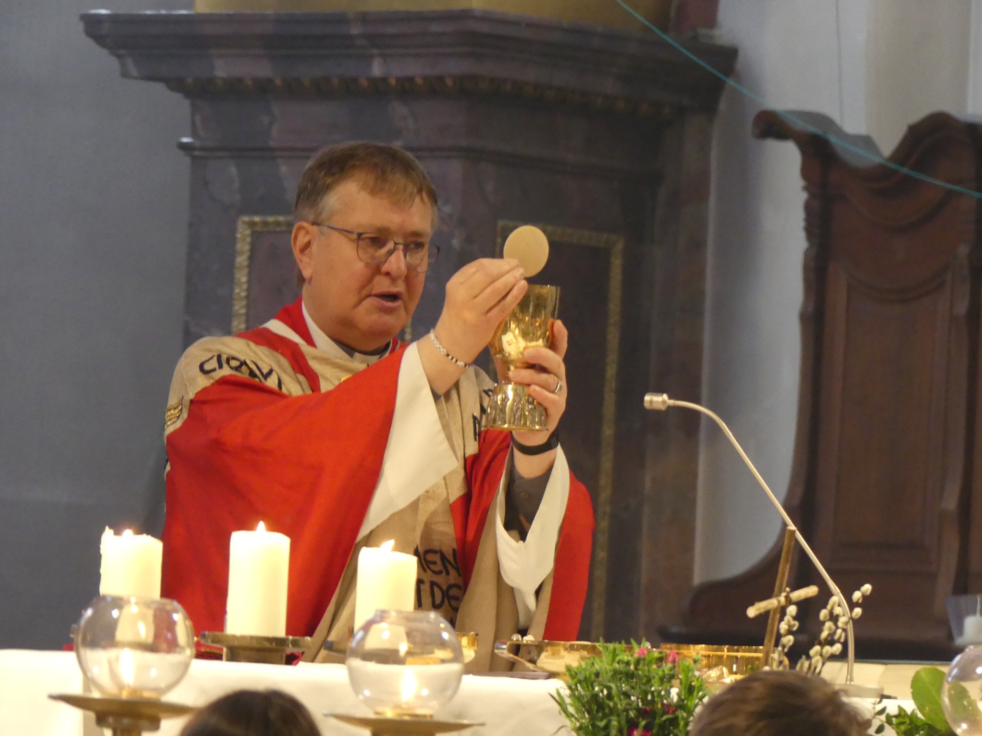 Gottesdienst mit Stadtpfarrer Stefan Buß. Ihm assistierten der indische Priester Suresh Jesudoss und Diakon Rudi Bohl. Musikalisch wurde der Gottesdienst und die Prozession vom Stadtpfarrchor, dem Kinder- und Jugendchor, der Bläsergruppe und dem Musikverein Niesig gestaltet. Nach der Prozession gab es ein frohes Miteiannder am Pfarrzentrum am Dom.