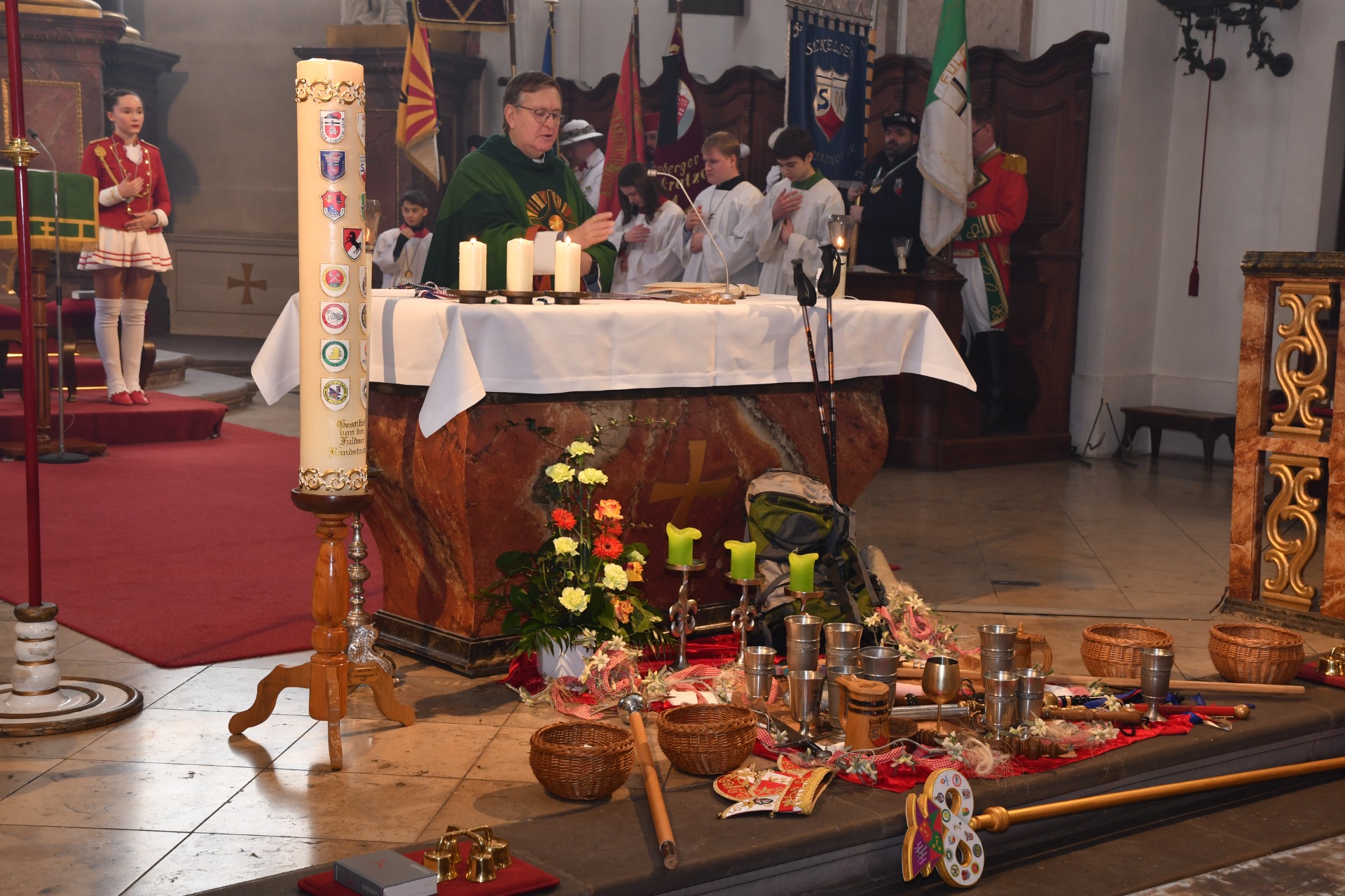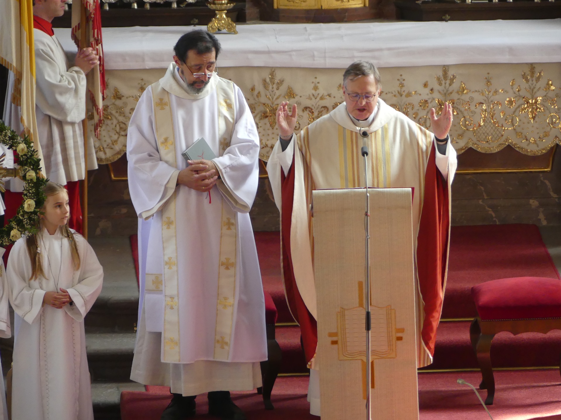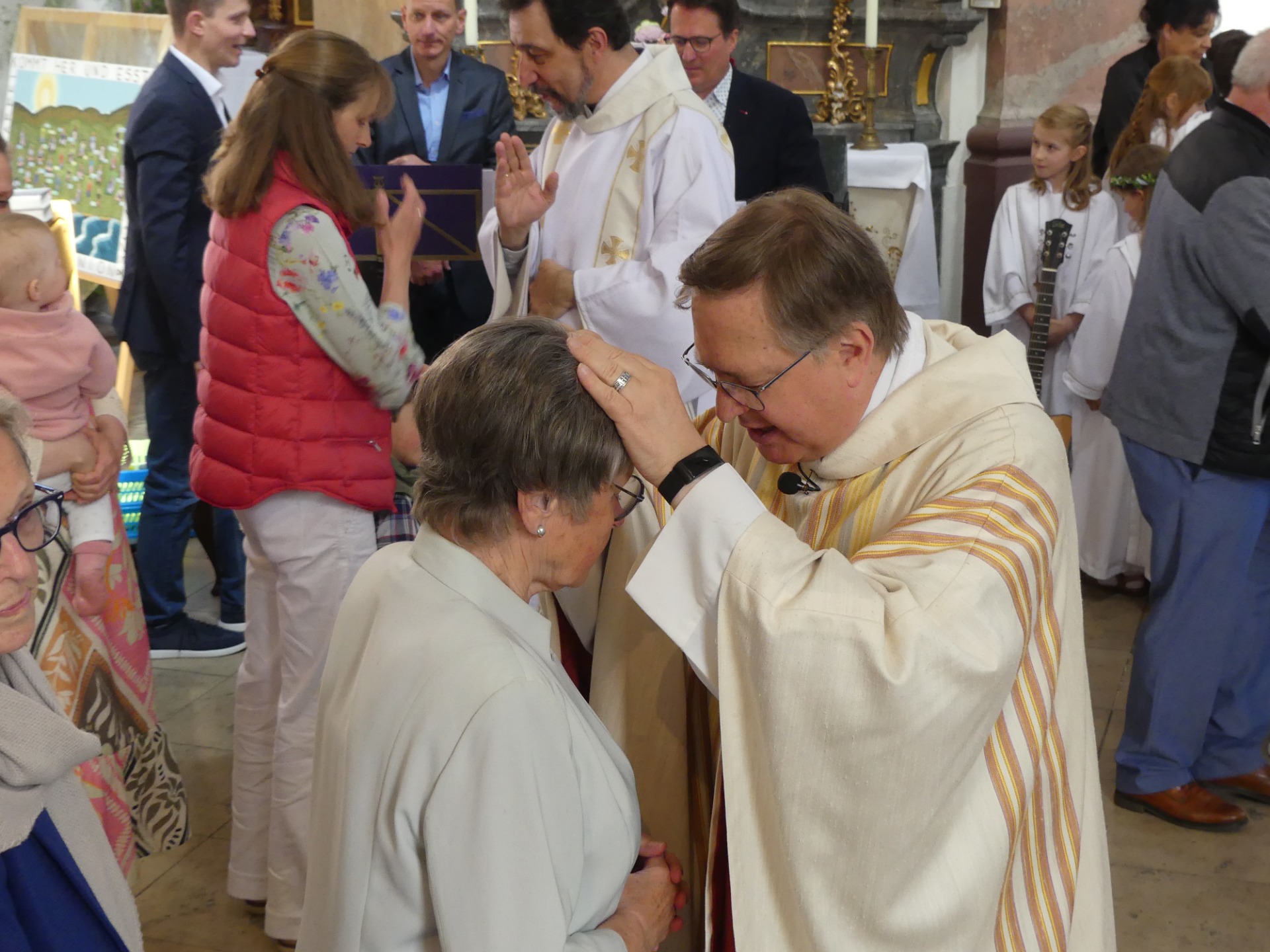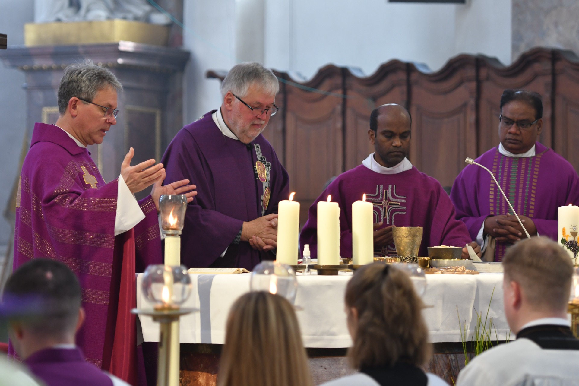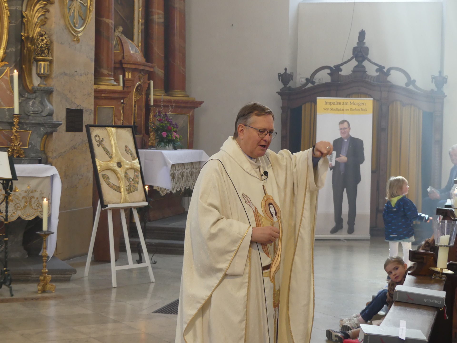 Gottesdienst mit Stadtpfarrer Stefan Buß. Ihm assistierten der indische Priester Suresh Jesudoss und Diakon Rudi Bohl. Musikalisch wurde der Gottesdienst und die Prozession vom Stadtpfarrchor, dem Kinder- und Jugendchor, der Bläsergruppe und dem Musikverein Niesig gestaltet. Nach der Prozession gab es ein frohes Miteiannder am Pfarrzentrum am Dom.