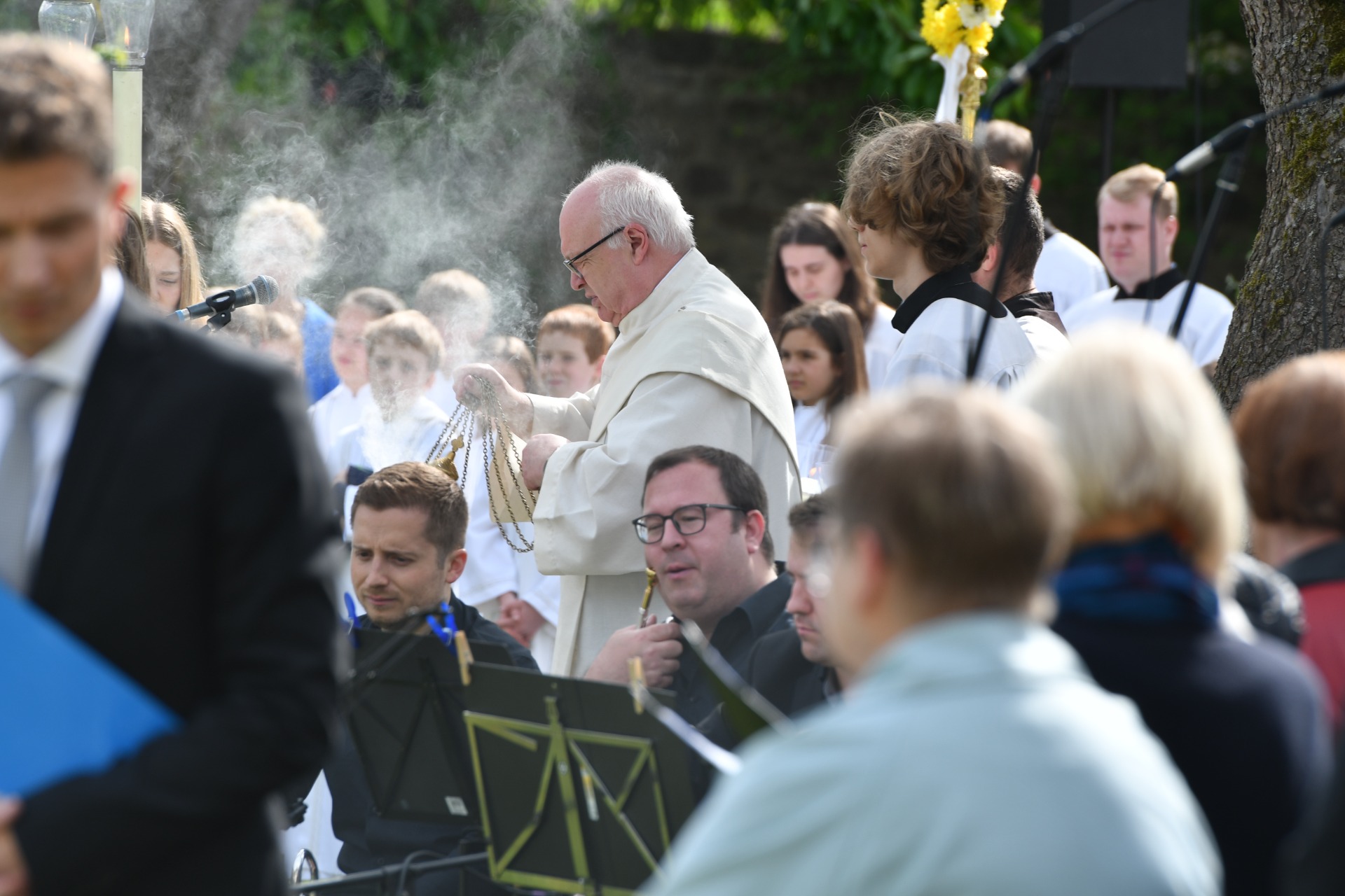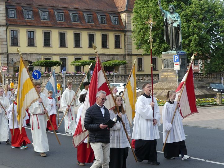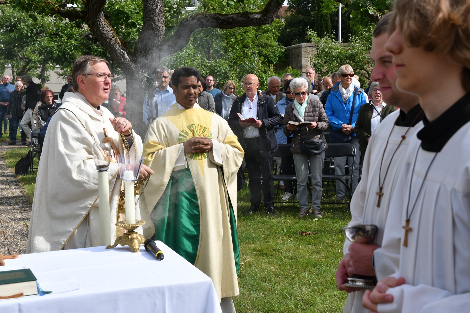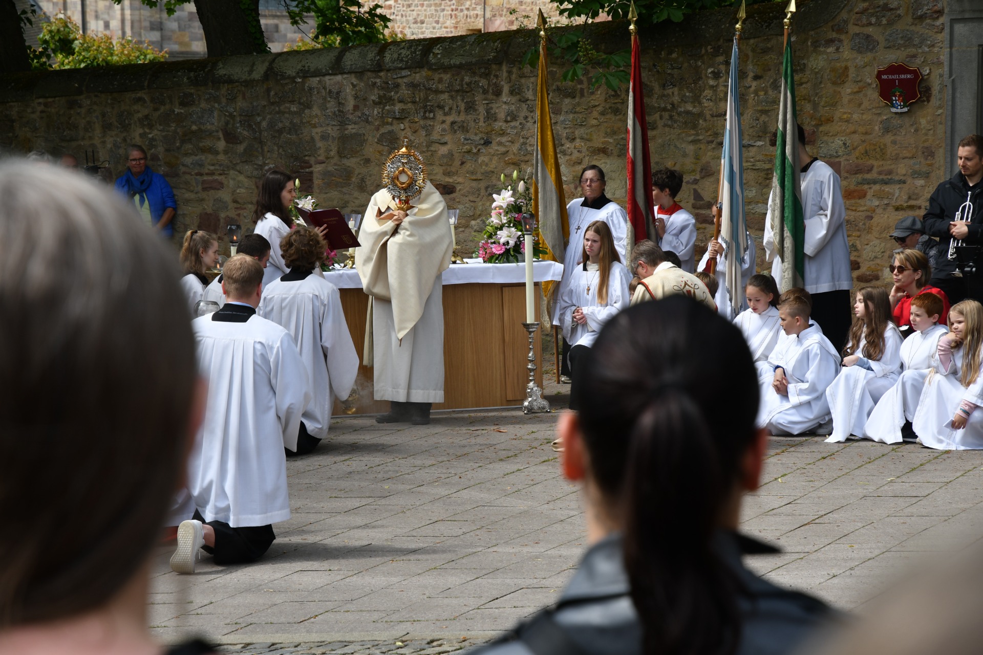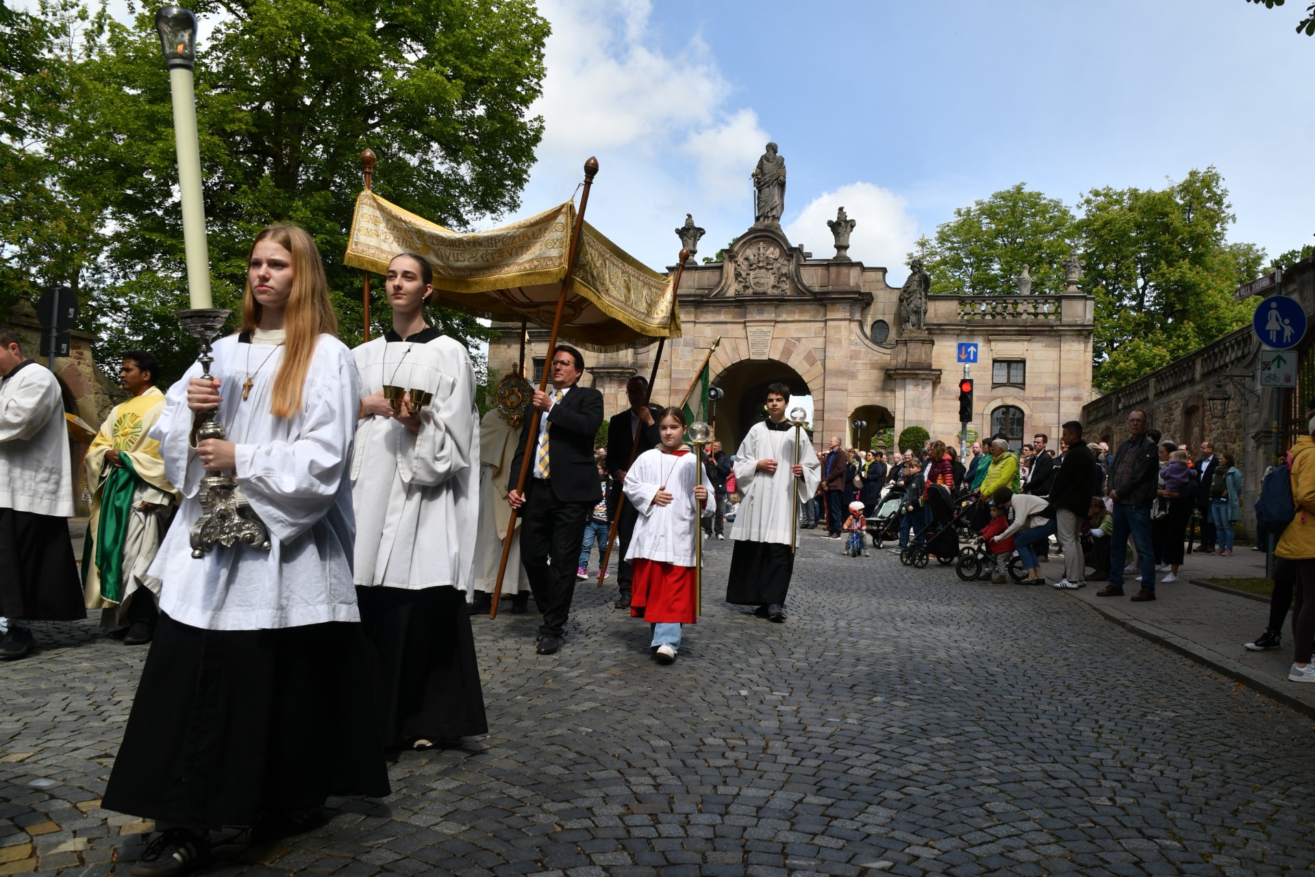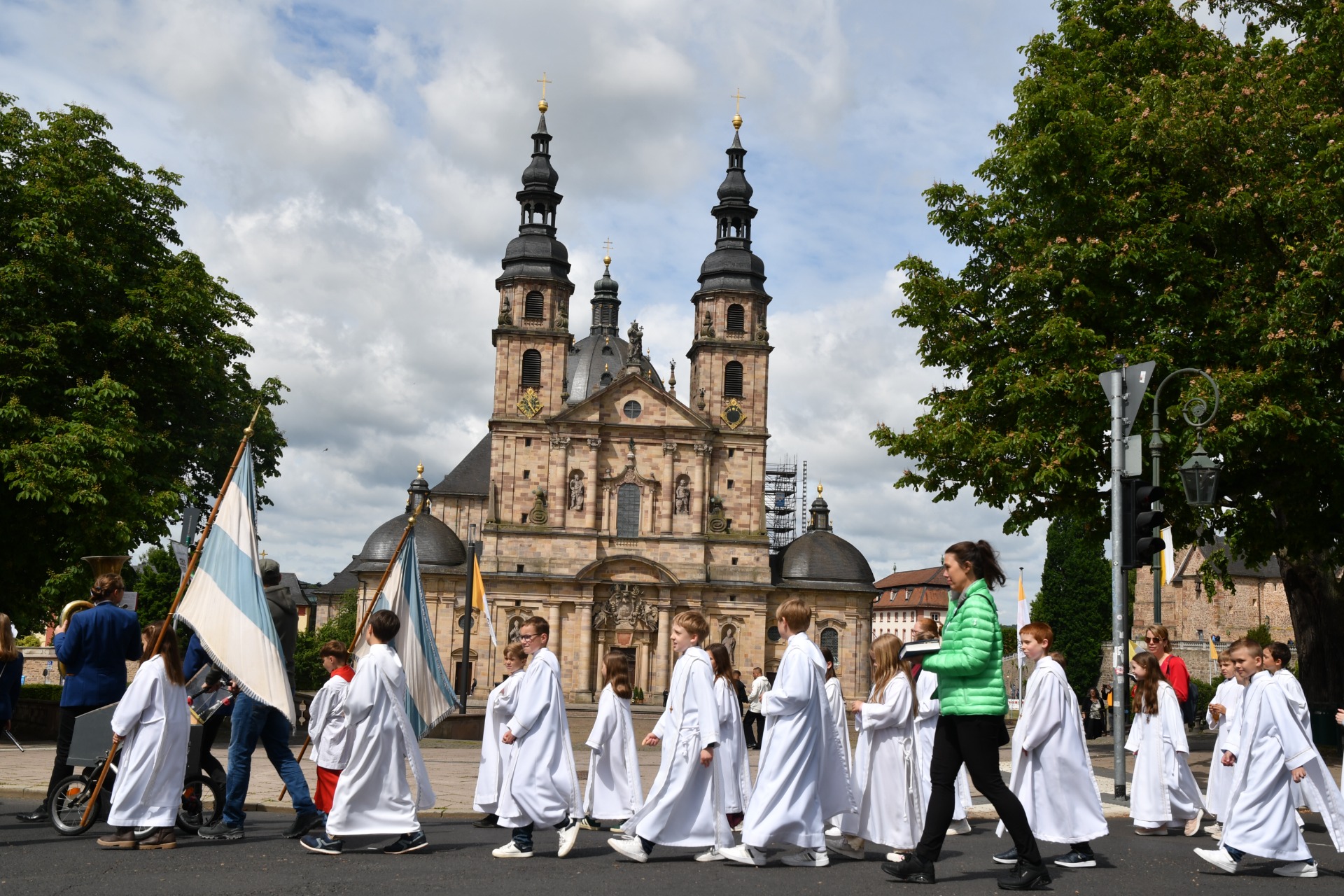 Gottesdienst mit Stadtpfarrer Stefan Buß. Ihm assistierten der indische Priester Suresh Jesudoss und Diakon Rudi Bohl. Musikalisch wurde der Gottesdienst und die Prozession vom Stadtpfarrchor, dem Kinder- und Jugendchor, der Bläsergruppe und dem Musikverein Niesig gestaltet. Nach der Prozession gab es ein frohes Miteiannder am Pfarrzentrum am Dom.