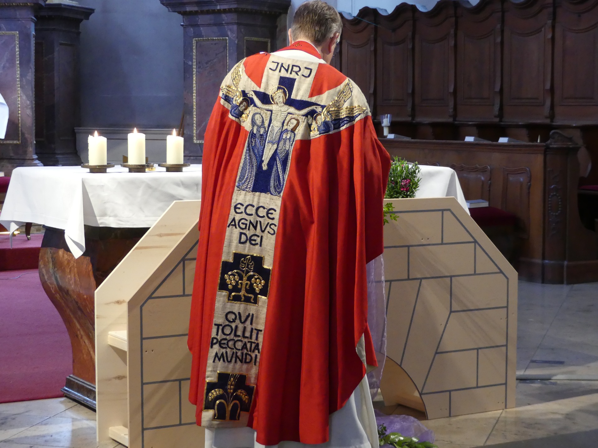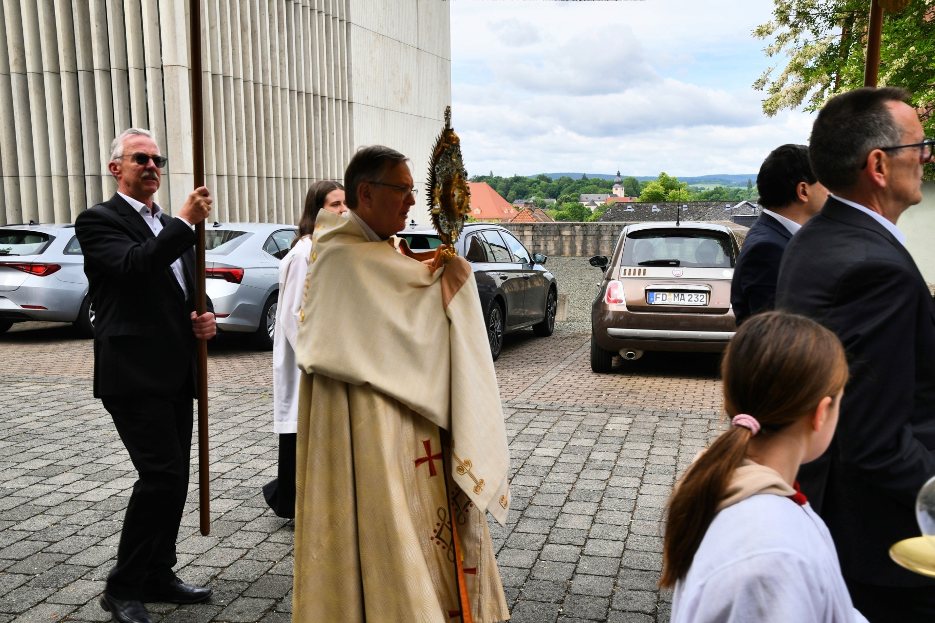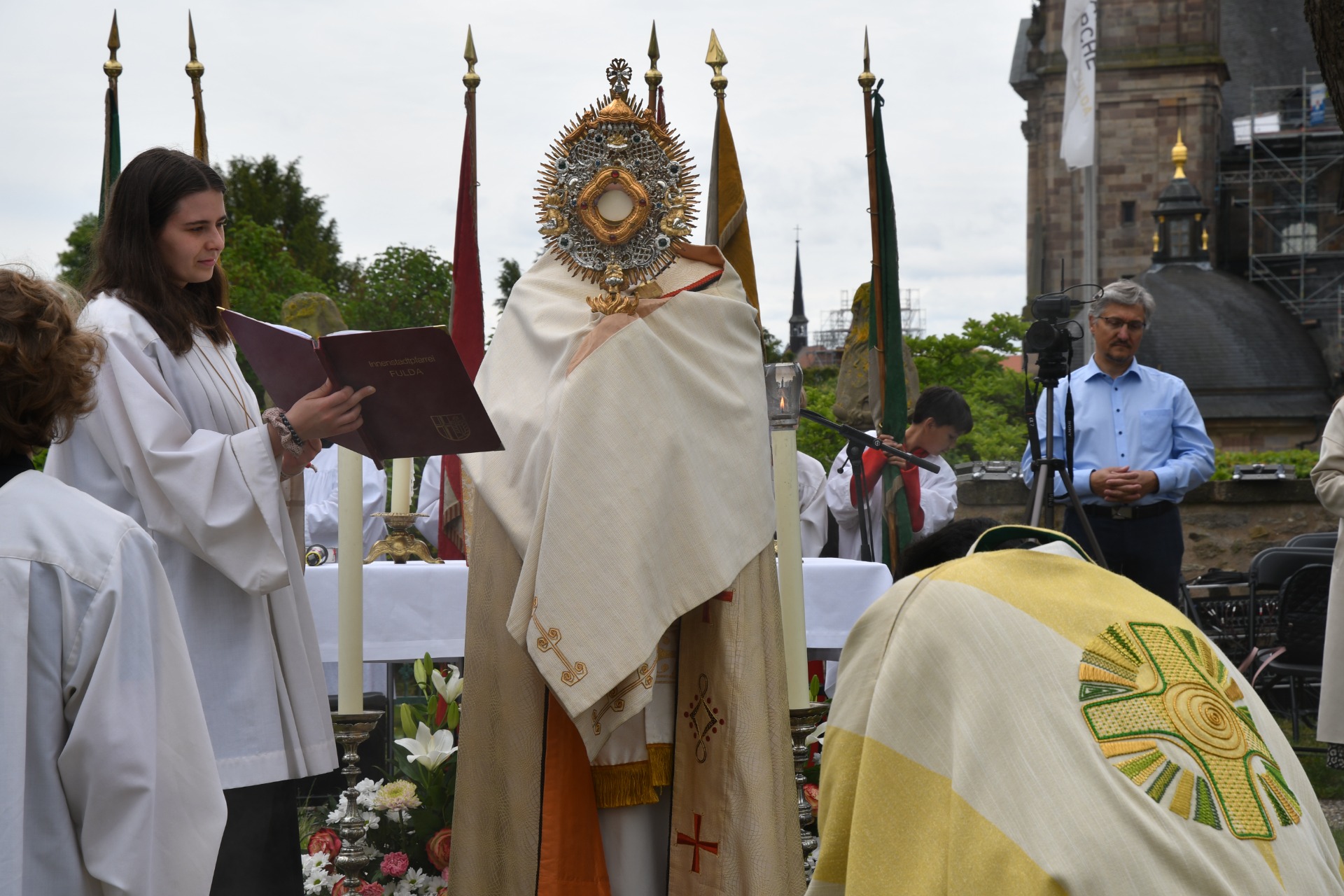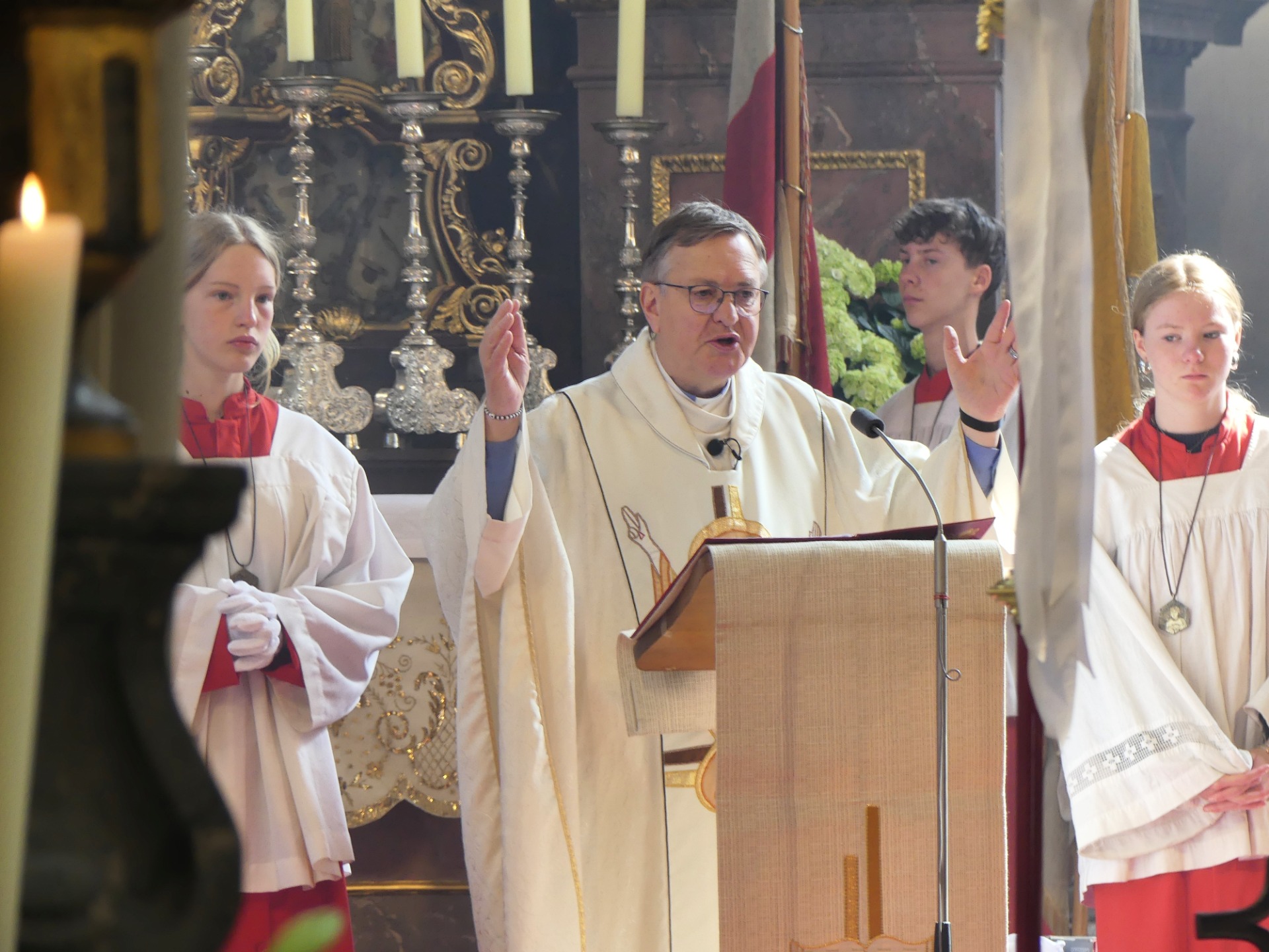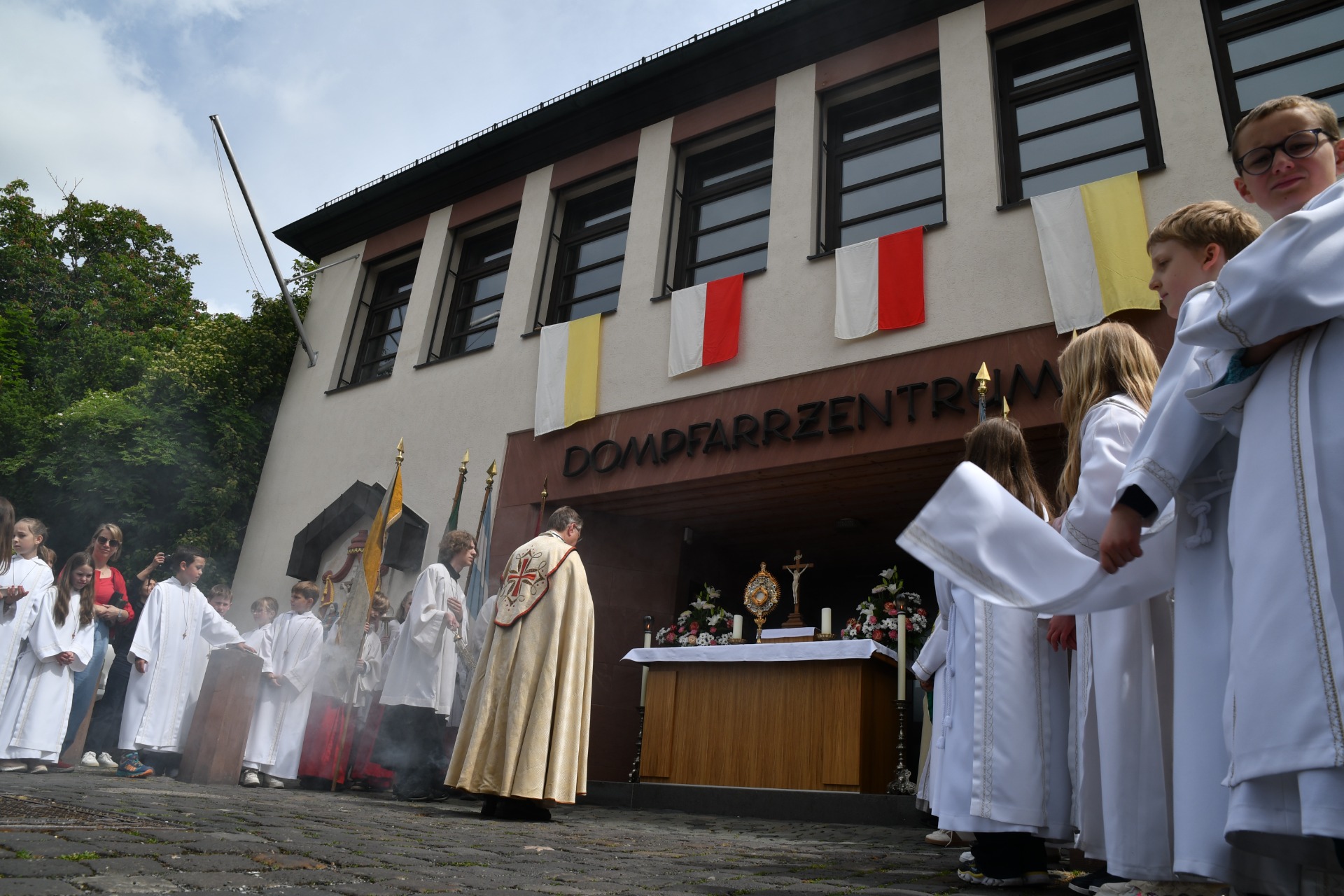 Gottesdienst mit Stadtpfarrer Stefan Buß. Ihm assistierten der indische Priester Suresh Jesudoss und Diakon Rudi Bohl. Musikalisch wurde der Gottesdienst und die Prozession vom Stadtpfarrchor, dem Kinder- und Jugendchor, der Bläsergruppe und dem Musikverein Niesig gestaltet. Nach der Prozession gab es ein frohes Miteiannder am Pfarrzentrum am Dom.
