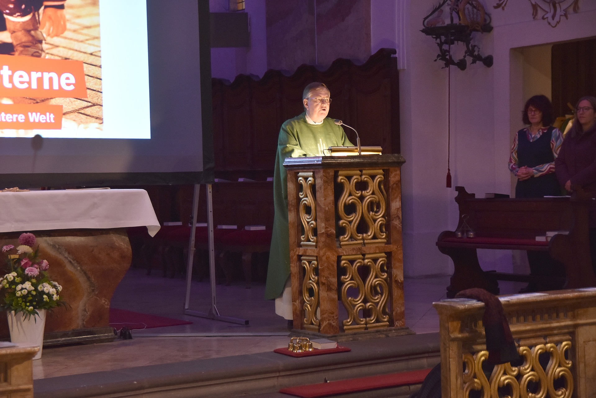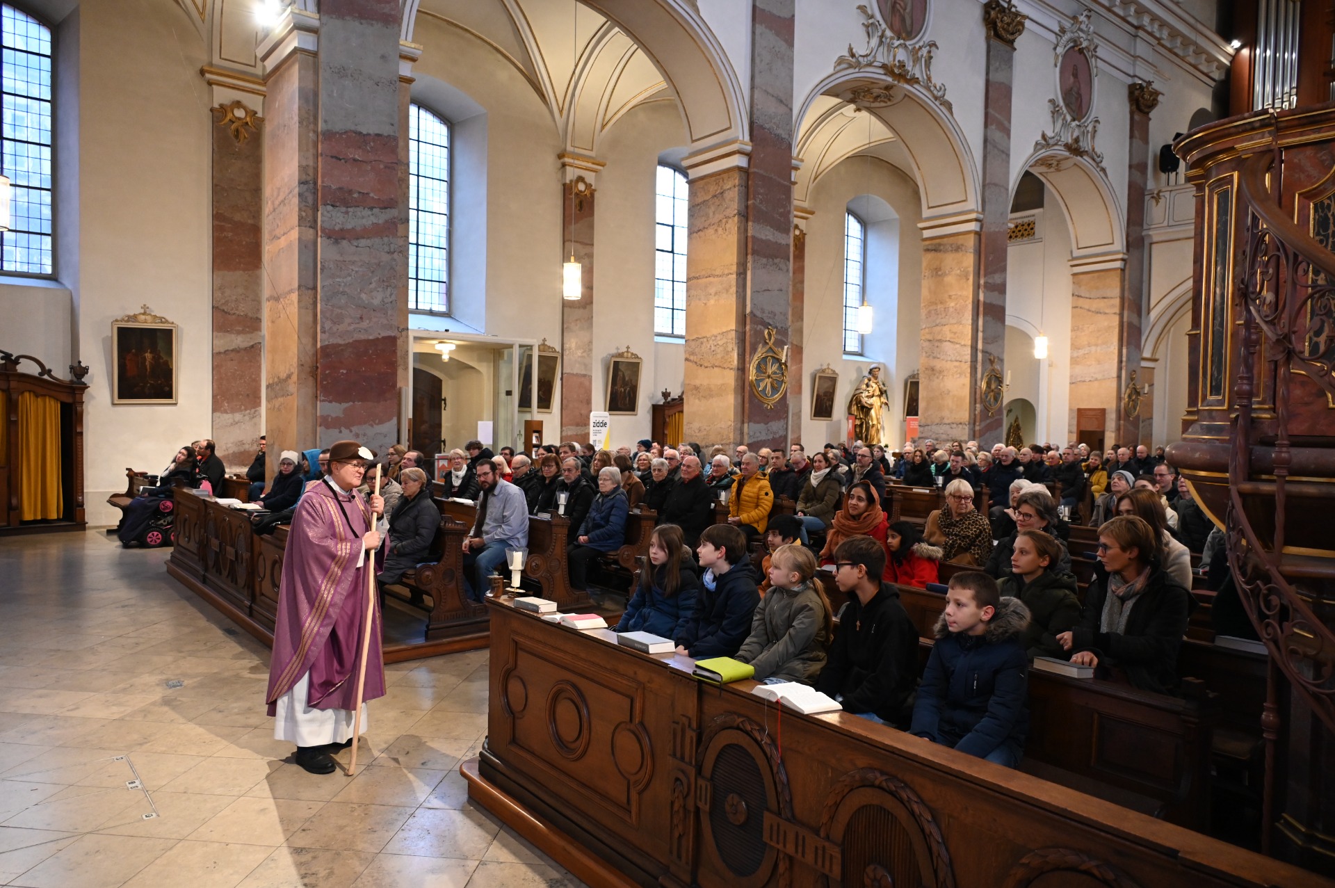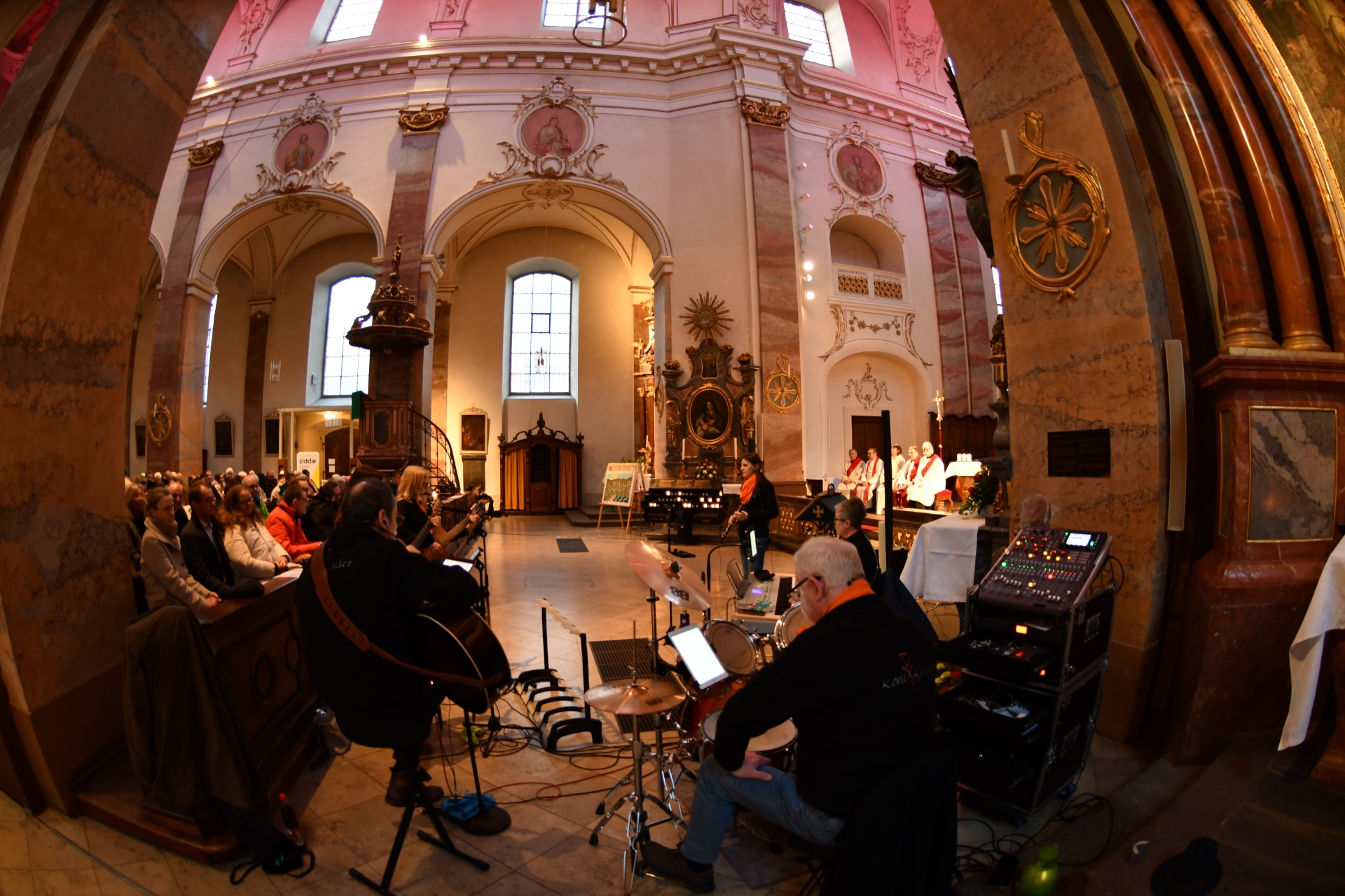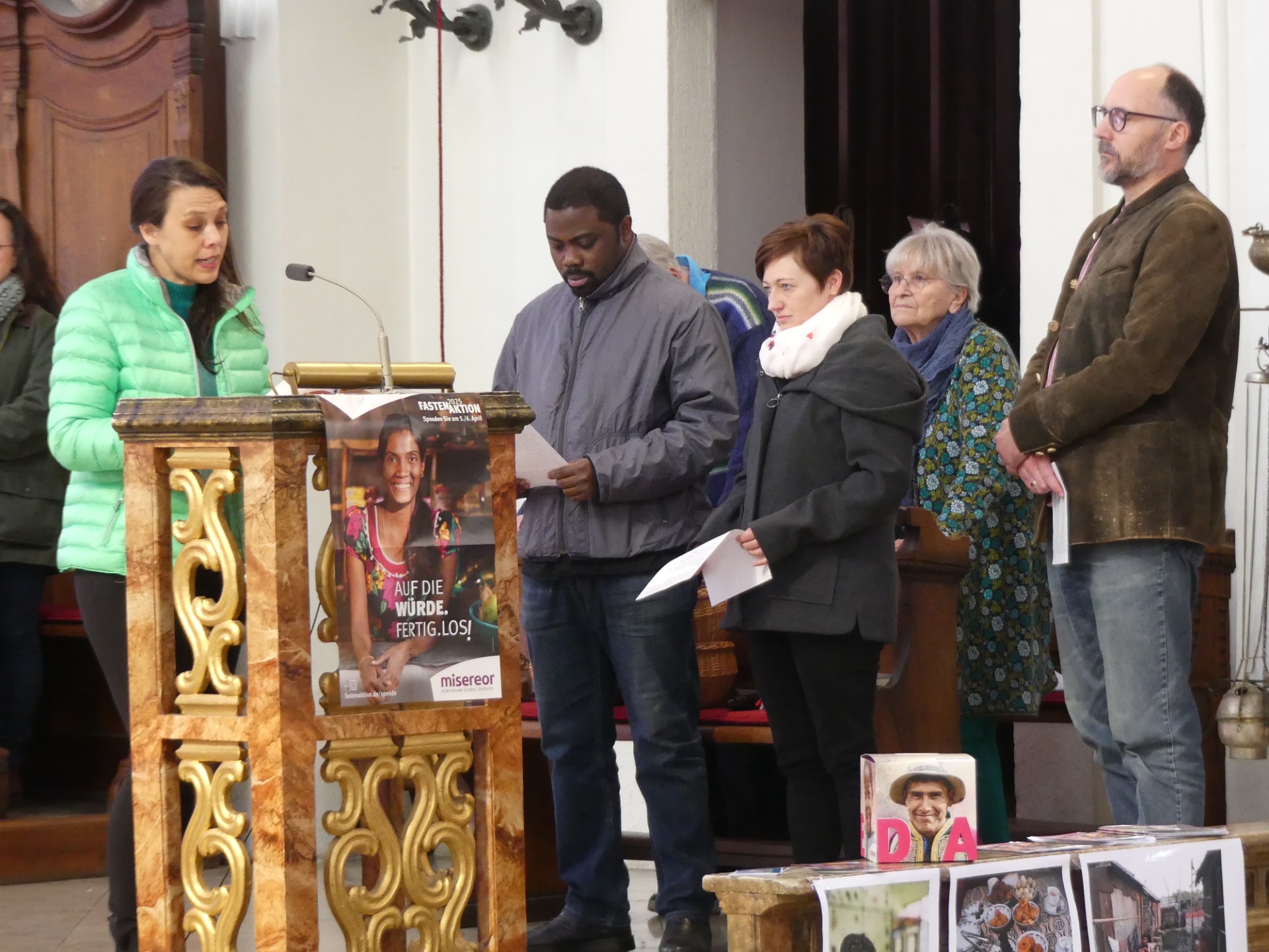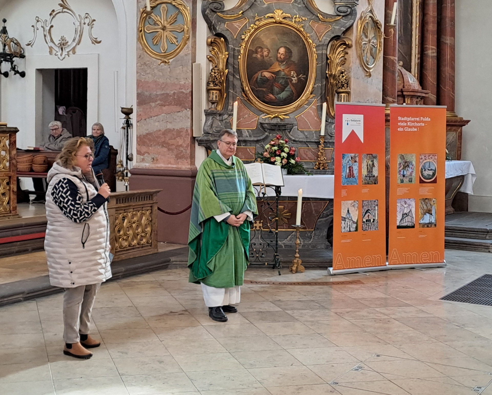 Die Solidaritätsaktion begann in der Stadtpfarrkirche Fulda mit einem Gottesdienst, den Innenstadtpfarrer Stefan Buß zelebrierte. Die Lesung trug Isabell Eckert vor, das Evangelium verkündete Diakon Dr. Meins G.S. Coetsier und die Fürbitten sprach Caritas-Geschäftsführerin Susanne Saradj.