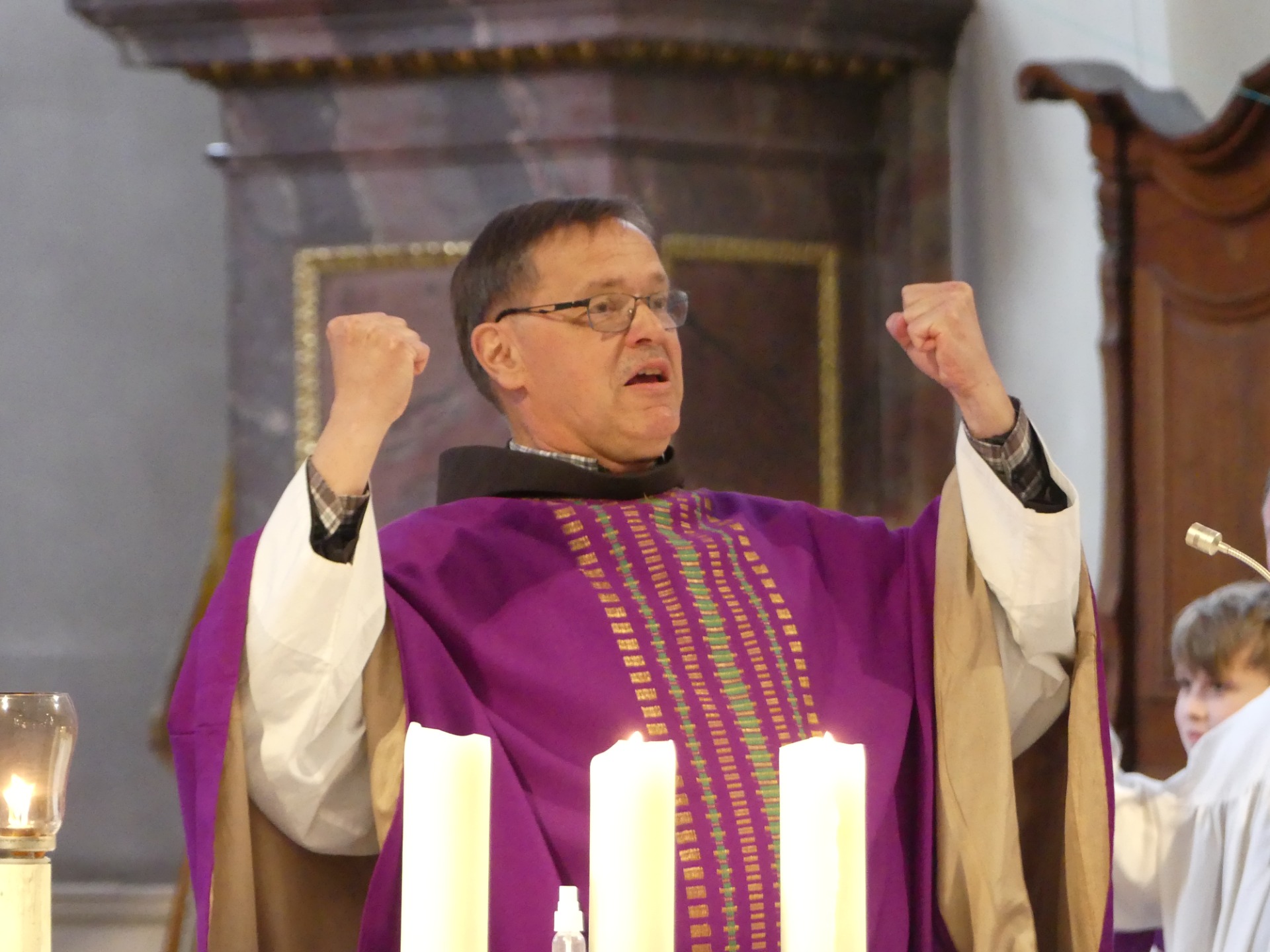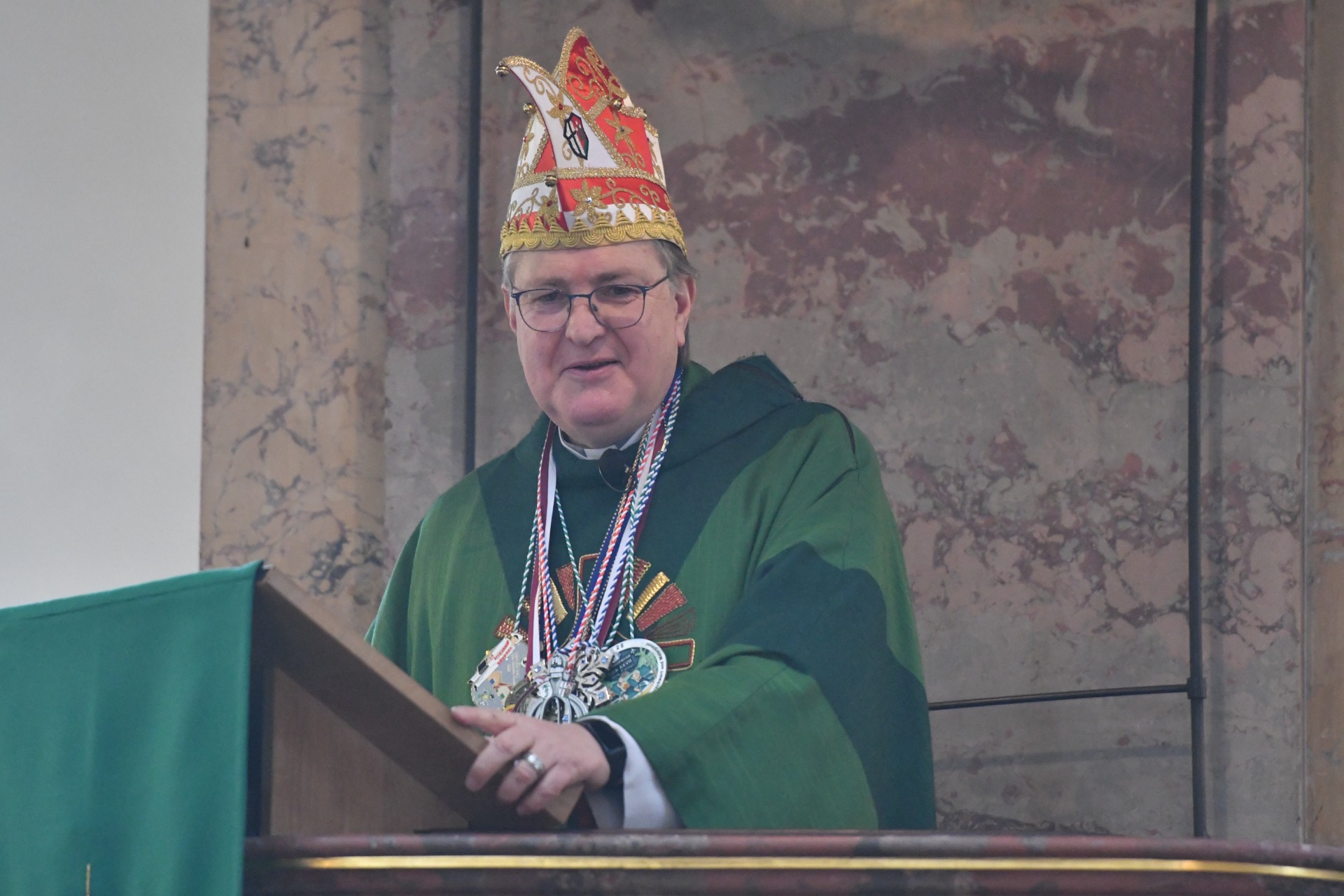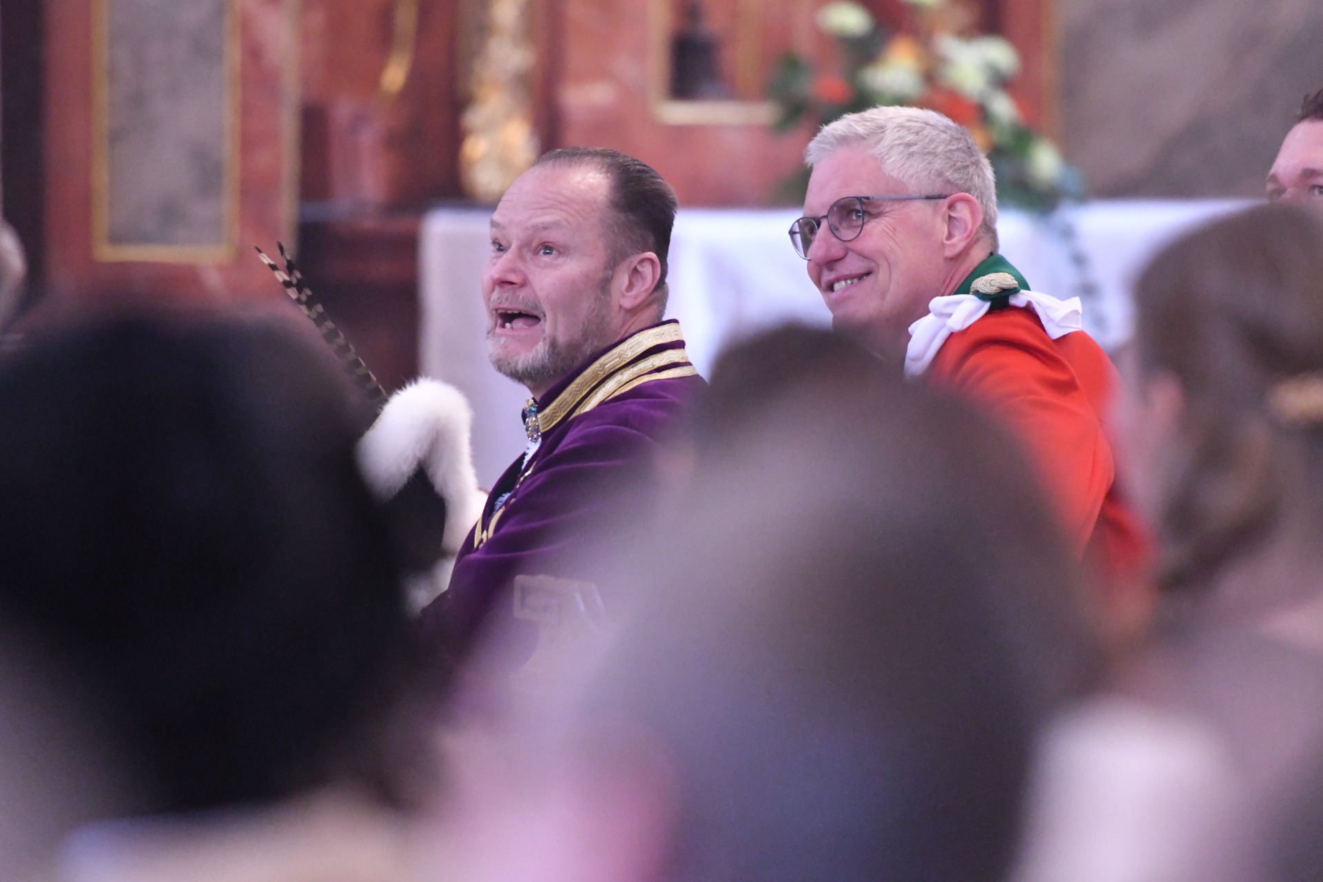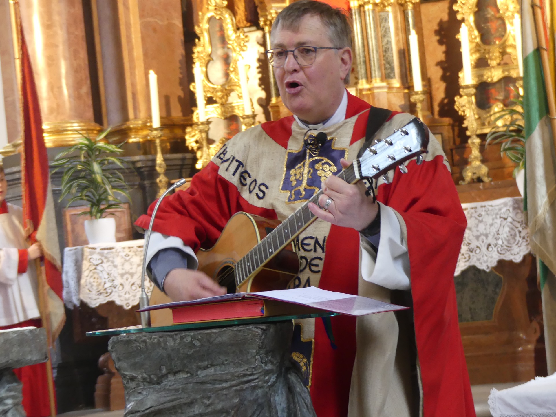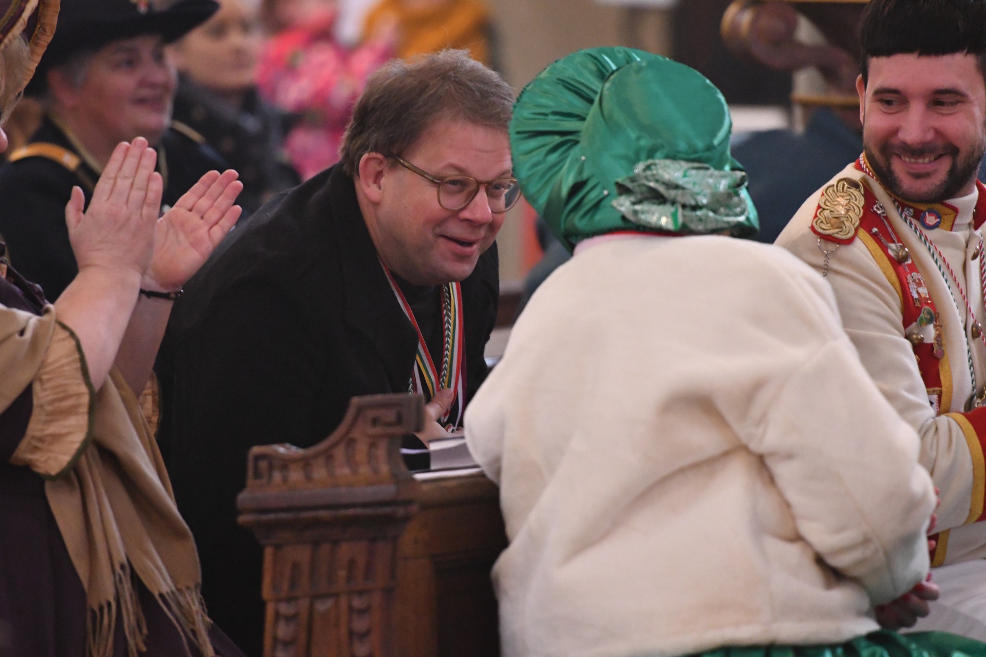 Heute am Fastnachtssonntag bestimmte das Thema Freude auch den Gottesdienst. Besondere Gäste konnte Stadtpfarrer Stefan Buß begrüßen. Die Gruppe aus Dokkum und aus Como, den beiden Partnerstädten Fuldas. Seine Predigt brachte Stadtpfarrer Buß wie es sich gehört in Reimform. Eine Sängerin aus der Gruppe von Como brachte einen Gesangsbeitrag und eine Fürbitte wurde in italenischer und eine in niederländischer Sprache gebetet.