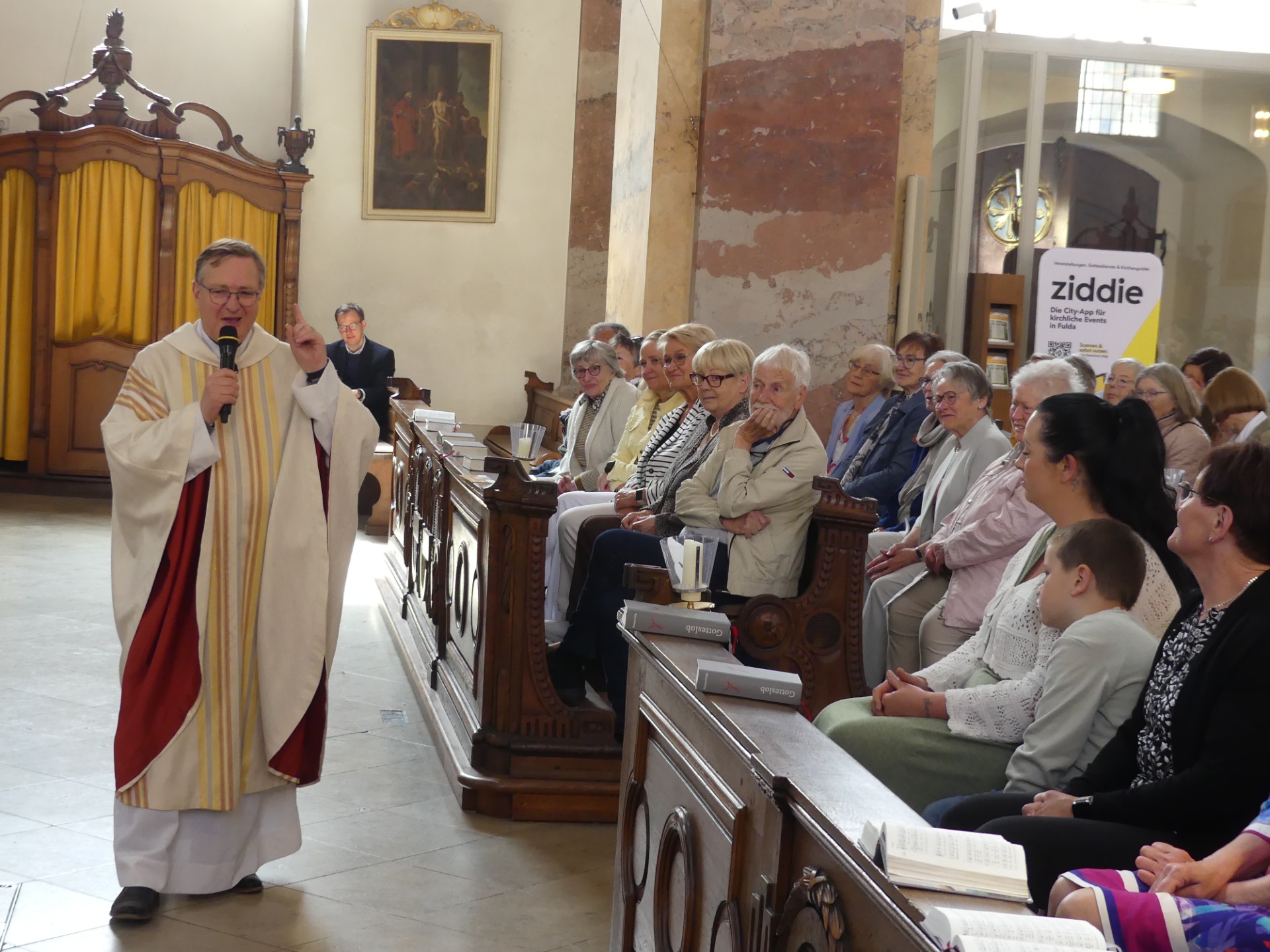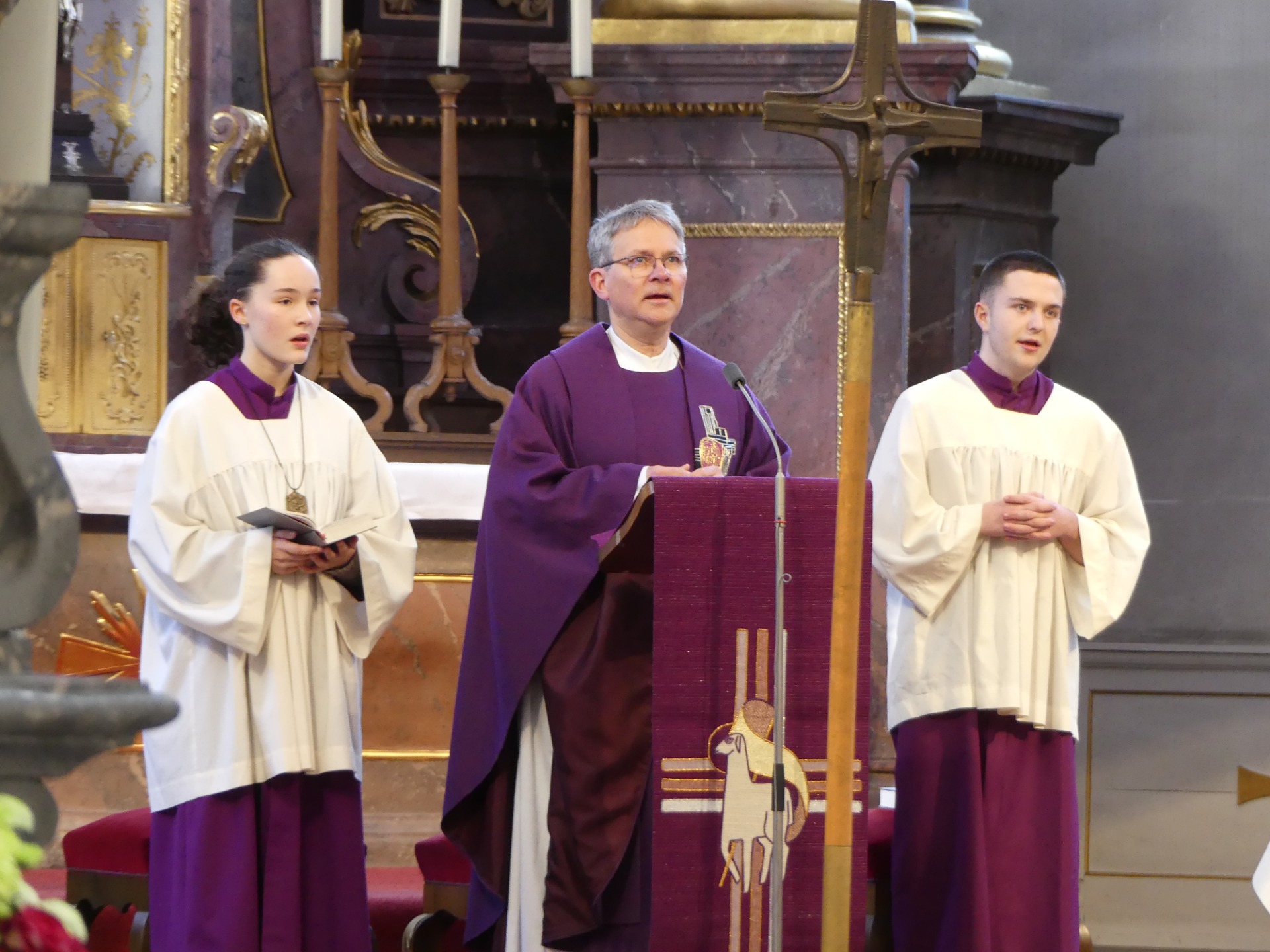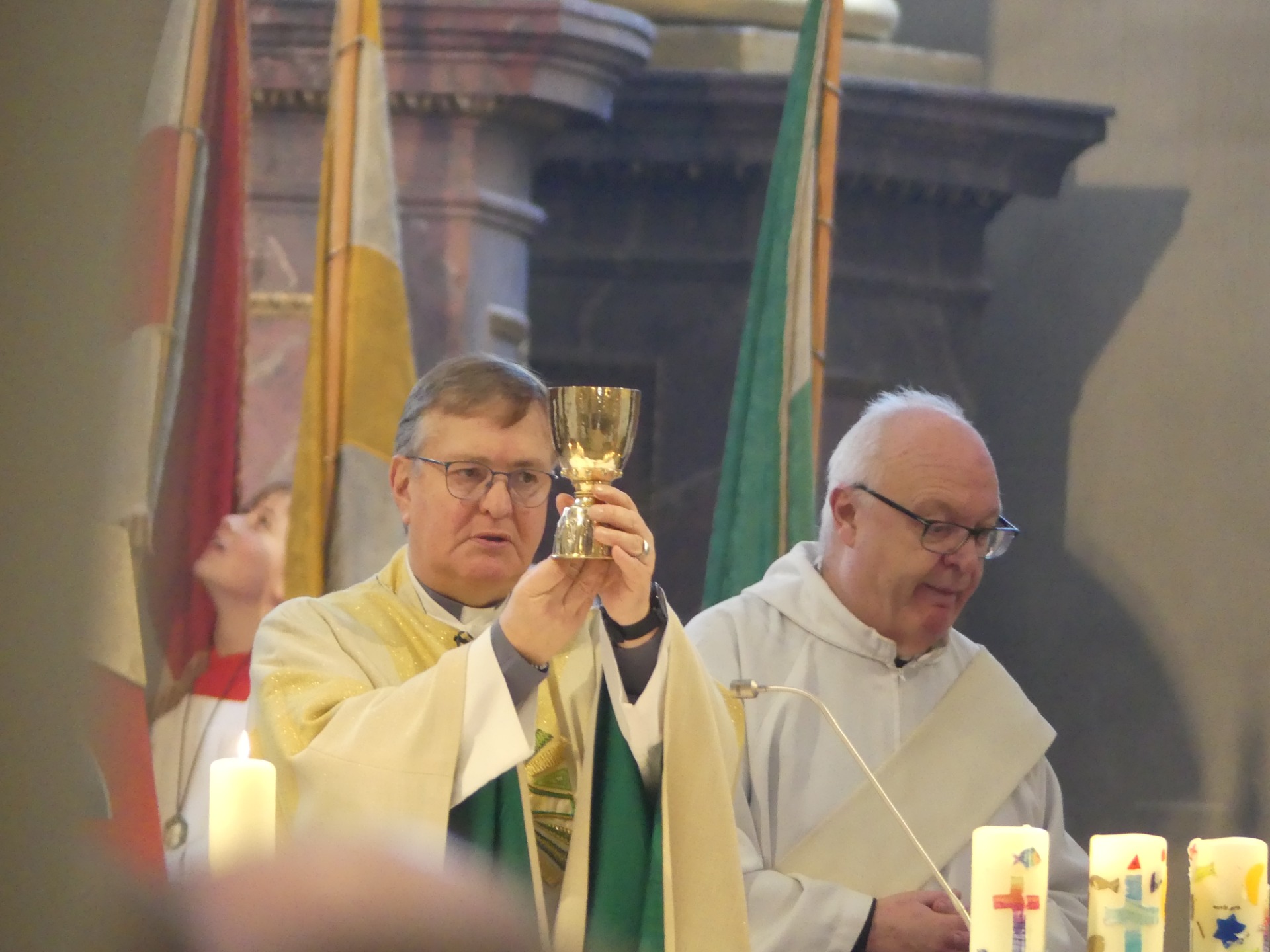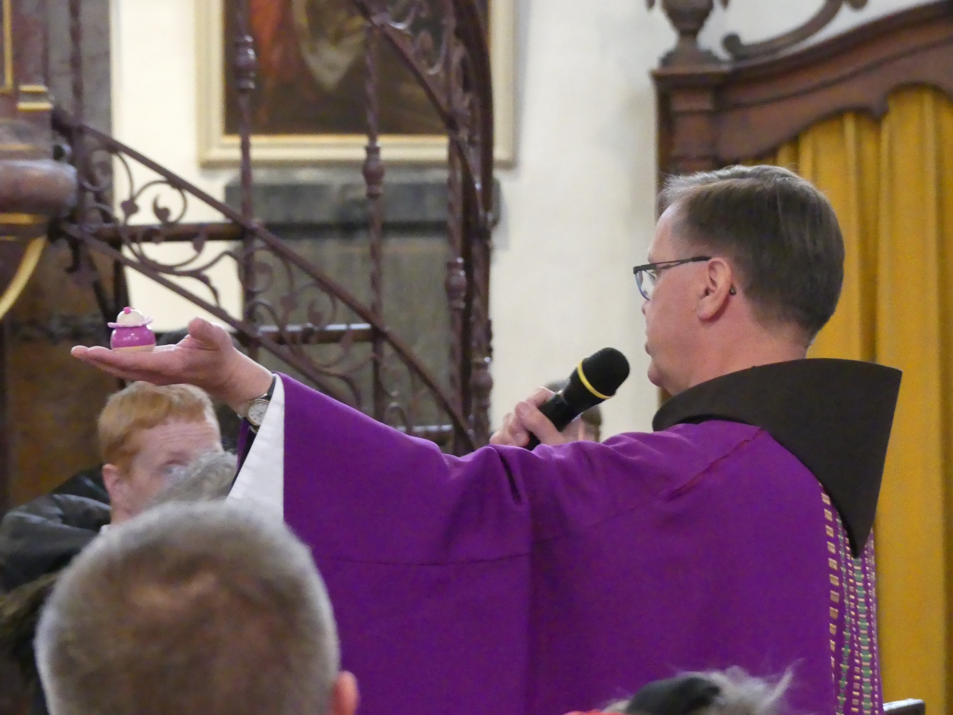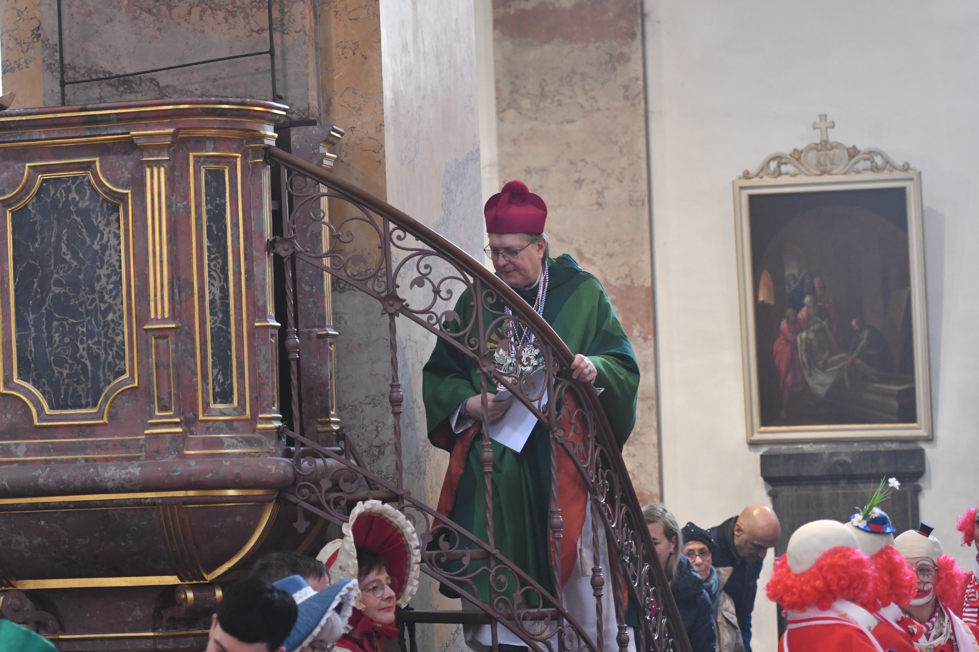 Heute am Fastnachtssonntag bestimmte das Thema Freude auch den Gottesdienst. Besondere Gäste konnte Stadtpfarrer Stefan Buß begrüßen. Die Gruppe aus Dokkum und aus Como, den beiden Partnerstädten Fuldas. Seine Predigt brachte Stadtpfarrer Buß wie es sich gehört in Reimform. Eine Sängerin aus der Gruppe von Como brachte einen Gesangsbeitrag und eine Fürbitte wurde in italenischer und eine in niederländischer Sprache gebetet.