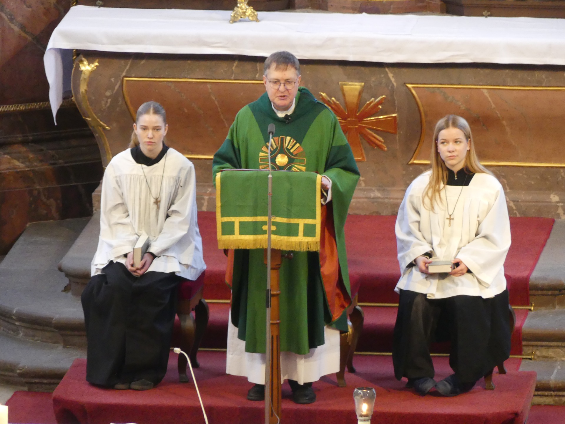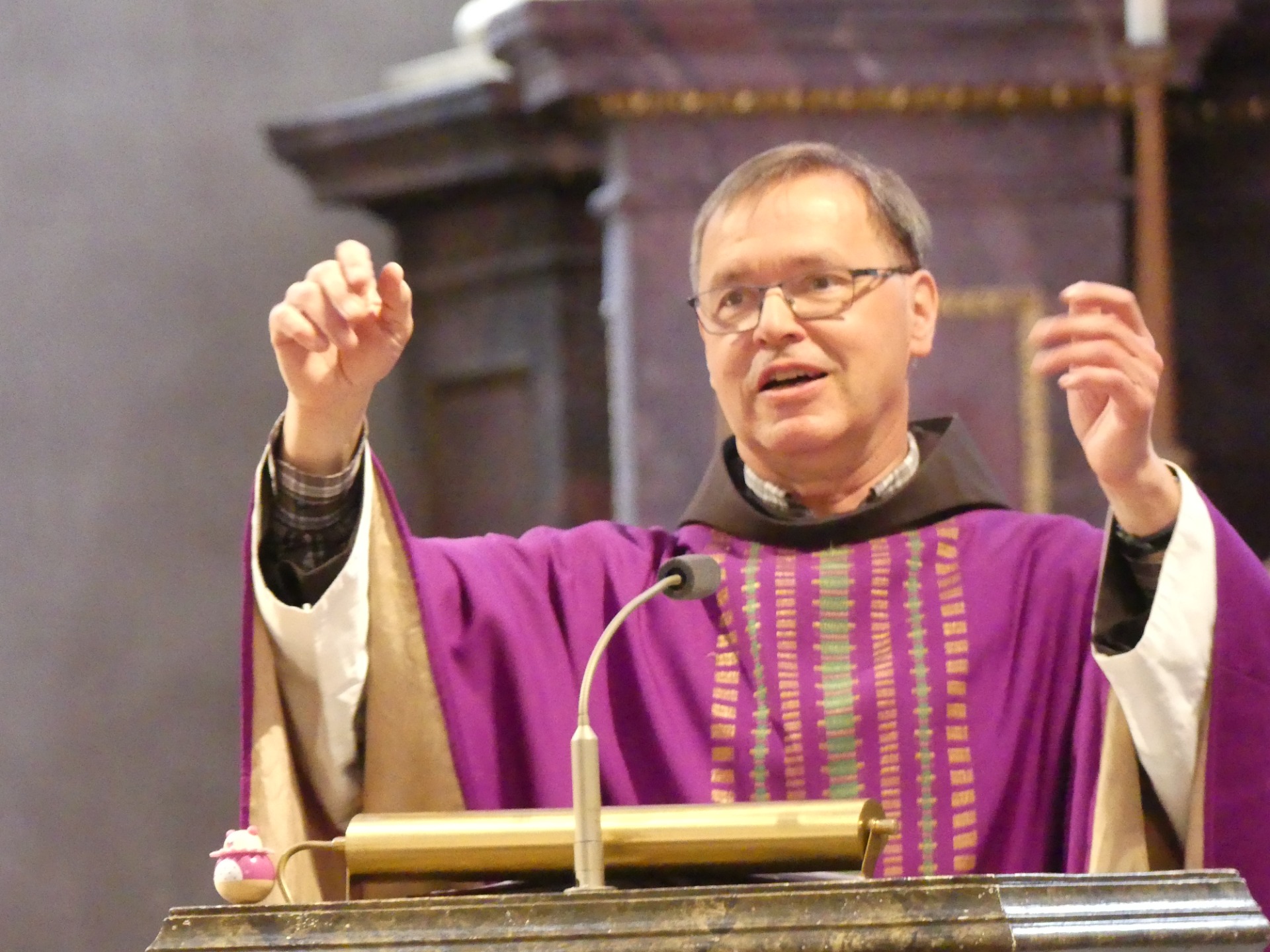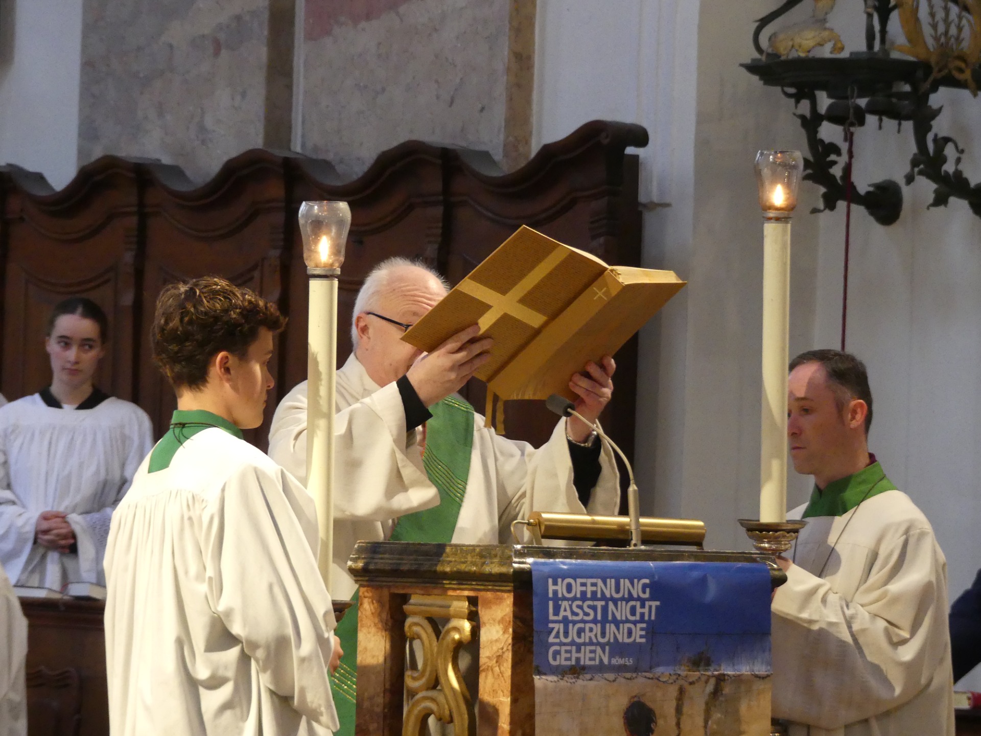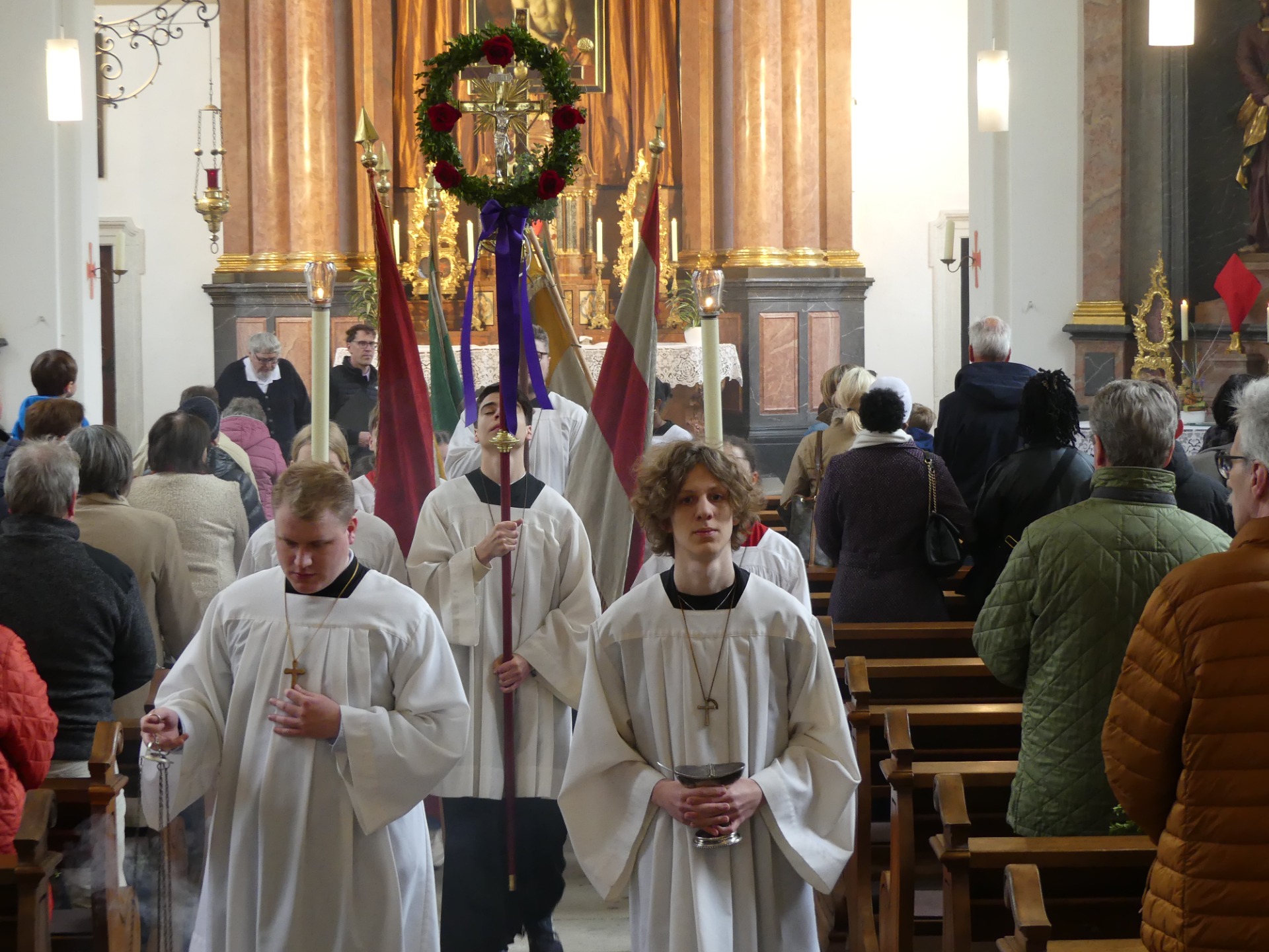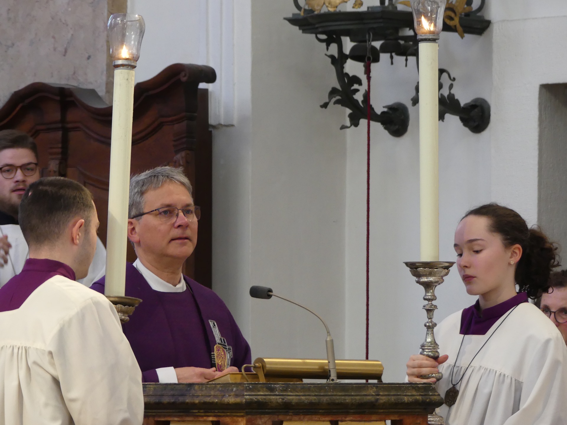 Heute am Fastnachtssonntag bestimmte das Thema Freude auch den Gottesdienst. Besondere Gäste konnte Stadtpfarrer Stefan Buß begrüßen. Die Gruppe aus Dokkum und aus Como, den beiden Partnerstädten Fuldas. Seine Predigt brachte Stadtpfarrer Buß wie es sich gehört in Reimform. Eine Sängerin aus der Gruppe von Como brachte einen Gesangsbeitrag und eine Fürbitte wurde in italenischer und eine in niederländischer Sprache gebetet.