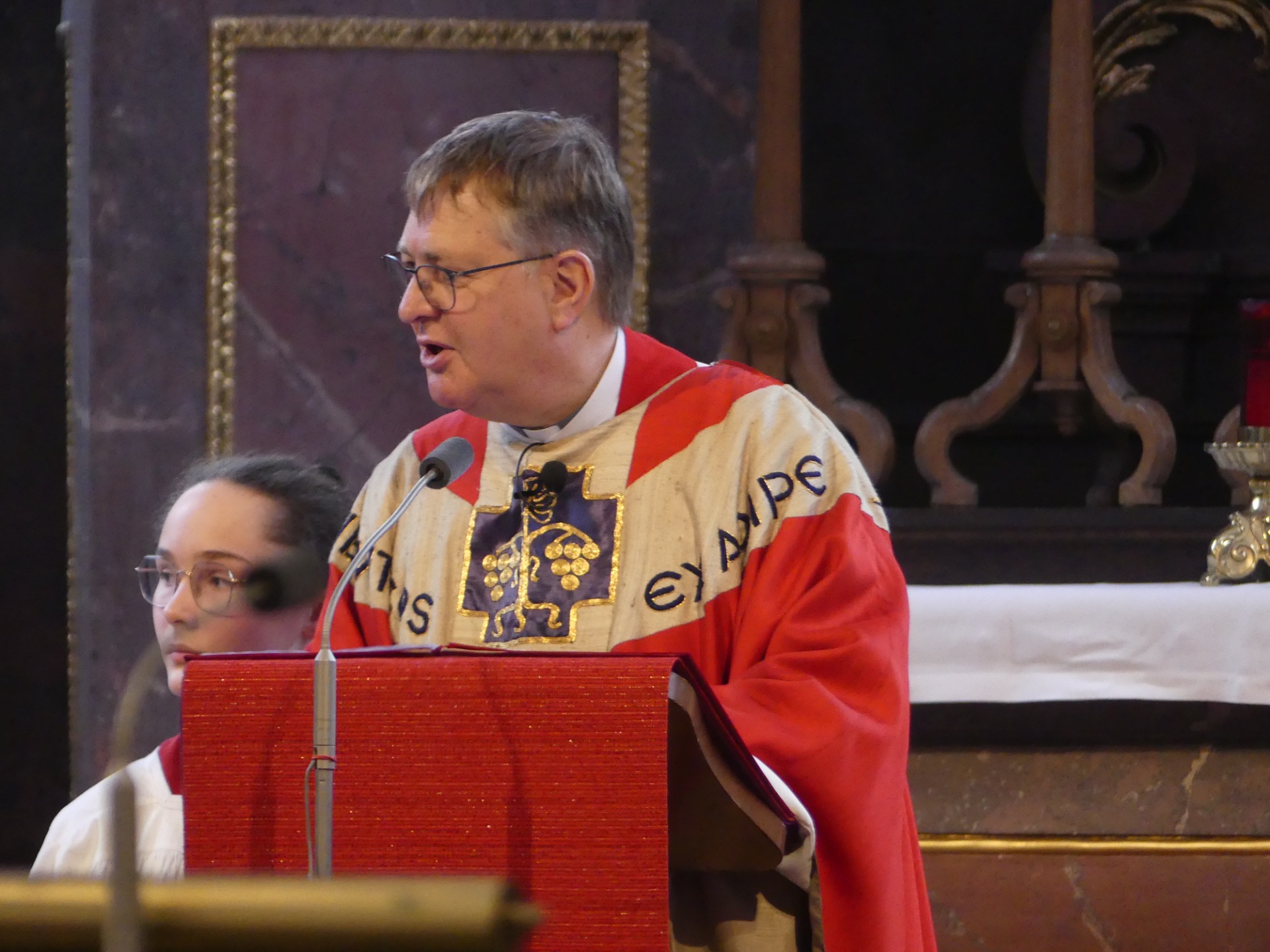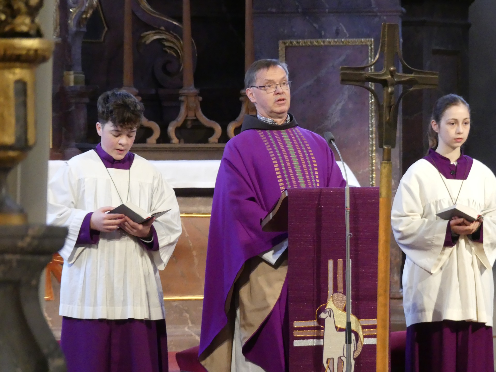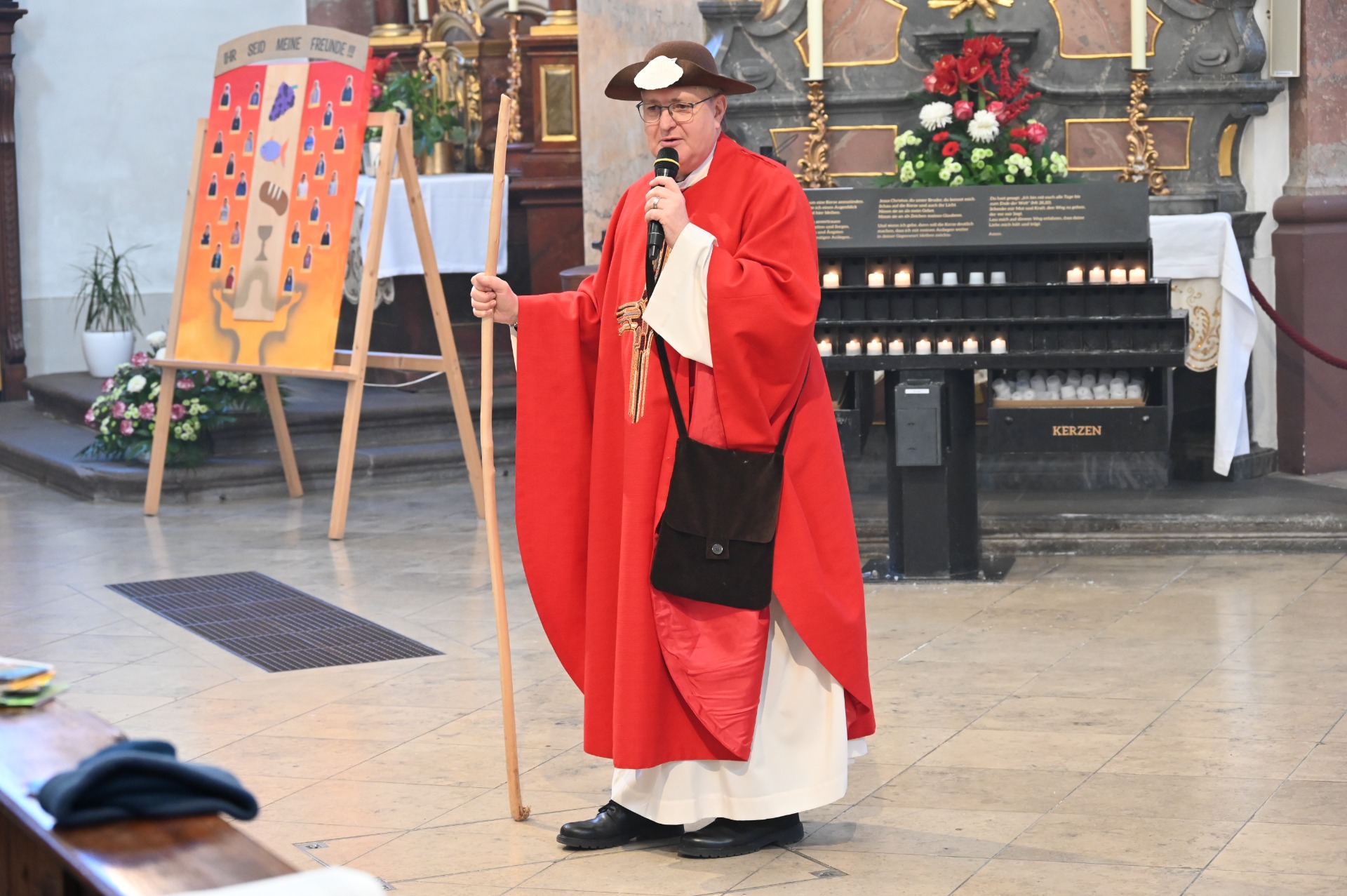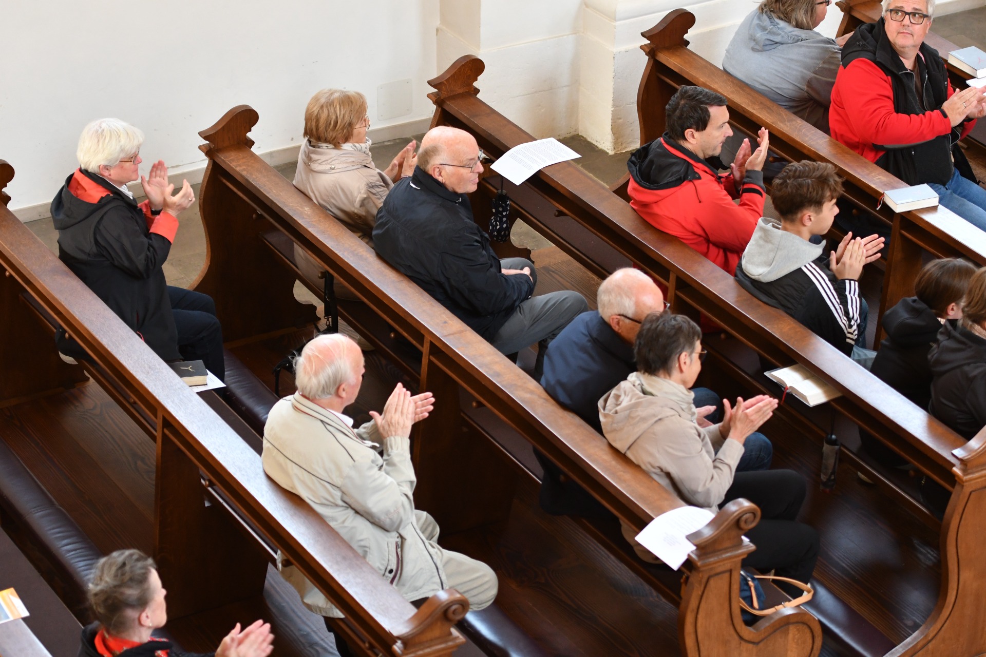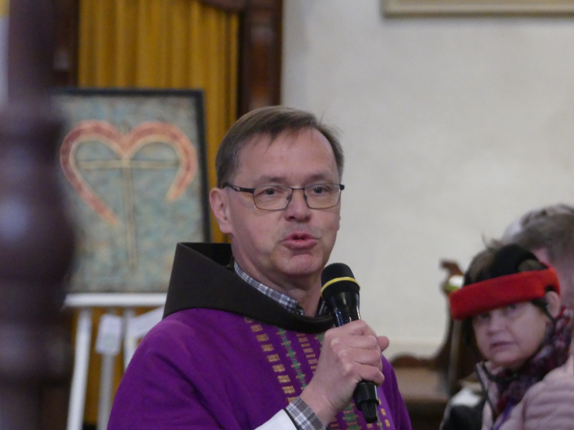 Heute am Fastnachtssonntag bestimmte das Thema Freude auch den Gottesdienst. Besondere Gäste konnte Stadtpfarrer Stefan Buß begrüßen. Die Gruppe aus Dokkum und aus Como, den beiden Partnerstädten Fuldas. Seine Predigt brachte Stadtpfarrer Buß wie es sich gehört in Reimform. Eine Sängerin aus der Gruppe von Como brachte einen Gesangsbeitrag und eine Fürbitte wurde in italenischer und eine in niederländischer Sprache gebetet.