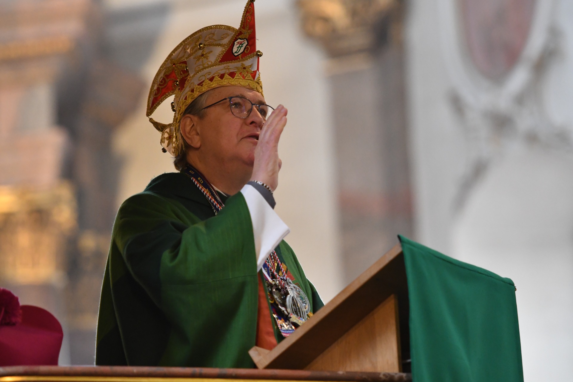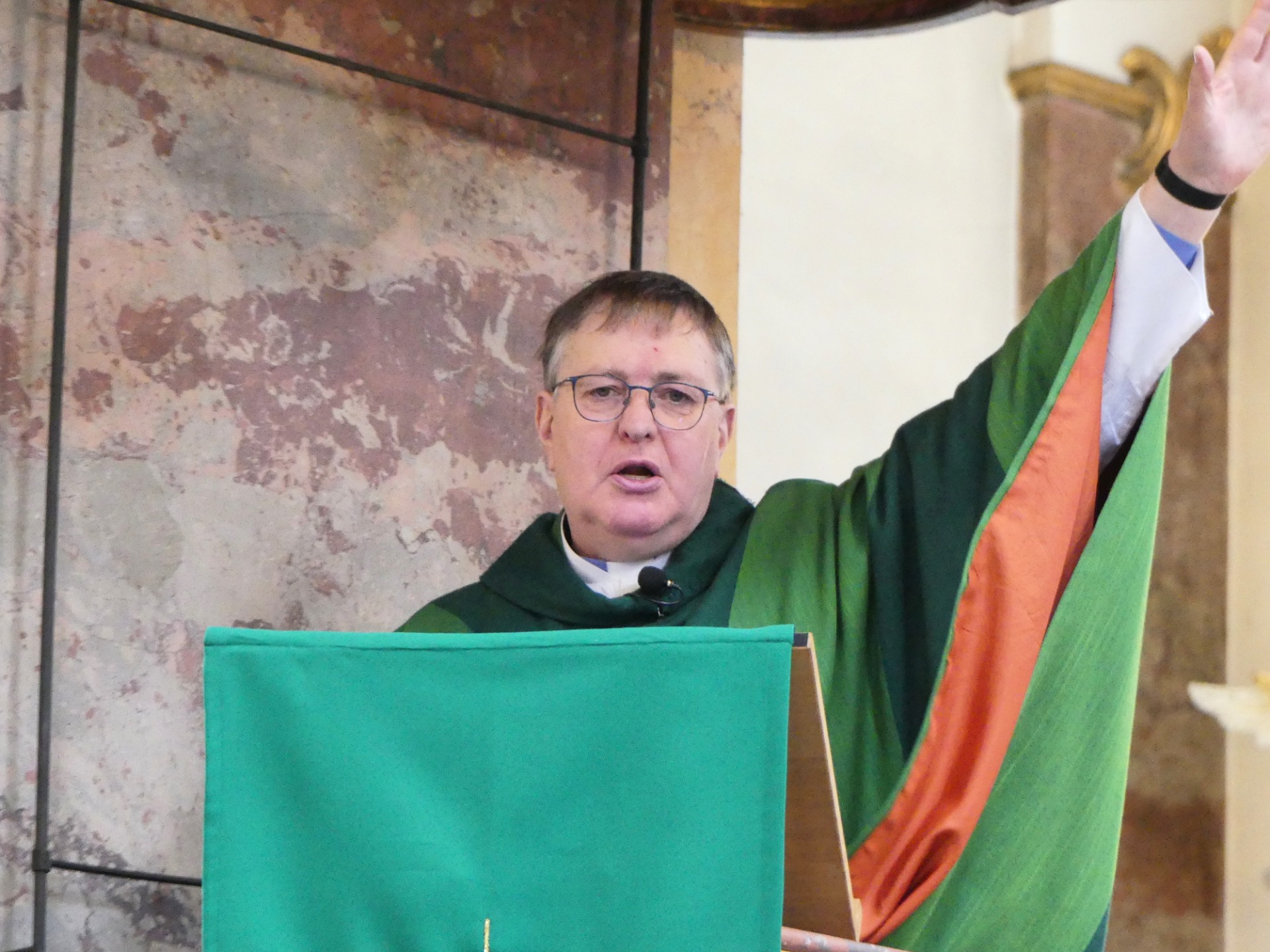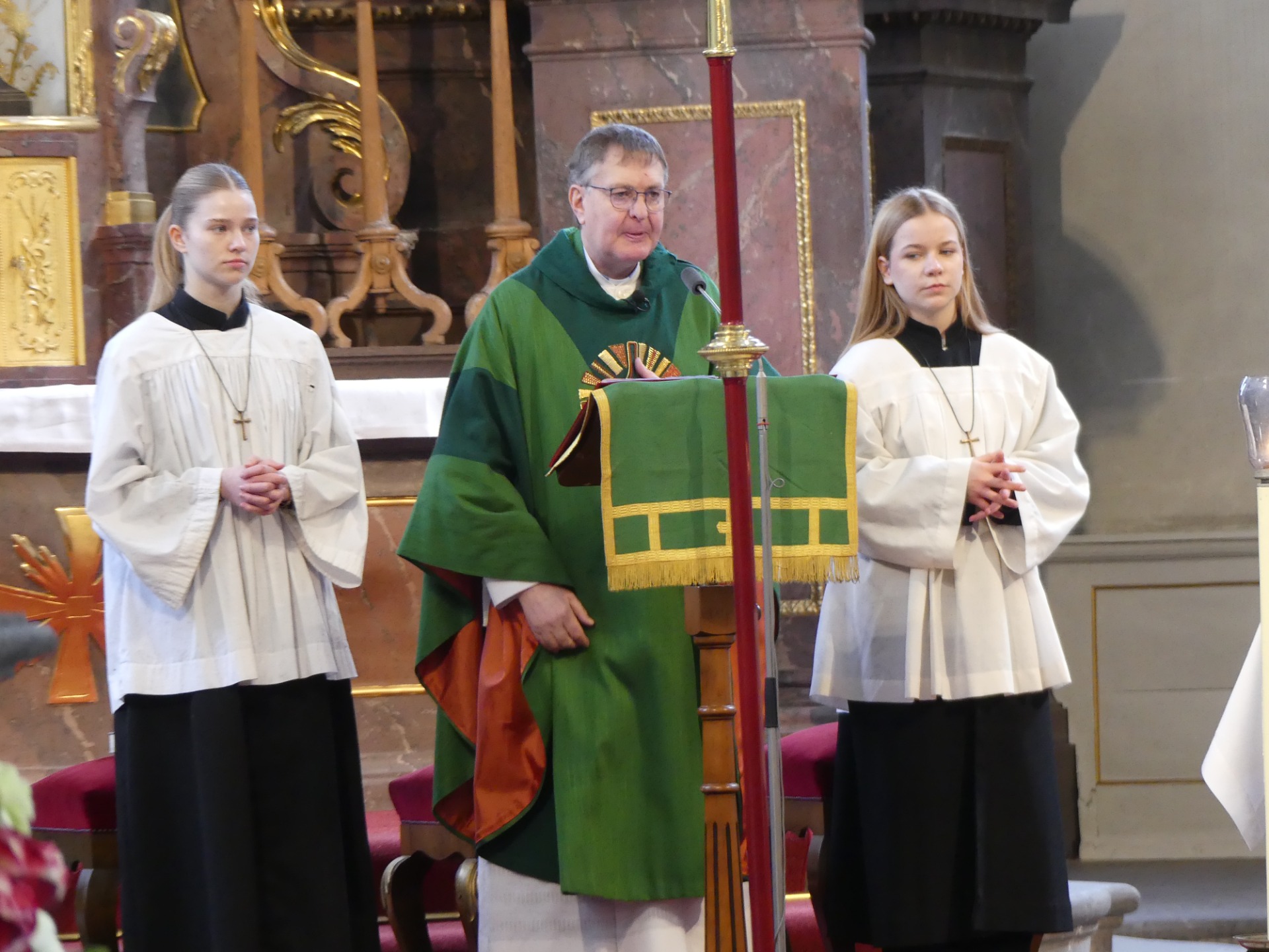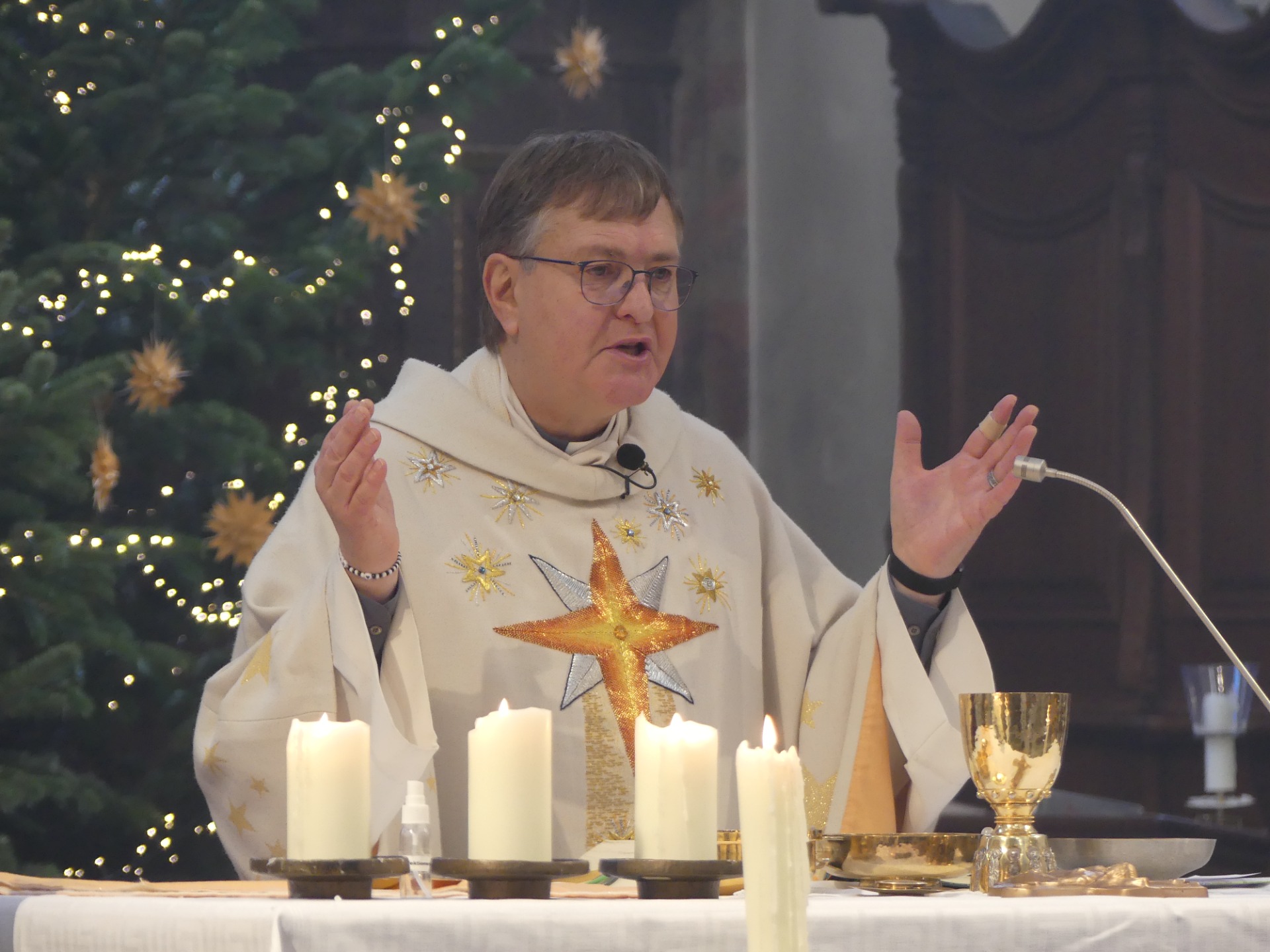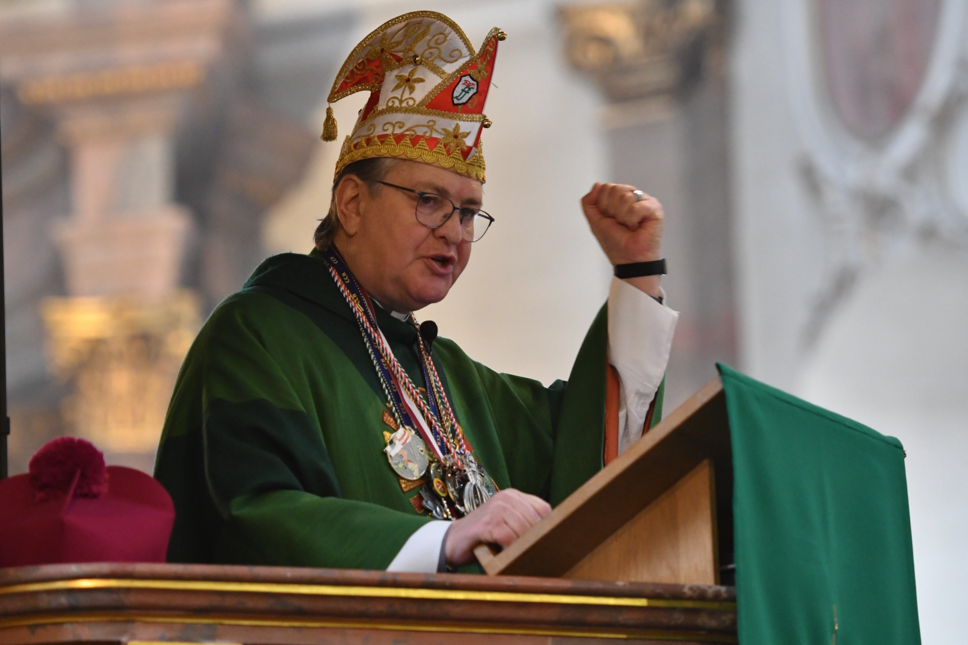 Heute am Fastnachtssonntag bestimmte das Thema Freude auch den Gottesdienst. Besondere Gäste konnte Stadtpfarrer Stefan Buß begrüßen. Die Gruppe aus Dokkum und aus Como, den beiden Partnerstädten Fuldas. Seine Predigt brachte Stadtpfarrer Buß wie es sich gehört in Reimform. Eine Sängerin aus der Gruppe von Como brachte einen Gesangsbeitrag und eine Fürbitte wurde in italenischer und eine in niederländischer Sprache gebetet.
