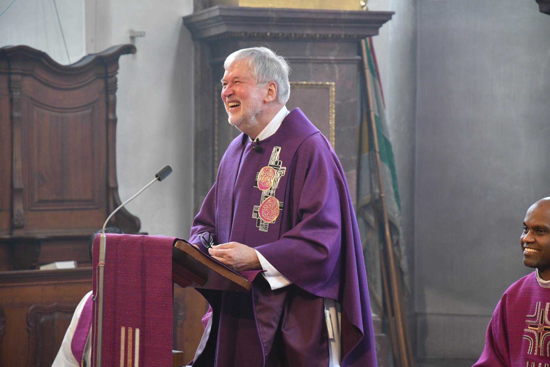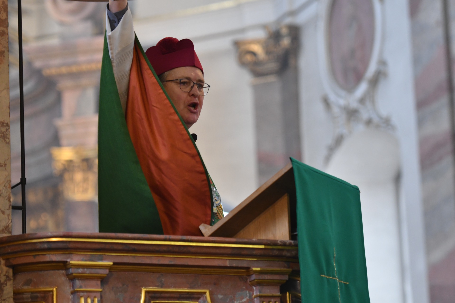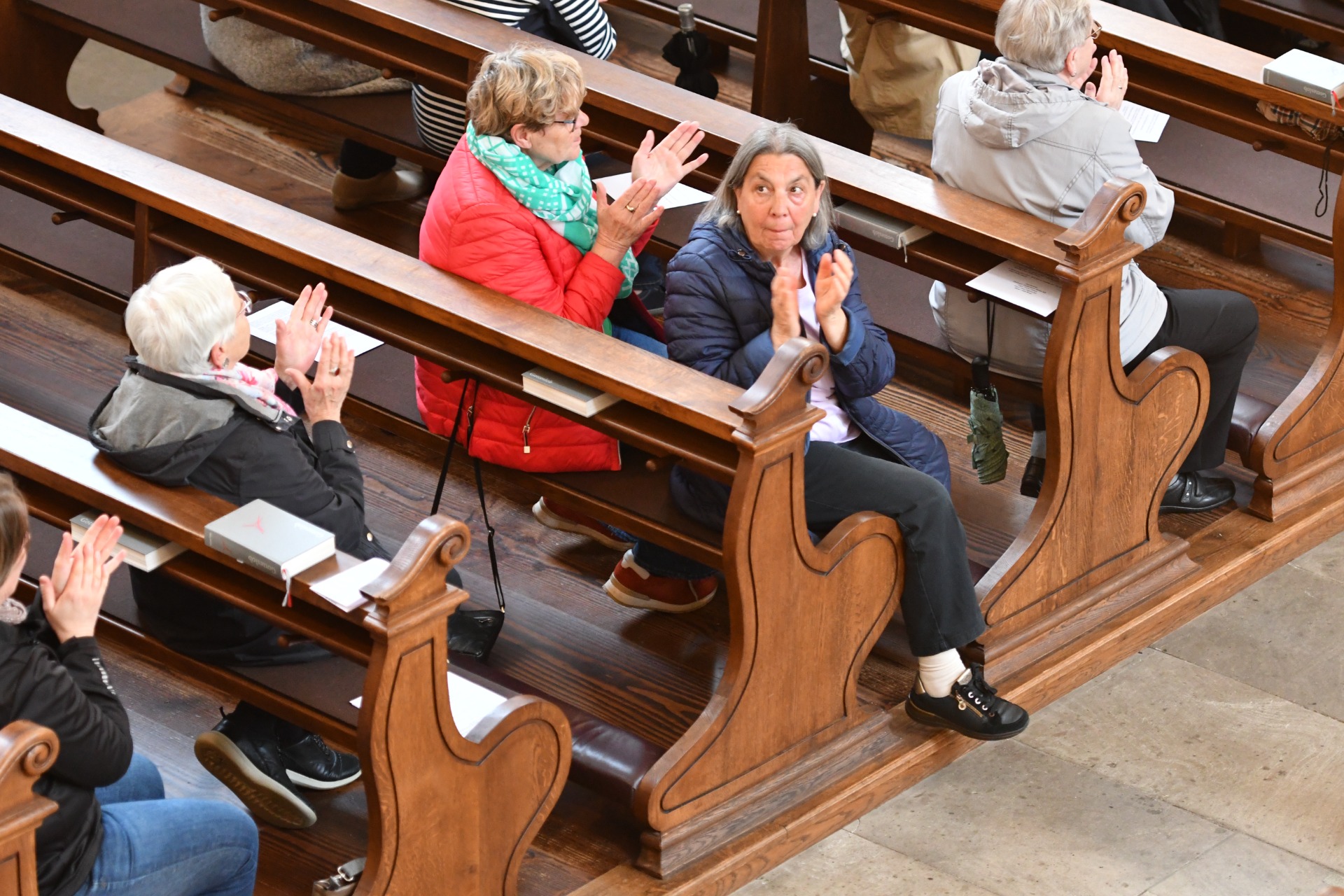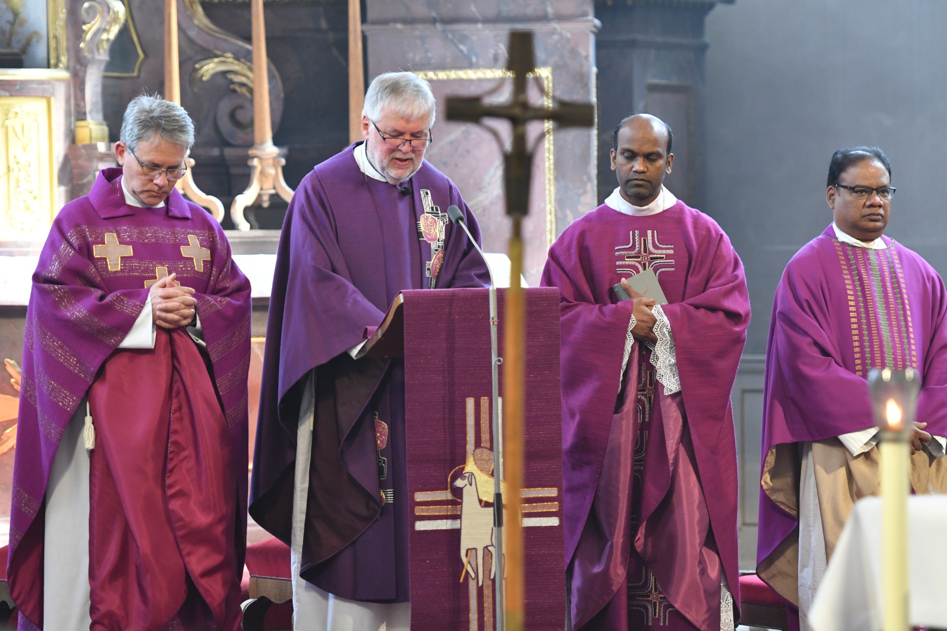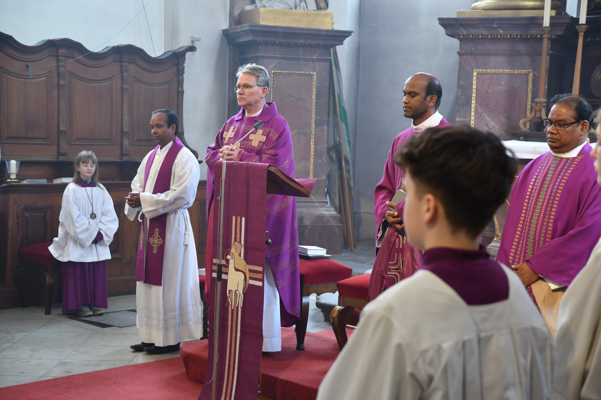 Heute am Fastnachtssonntag bestimmte das Thema Freude auch den Gottesdienst. Besondere Gäste konnte Stadtpfarrer Stefan Buß begrüßen. Die Gruppe aus Dokkum und aus Como, den beiden Partnerstädten Fuldas. Seine Predigt brachte Stadtpfarrer Buß wie es sich gehört in Reimform. Eine Sängerin aus der Gruppe von Como brachte einen Gesangsbeitrag und eine Fürbitte wurde in italenischer und eine in niederländischer Sprache gebetet.