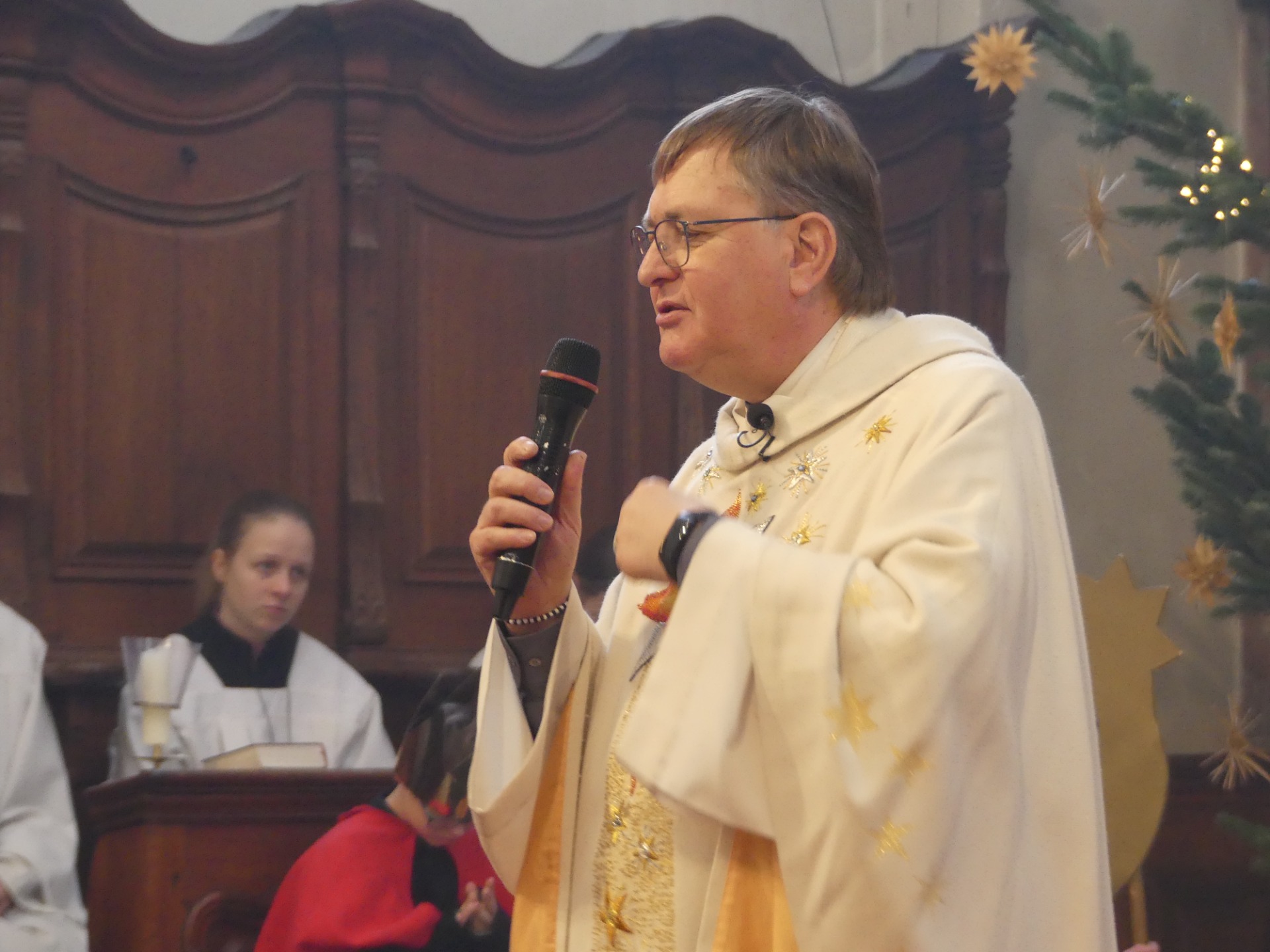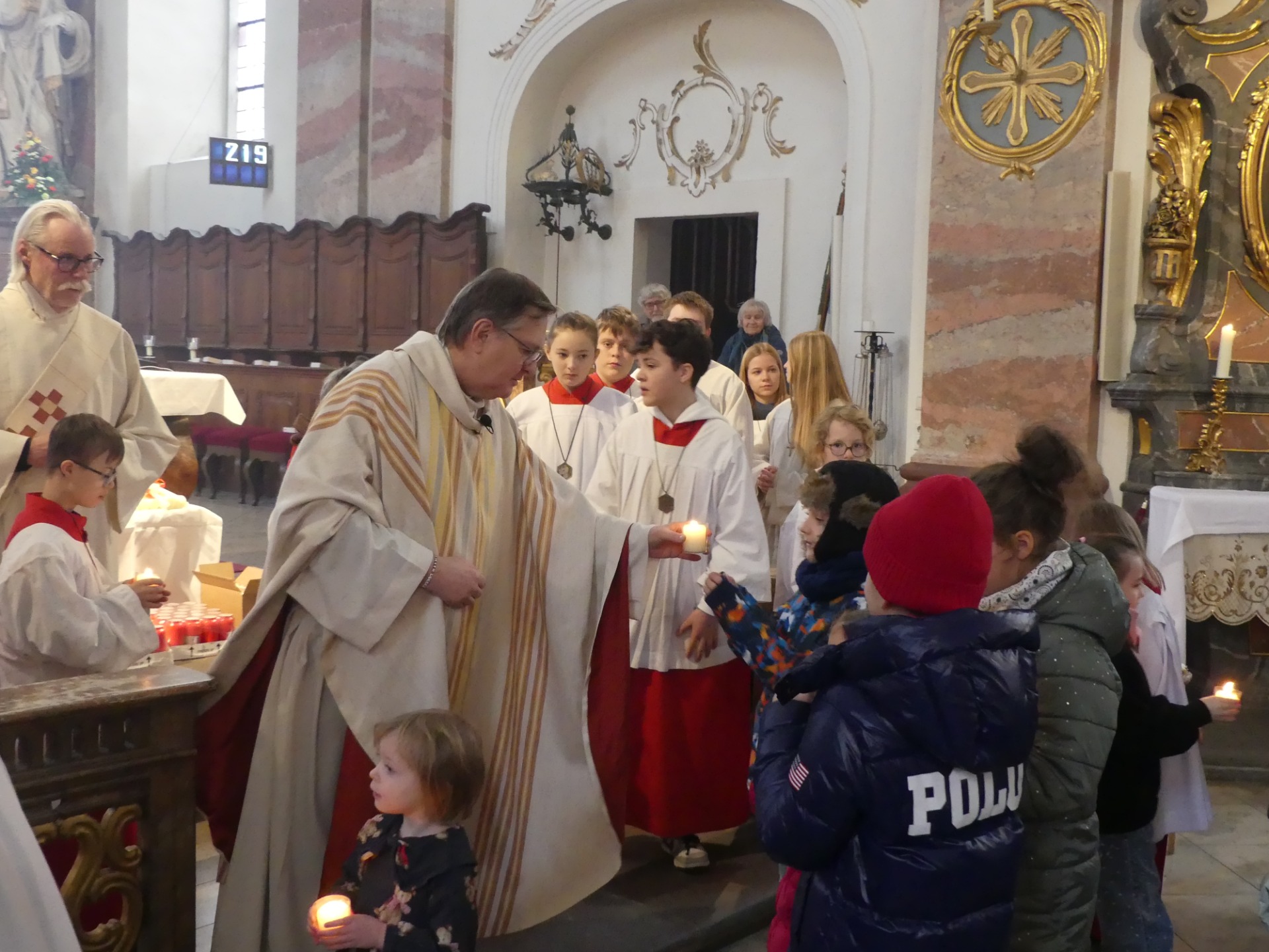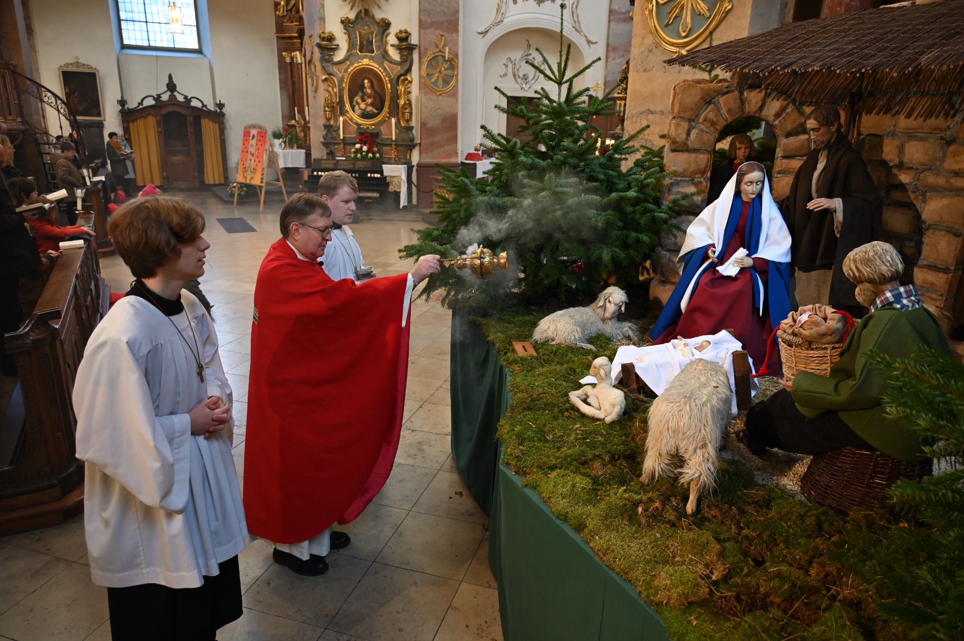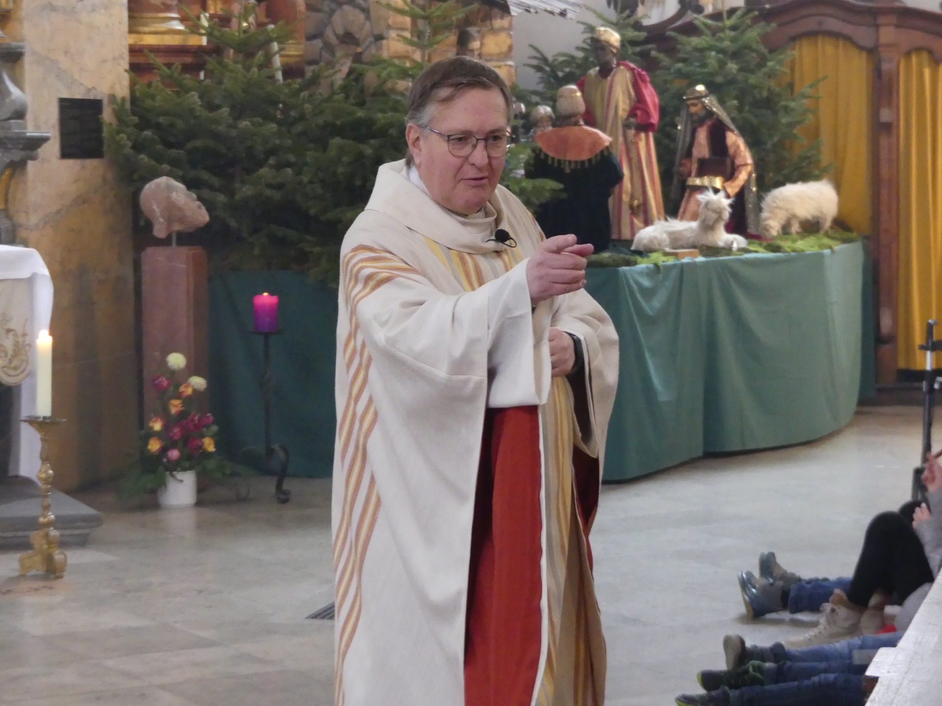 . Der Pilger der Hoffnung ist in Betlehem angekommen und bringt seine Geschenke mit den Kindern zur Krippe. Es sind das Herz, die Liebe, gute Taten, aber auch Fragen, Ängste und Wunden. Alles können wir beim göttlichen Kind ablegen. Er nimmt uns so wie wir sind. Der Kinder- und Jugendchor gestaltete unter der Leitung von Johannes Haubs den Gottesdienst.