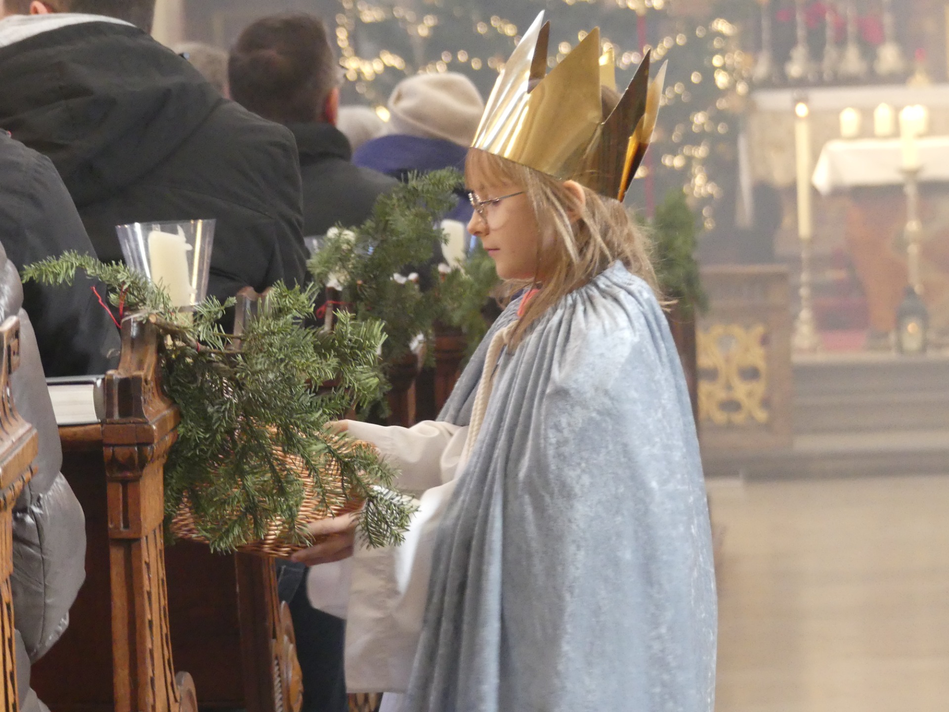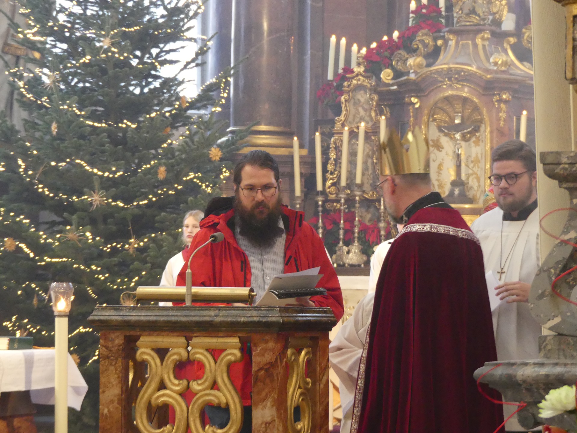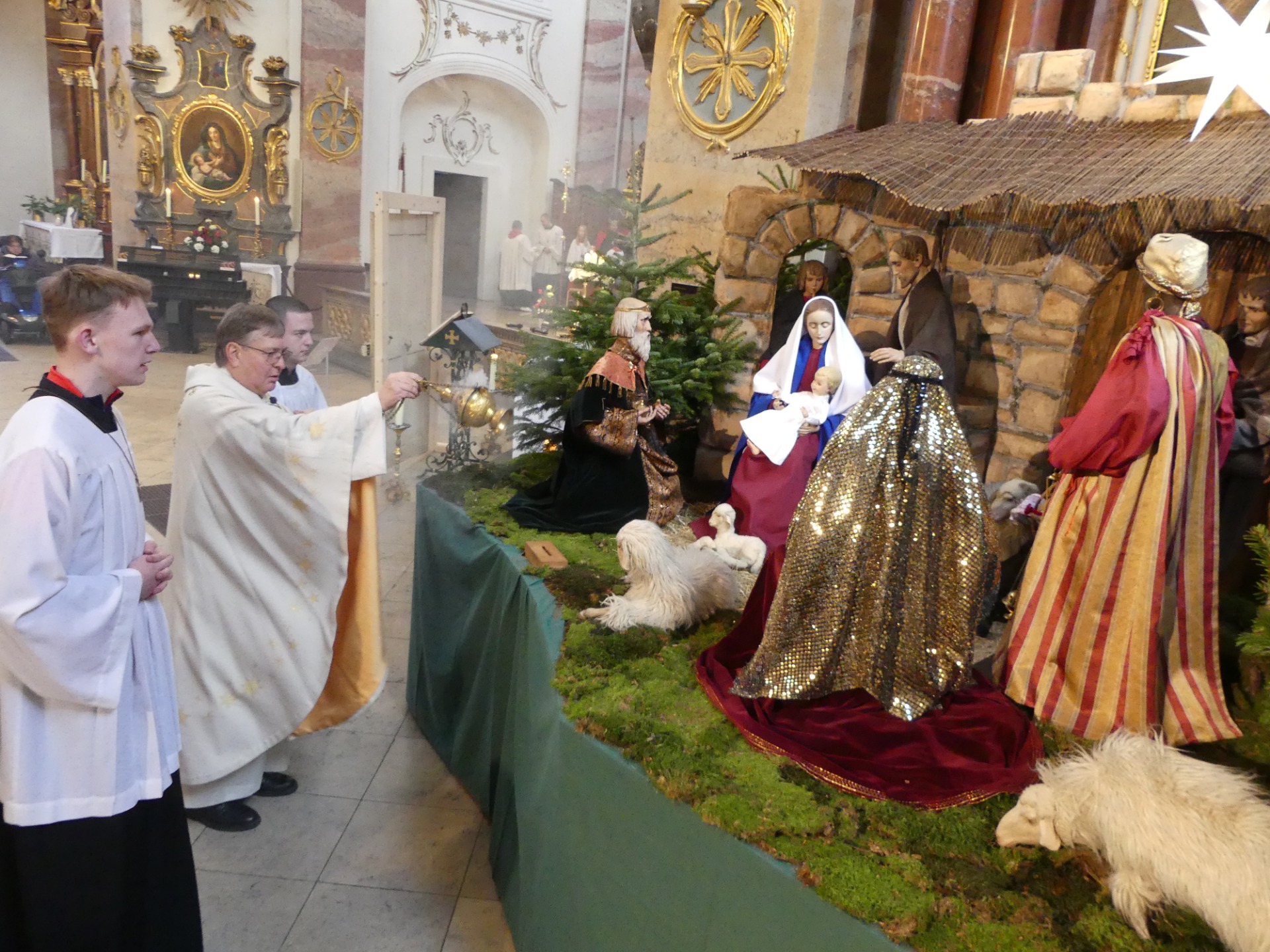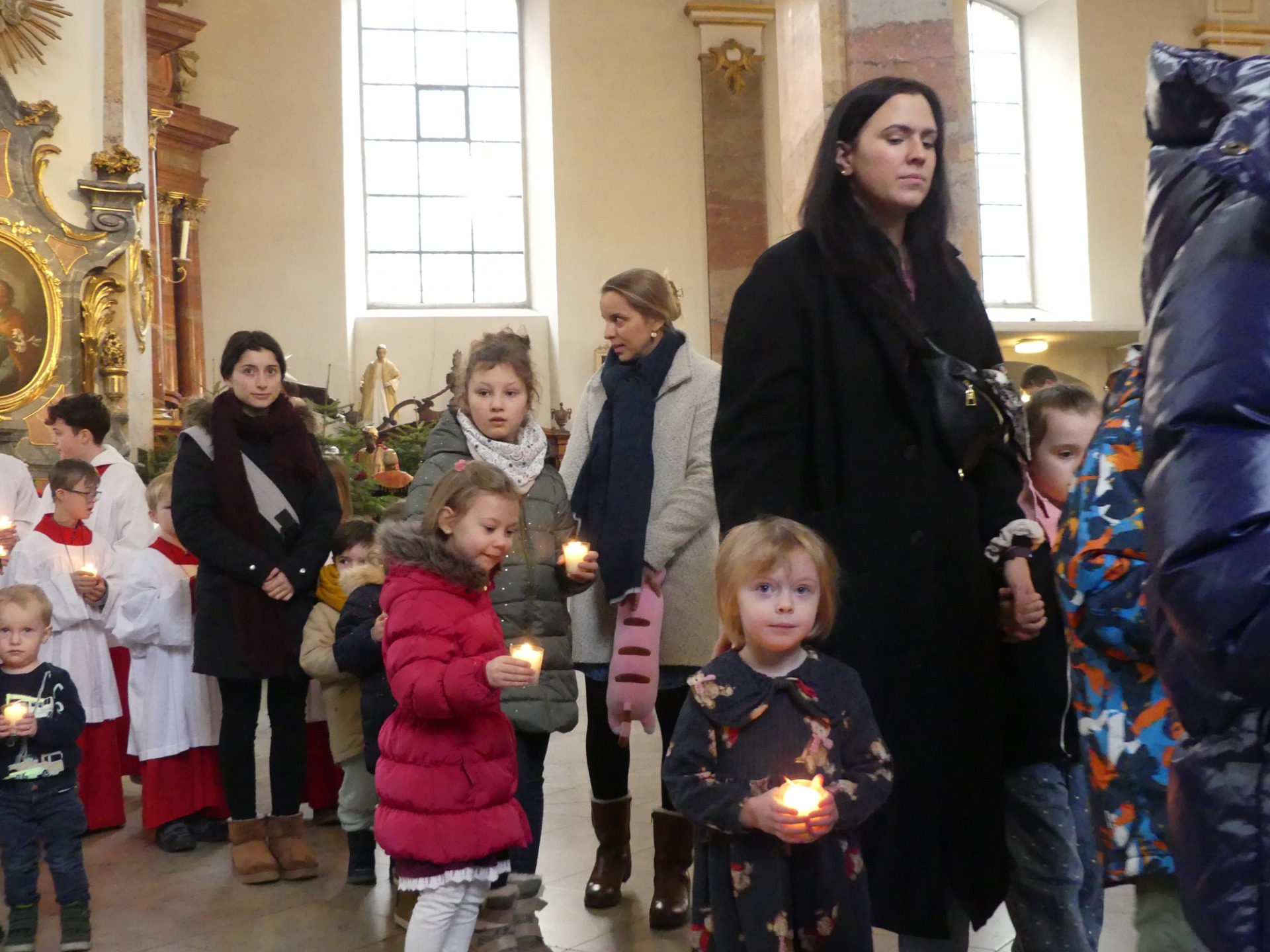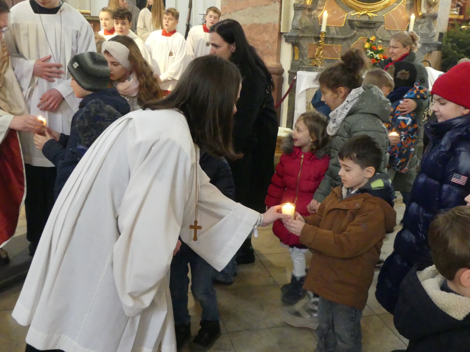 . Der Pilger der Hoffnung ist in Betlehem angekommen und bringt seine Geschenke mit den Kindern zur Krippe. Es sind das Herz, die Liebe, gute Taten, aber auch Fragen, Ängste und Wunden. Alles können wir beim göttlichen Kind ablegen. Er nimmt uns so wie wir sind. Der Kinder- und Jugendchor gestaltete unter der Leitung von Johannes Haubs den Gottesdienst.
