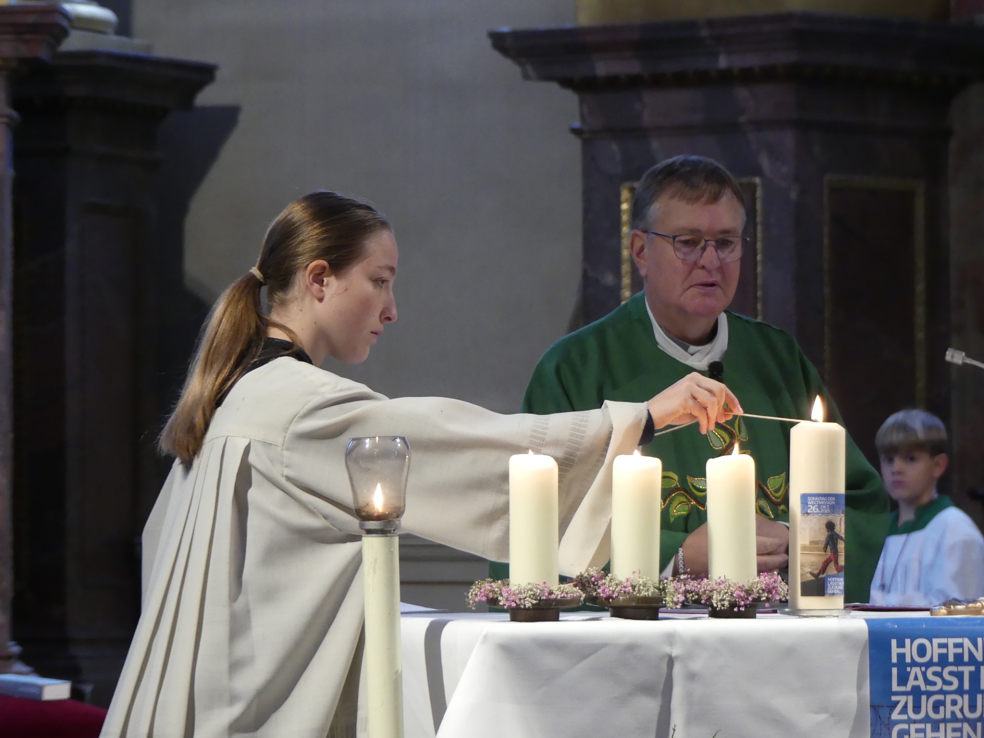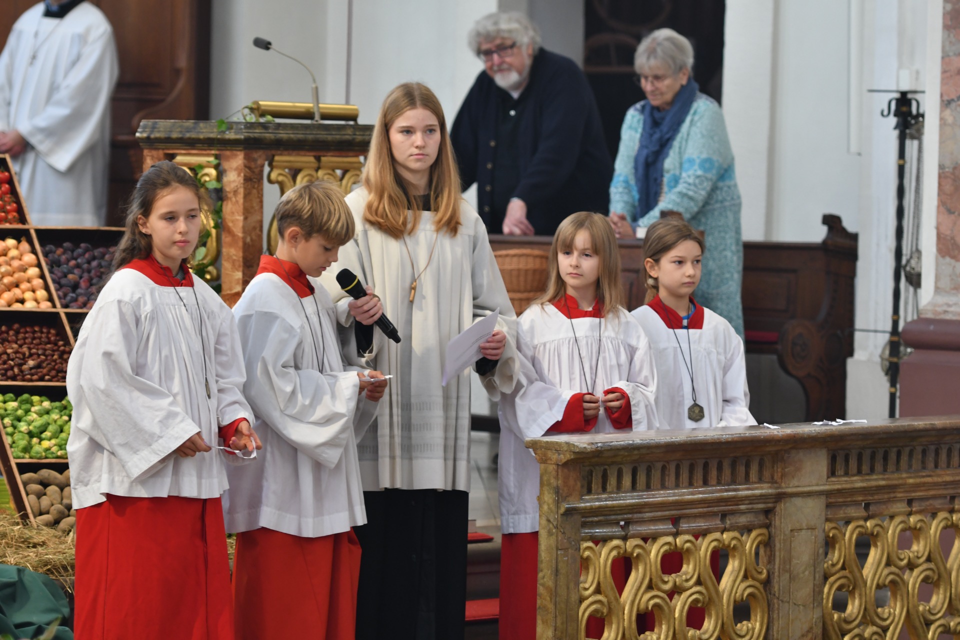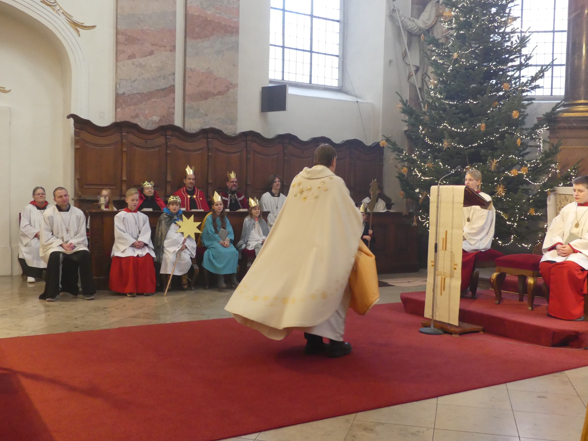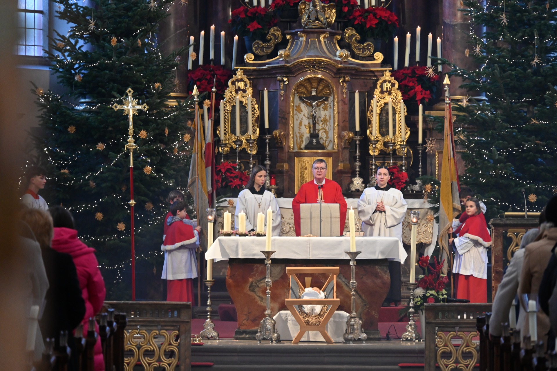 . Der Pilger der Hoffnung ist in Betlehem angekommen und bringt seine Geschenke mit den Kindern zur Krippe. Es sind das Herz, die Liebe, gute Taten, aber auch Fragen, Ängste und Wunden. Alles können wir beim göttlichen Kind ablegen. Er nimmt uns so wie wir sind. Der Kinder- und Jugendchor gestaltete unter der Leitung von Johannes Haubs den Gottesdienst.