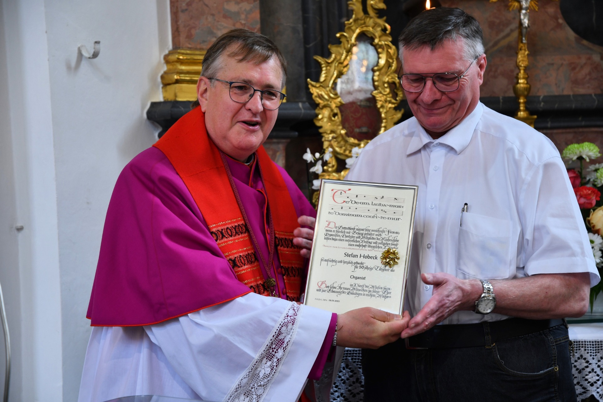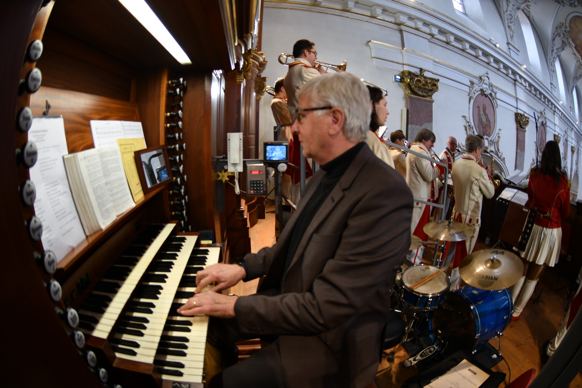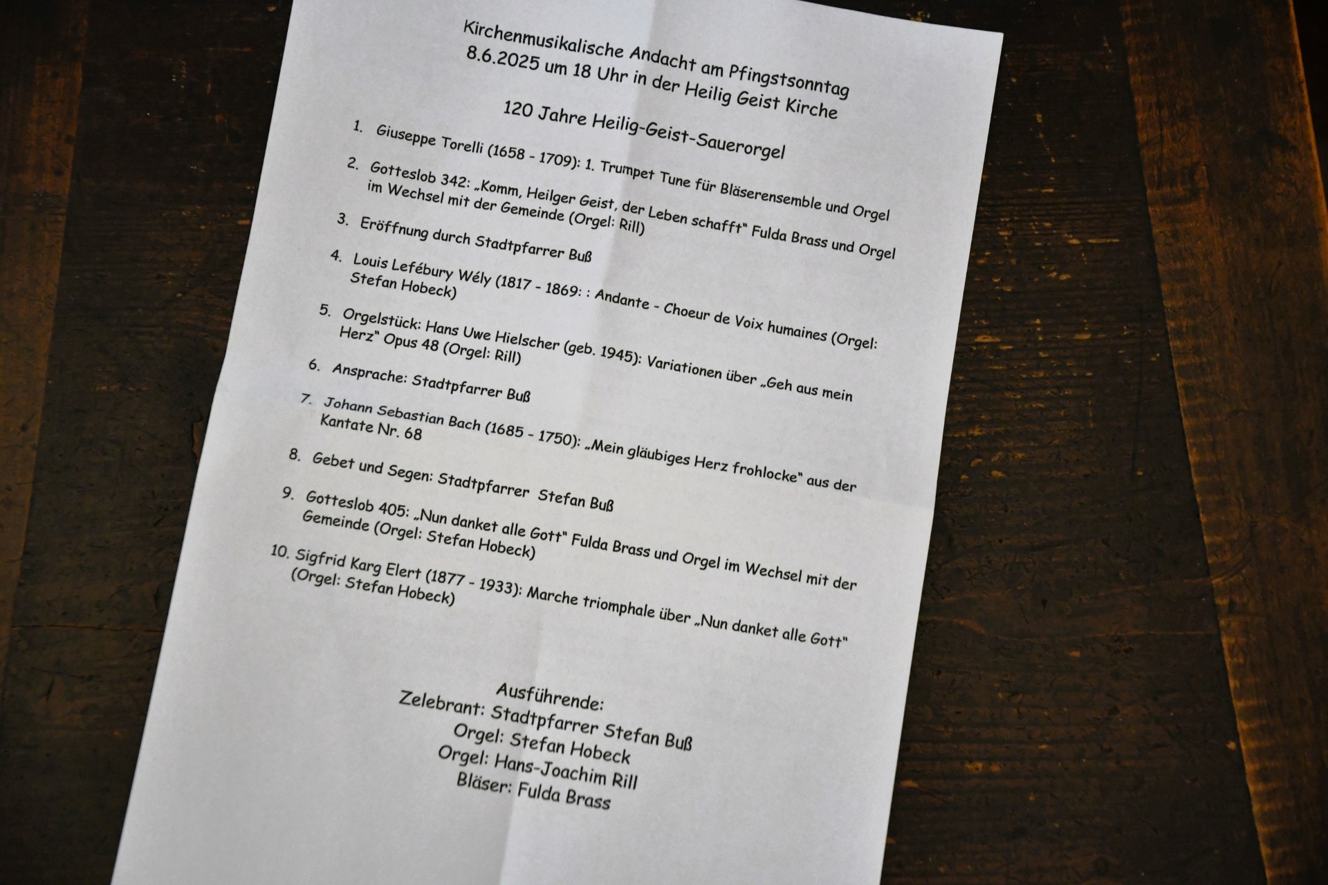 Kirchenmusikalische Andacht in der Hl. Geist Kirche mit Stephan Hobeck und Jochen Rill an der Orgel und den Bläsern von Fulda Brass. 120 Jahre Sauerorgel und Stadtpfarrer Stefan Buß ehrt Organist Stephan Hobeck fr 50 Jahre Organistendienst.
