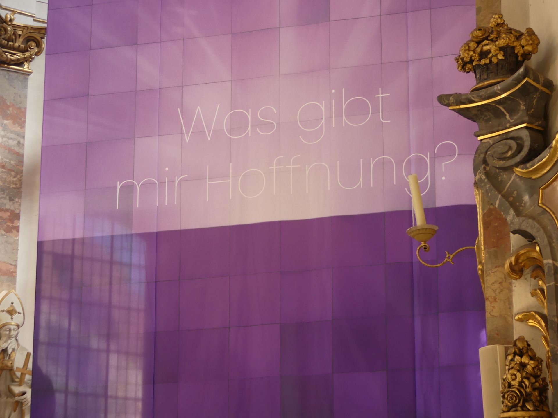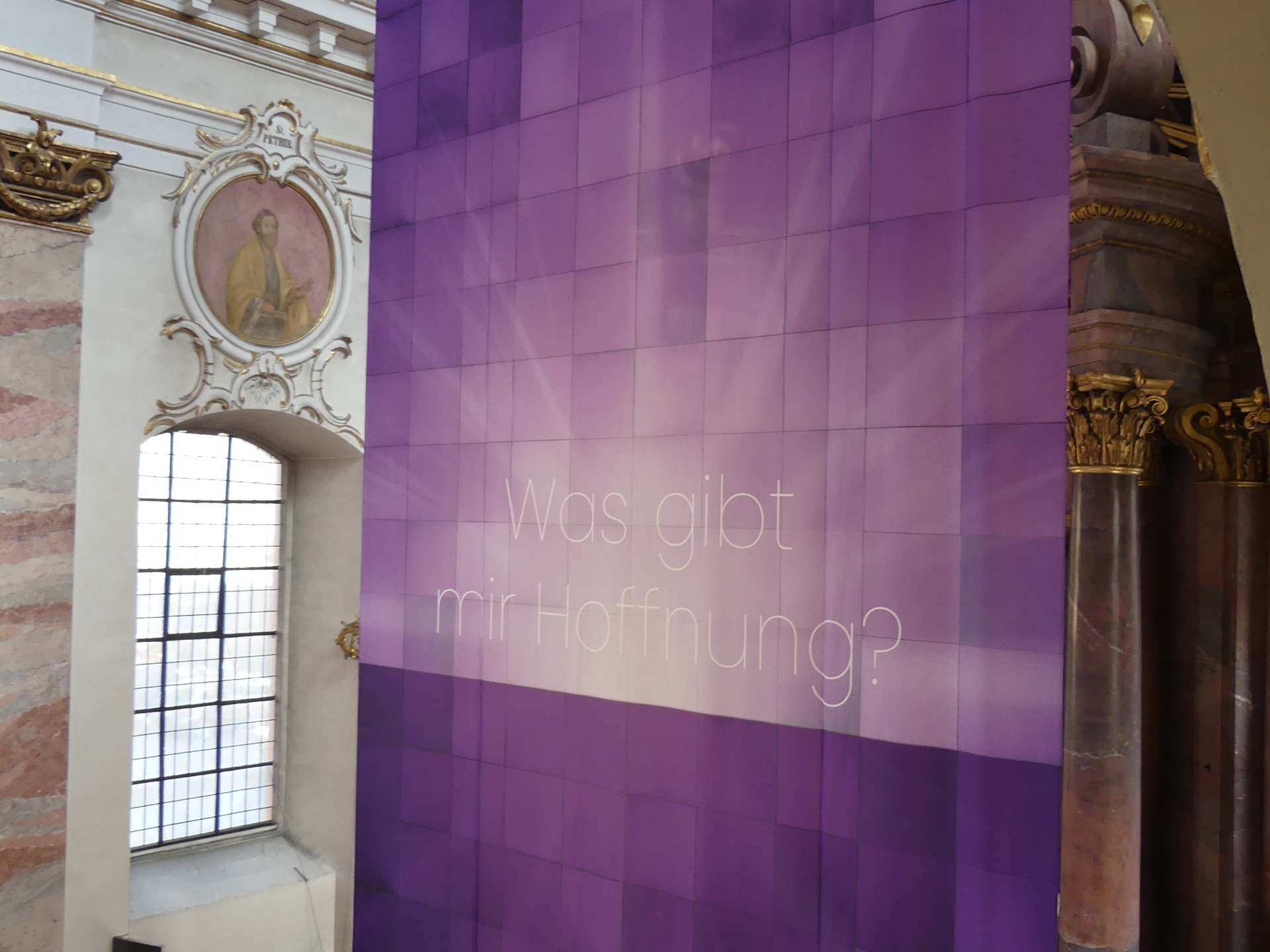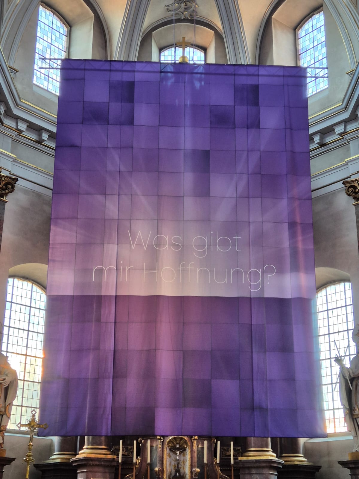 Auch in diesem Jahr ist wieder ein Fastentuch in Kooperation von der kath. Stadtpfarrei, der Citypastoral und Antonius Netzwerk Mensch entstanden. Aus dem Gedanken des Hl. Jahres „Pilger der Hoffnung“ zu dem Papst Franziskus in diesem Jahr einlädt, ist die diesjährige Kernfrage entstanden: Was gibt mir Hoffnung?