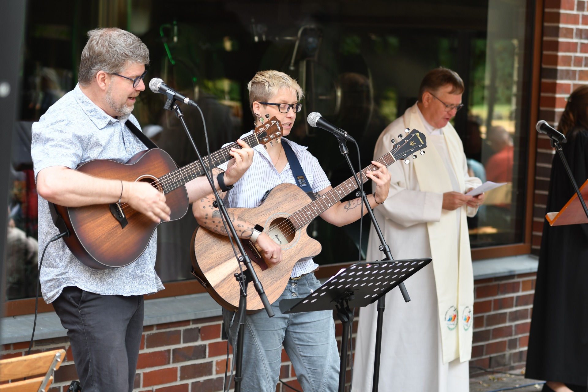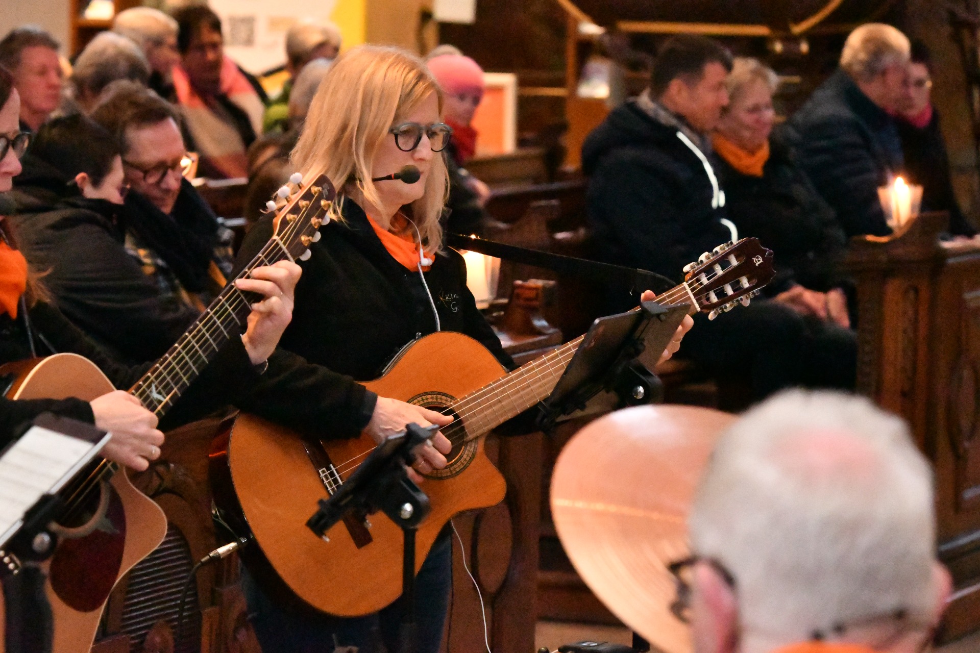 Die musikalische Begleitung des Gottesdienstes hatte die Musikgruppe „Divine Concern“ mit Addy Haas (Akkordeon), Thilo Tschorn (Gitarre) und Diakon Meins Coetsier (Gitarre und Gesang) übernommen. Nach dem Gottesdienst konnten die Teilnehmenden Lichter der Solidarität entzünden. Ann-Katrin Jehn und Marie Josephin Möller machten auf Wunsch mit einer Polaroid-Kamera vor der Caritastür, mit dem Slogan „Caritas öffnet Türen“ Bilder, die mit nachhause genommen werden konnten.
