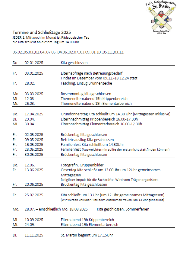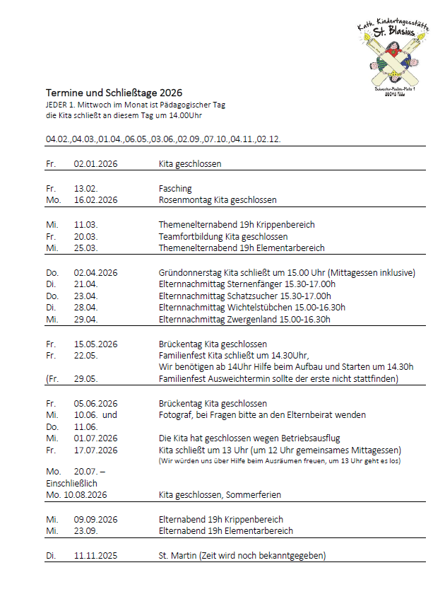 Feste Schließzeiten der Kita sind in jedem Jahr die letzte drei Wochen der Hessischen Sommerferien und die Tage zwischen Weihnachten und Silvester. Alle weiteren Schließtage entnehmen sie bitte dem aktuellen Kalender.