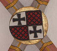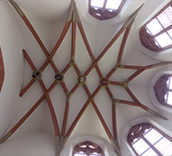 Der Innenraum hat eine flache Holzbalkendecke, der Chor ein Sterngewölbe mit Bienstabprofil der Rippen. Die Schlußsteine zeigen folgende Reliefs und Inschriften: Osterlamm mit Fahne, Gesicht mit Kreuznimbus.